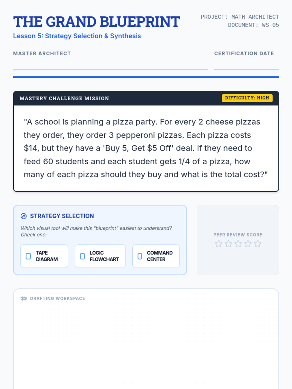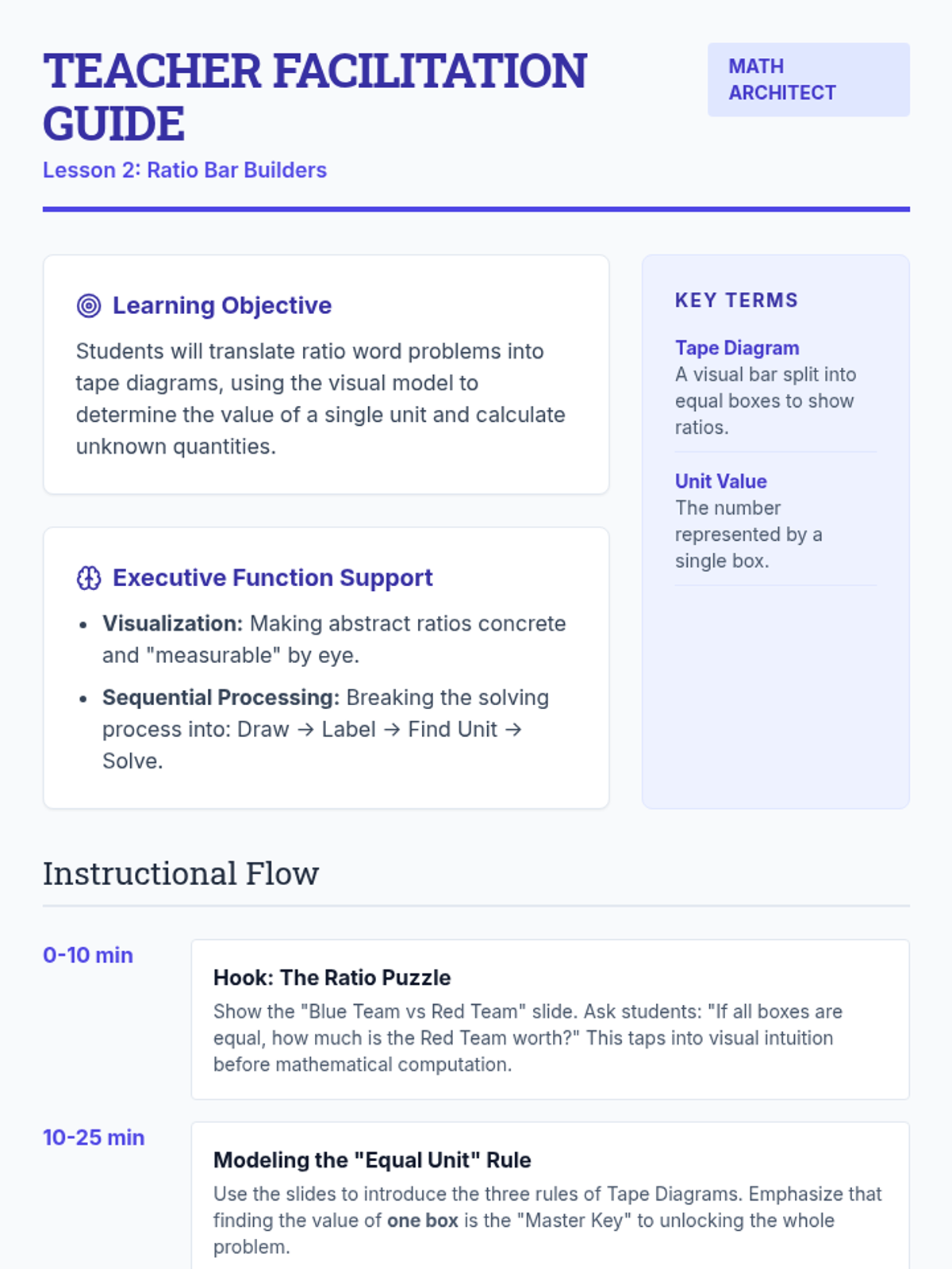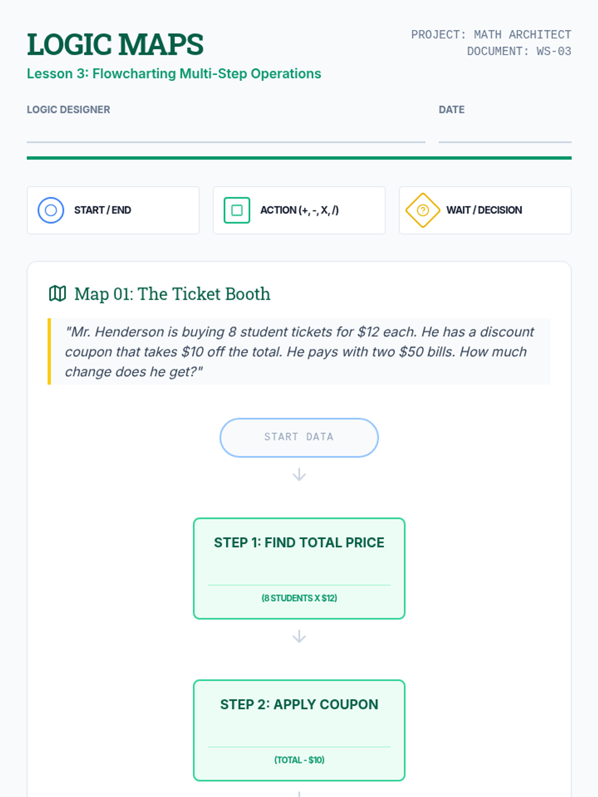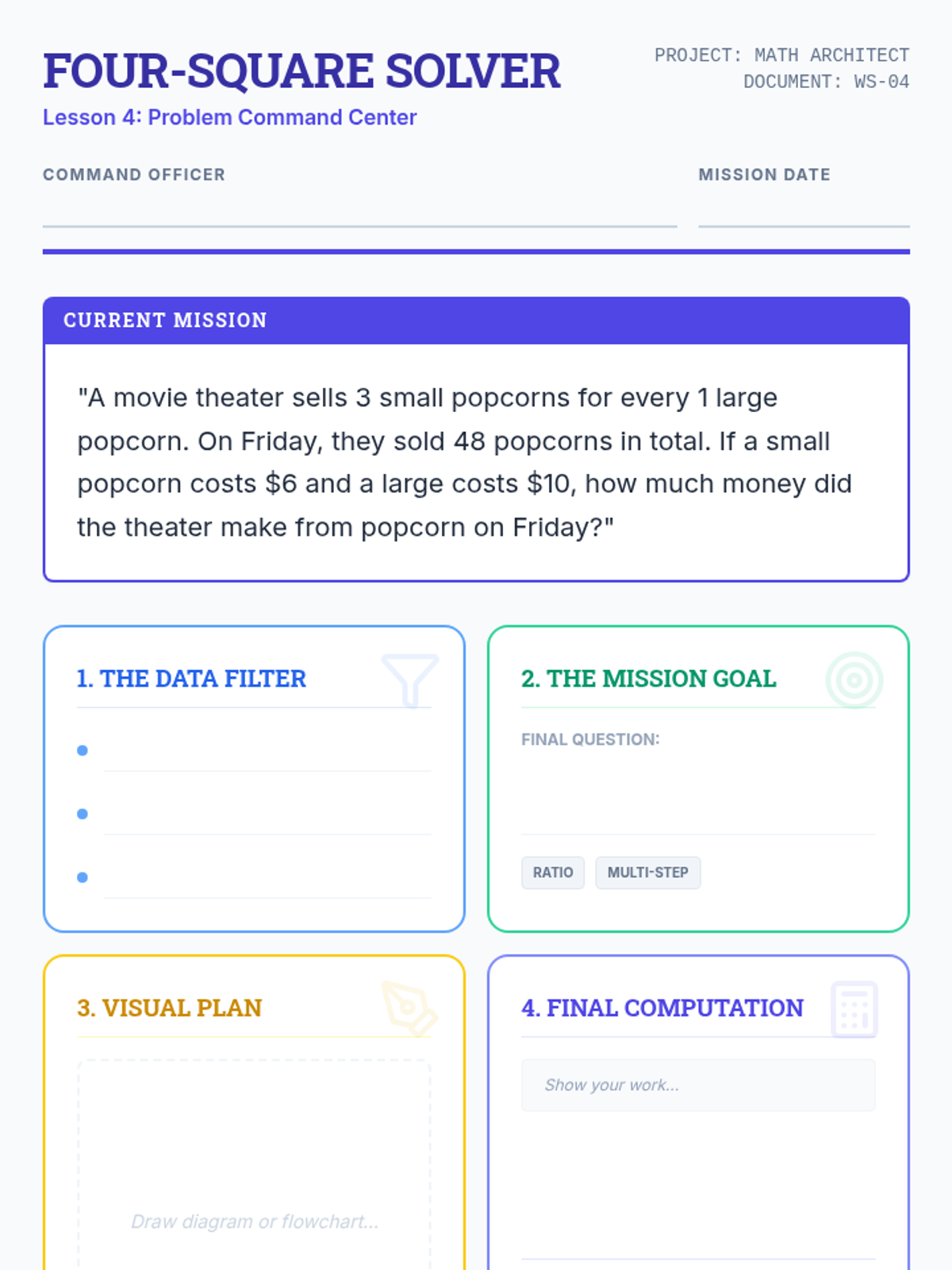A sequence focused on executive function and working memory support for 6th-grade students, teaching them to externalize math thinking through visual modeling, parsing, and flowcharting complex word problems.