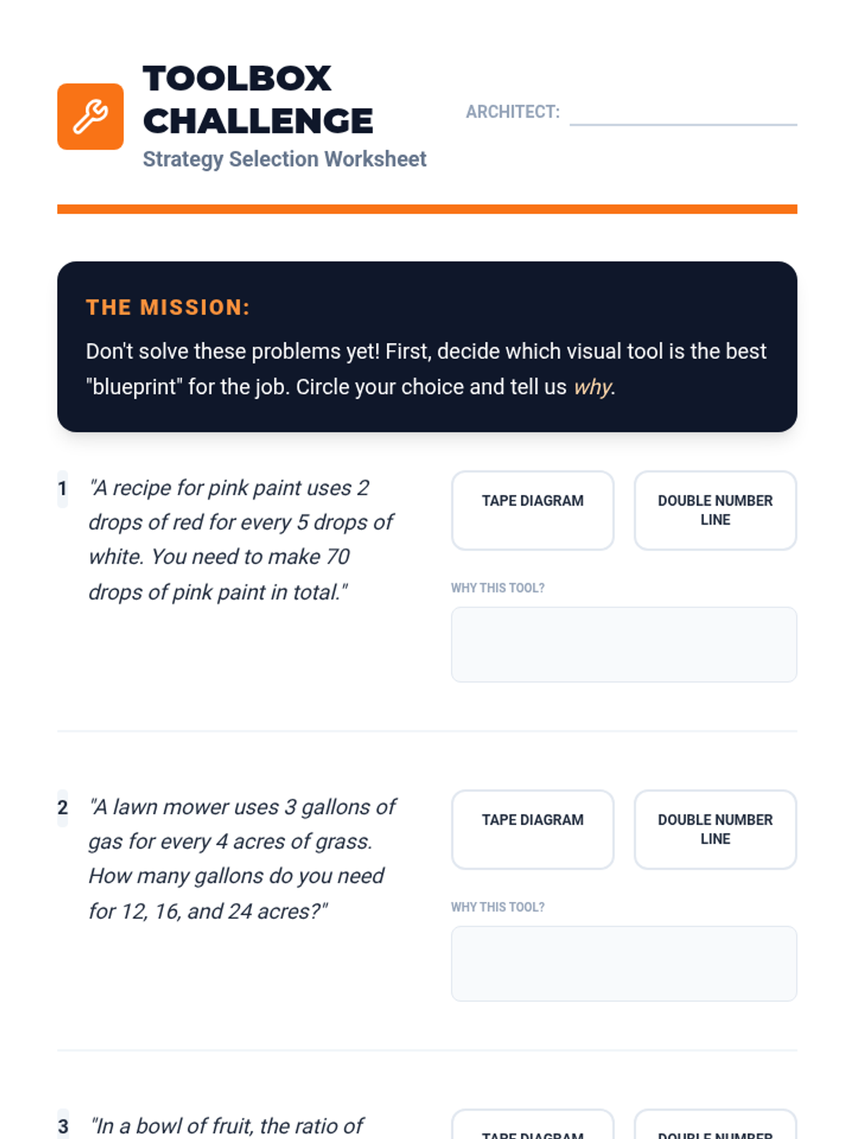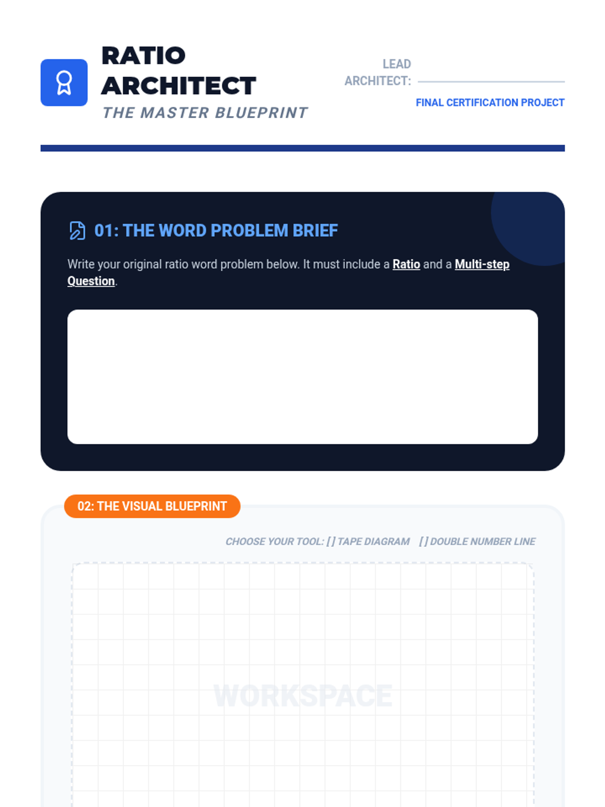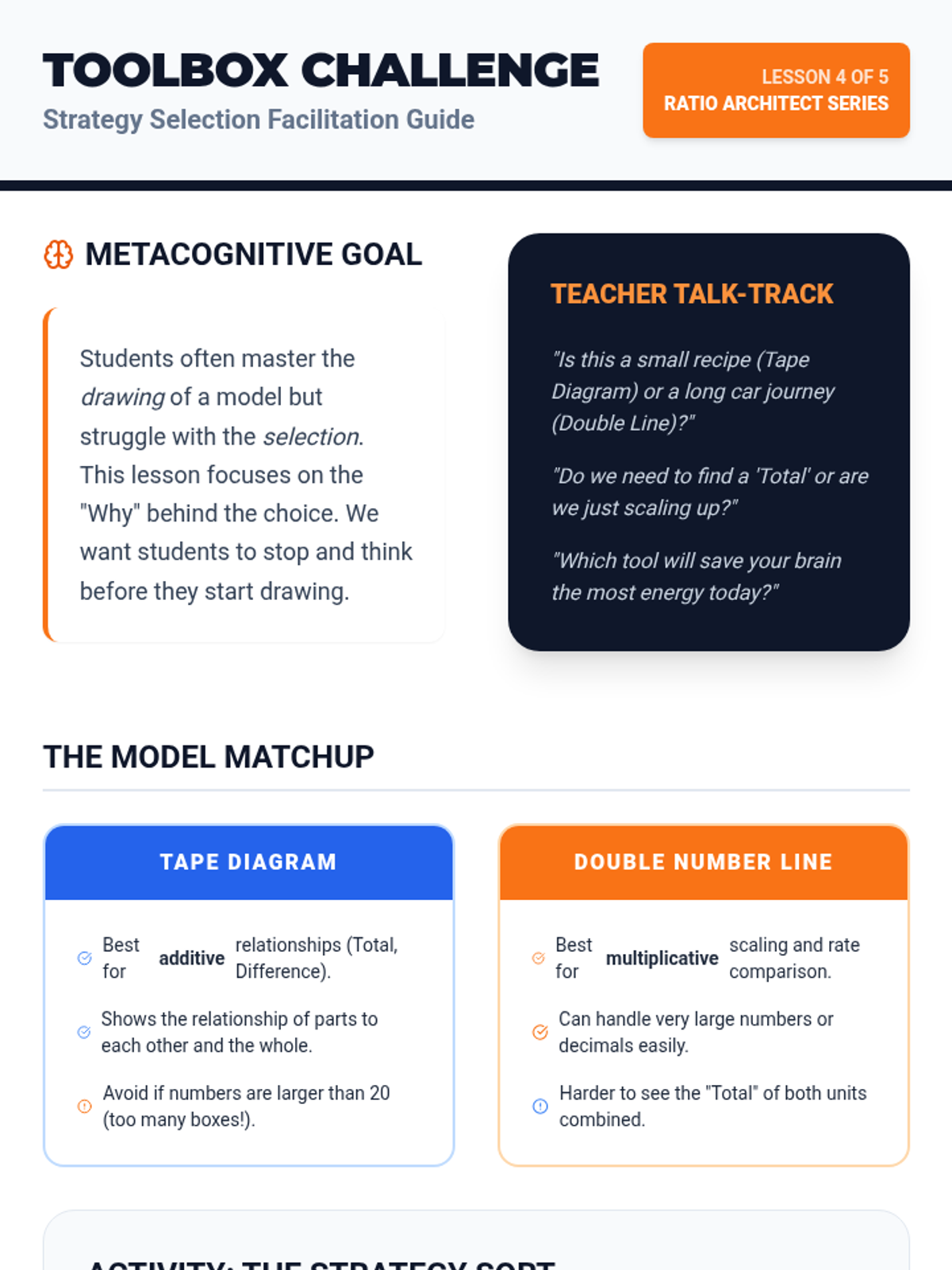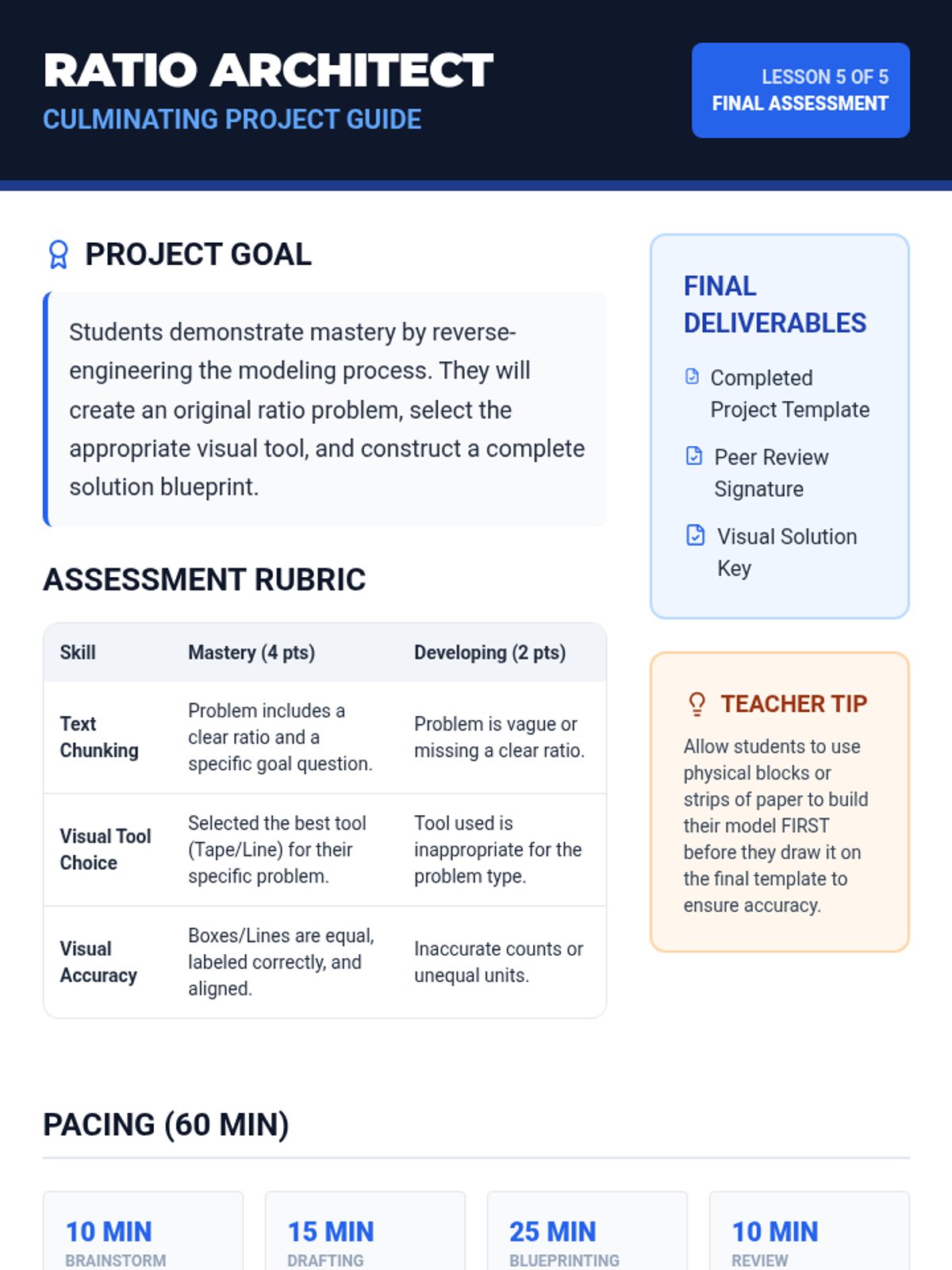 A comprehensive 6th-grade math sequence focused on visual modeling strategies for ratios. Students learn to use tape diagrams and double number lines to decode and solve complex word problems, moving from concrete representation to abstract application.