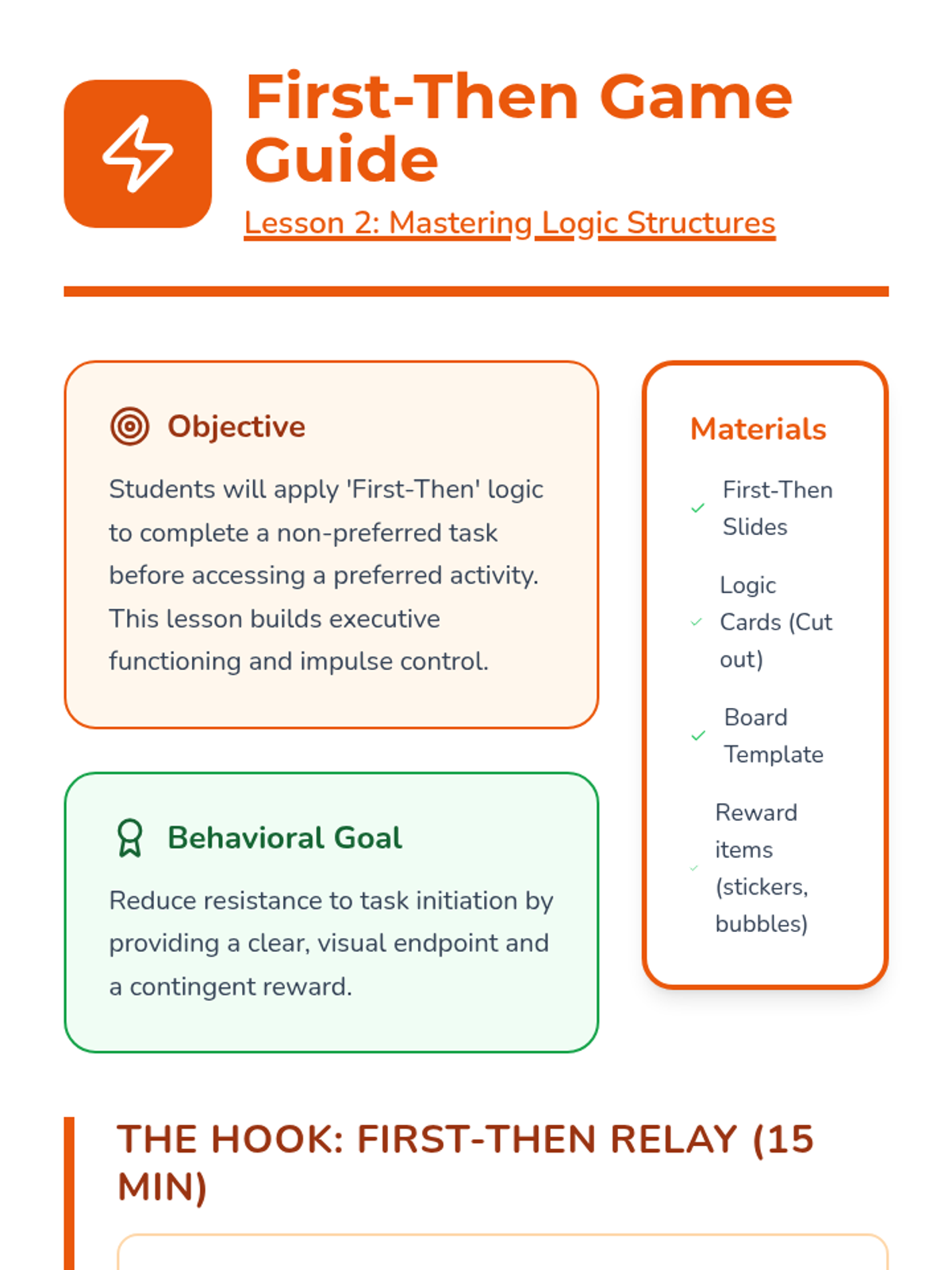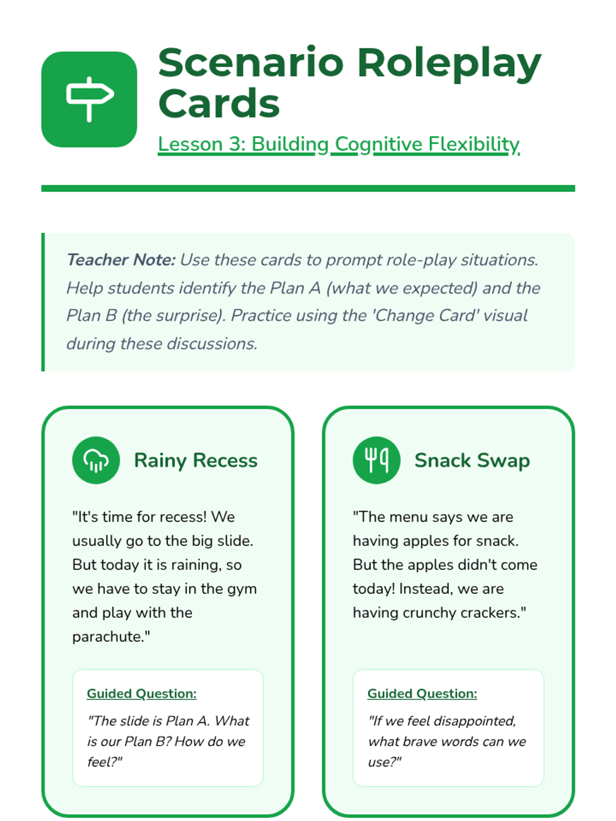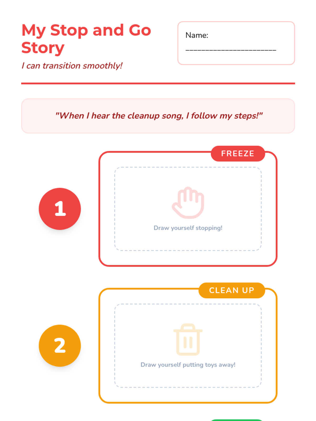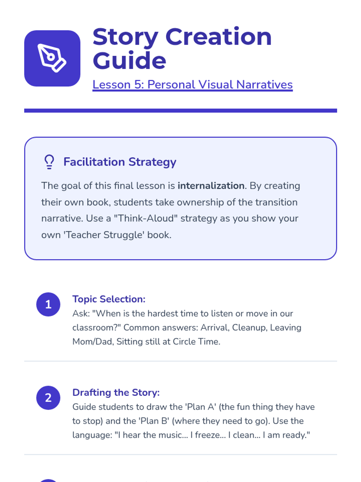This sequence helps Kindergarten students, particularly those requiring positive behavior support, to understand and create visual narratives for classroom transitions. Students learn to use visual schedules, 'First-Then' structures, and personal social stories to navigate changes and routines with confidence and reduced anxiety.
