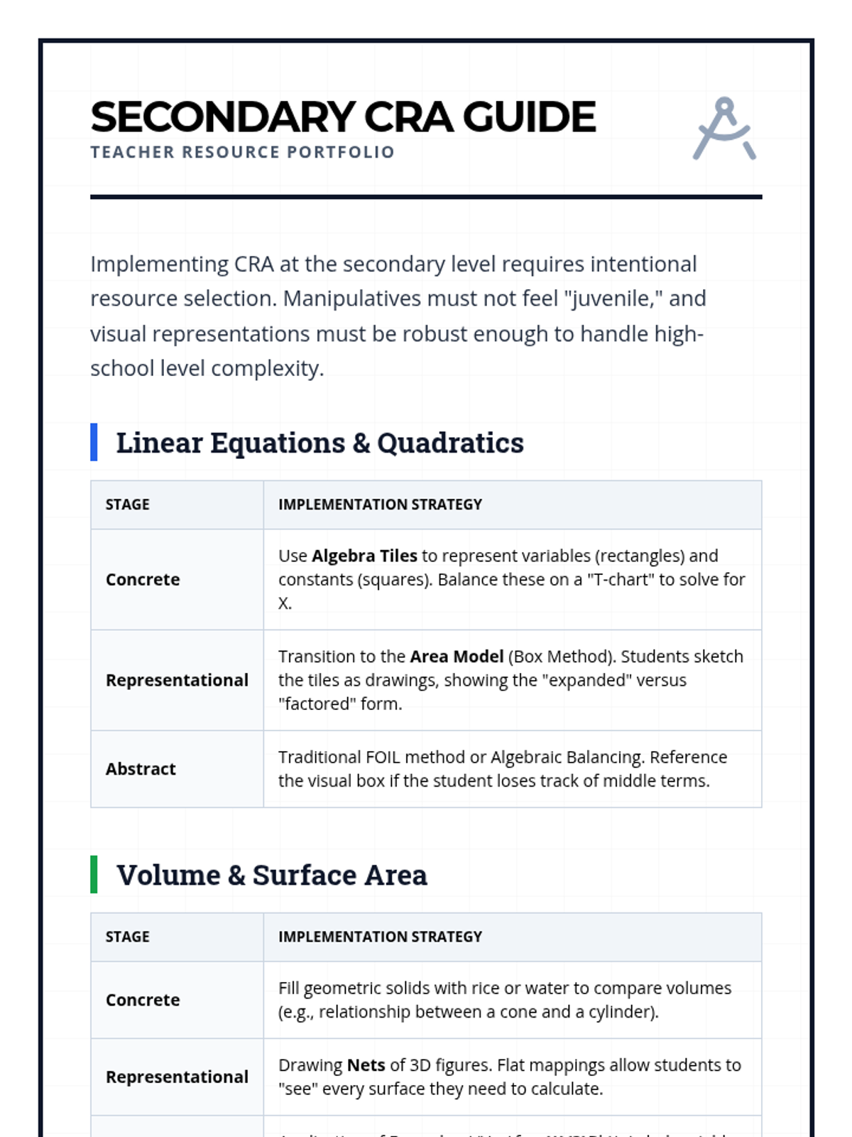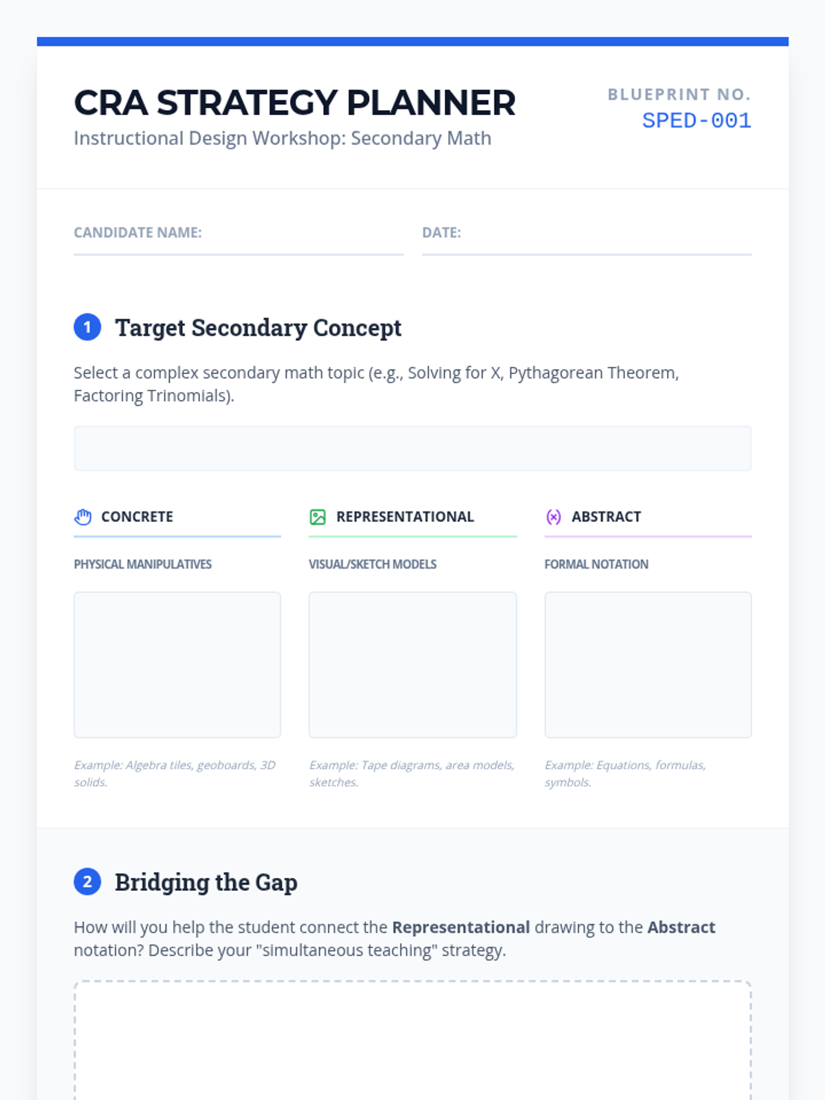 This sequence explores the Concrete-Representational-Abstract (CRA) framework and Schema-Based Instruction (SBI) to equip pre-service teachers with visual scaffolding strategies for students with disabilities. It covers the transition from physical manipulatives to graphic organizers and eventual independence through scaffold fading.