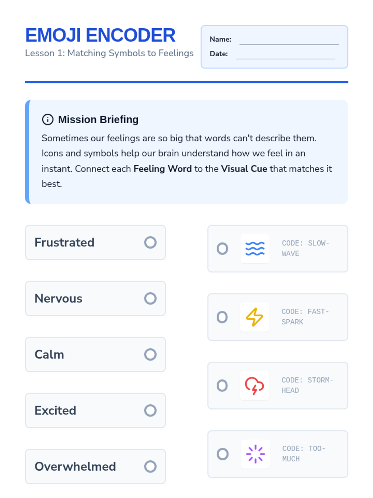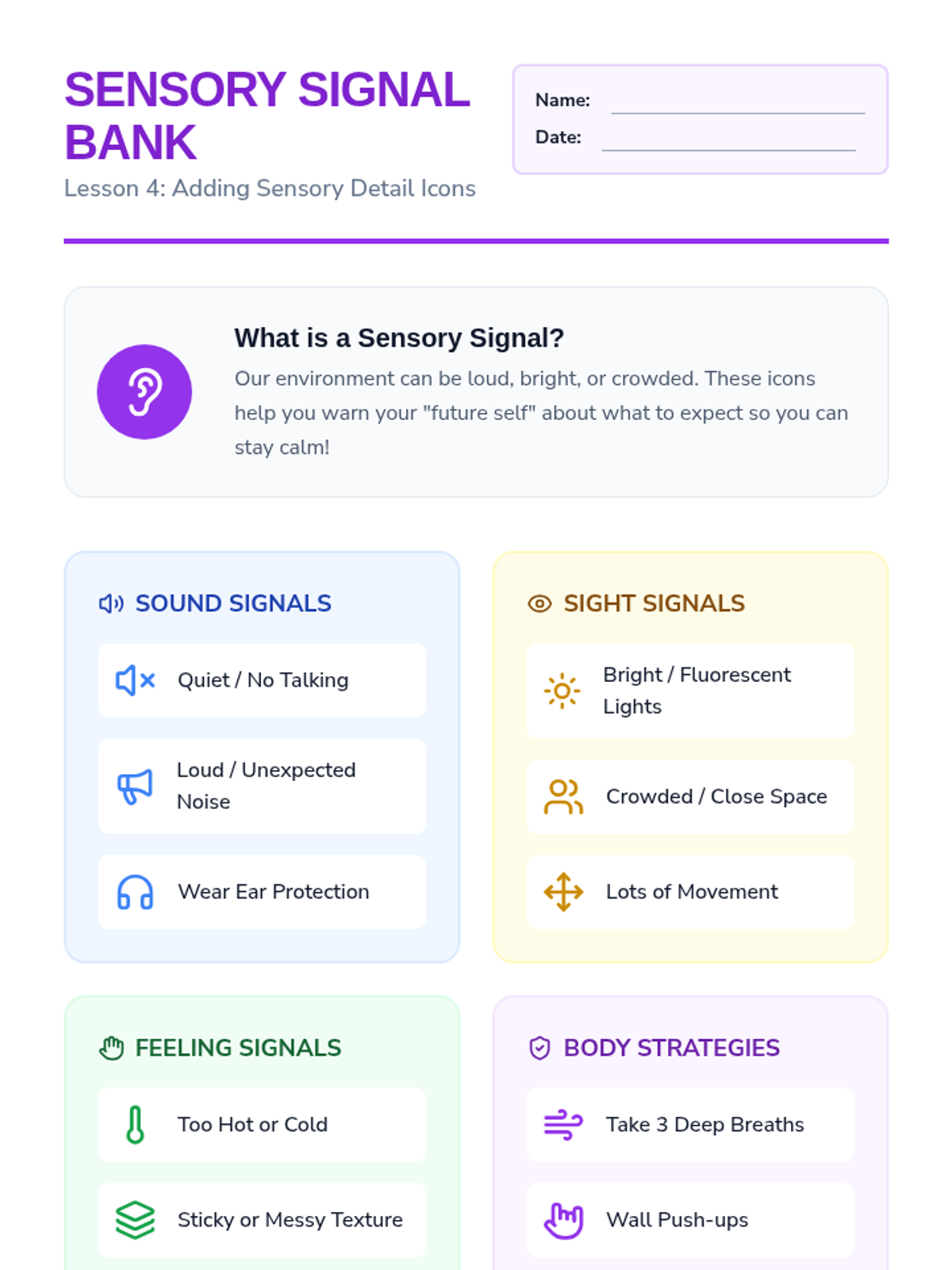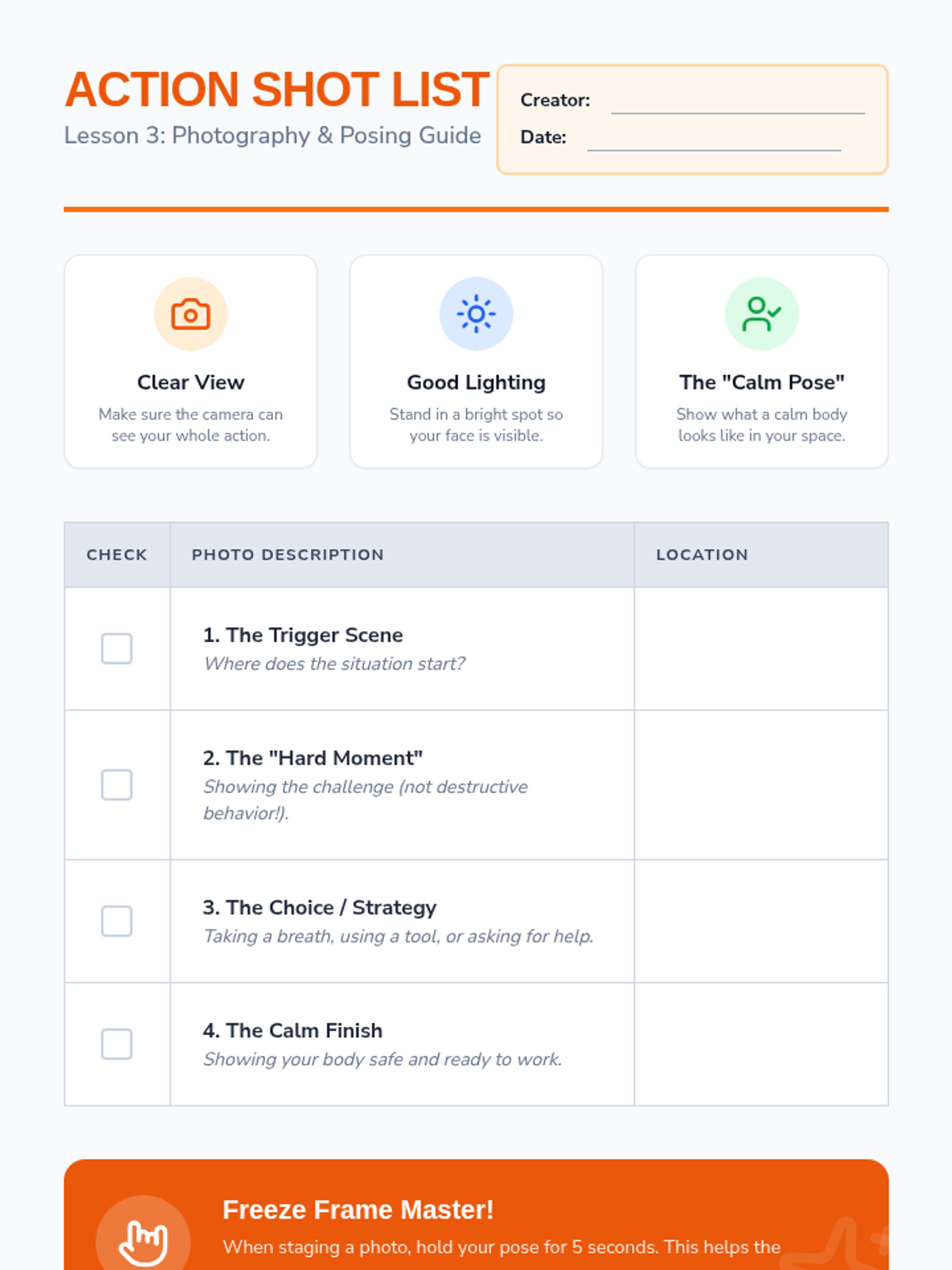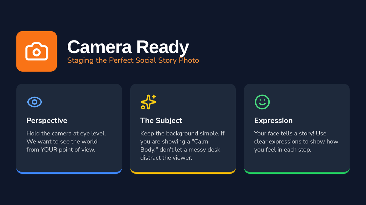 A 5-lesson unit where students learn to create their own visual social stories. They explore the power of visual cues, storyboard their scripts, use photography for staging, incorporate sensory details, and finally assemble their own personalized social story booklets.