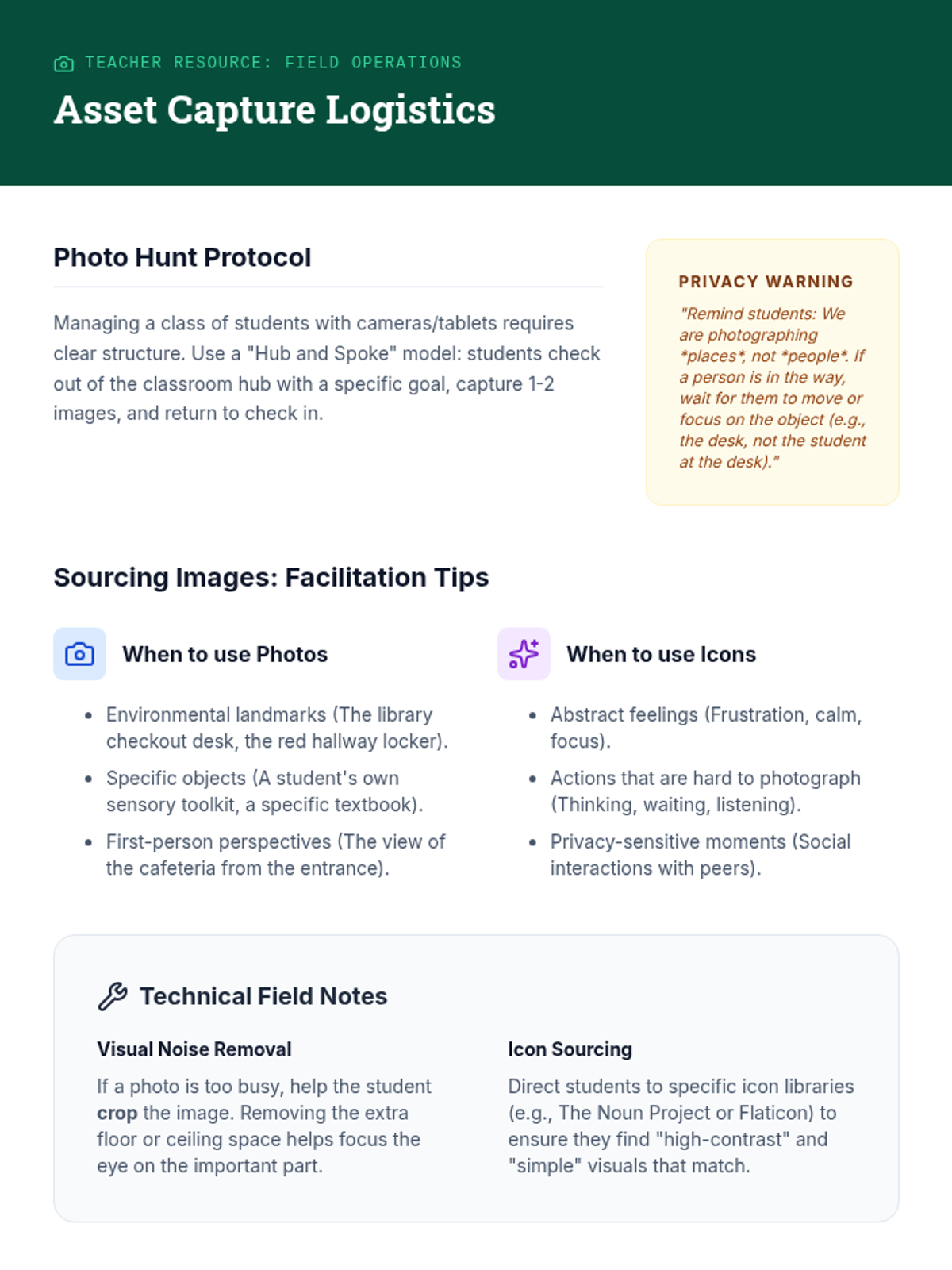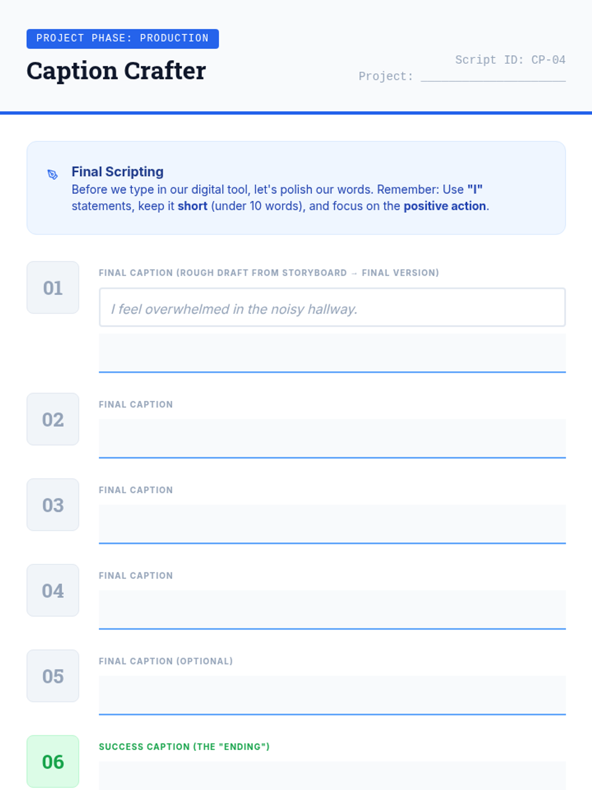 A 5th-grade project-based sequence where students design and create personalized digital visual social stories to help regulate behavior during challenging school scenarios. Students move from identifying personal triggers to storyboarding, capturing visual assets, and assembling a final digital product.