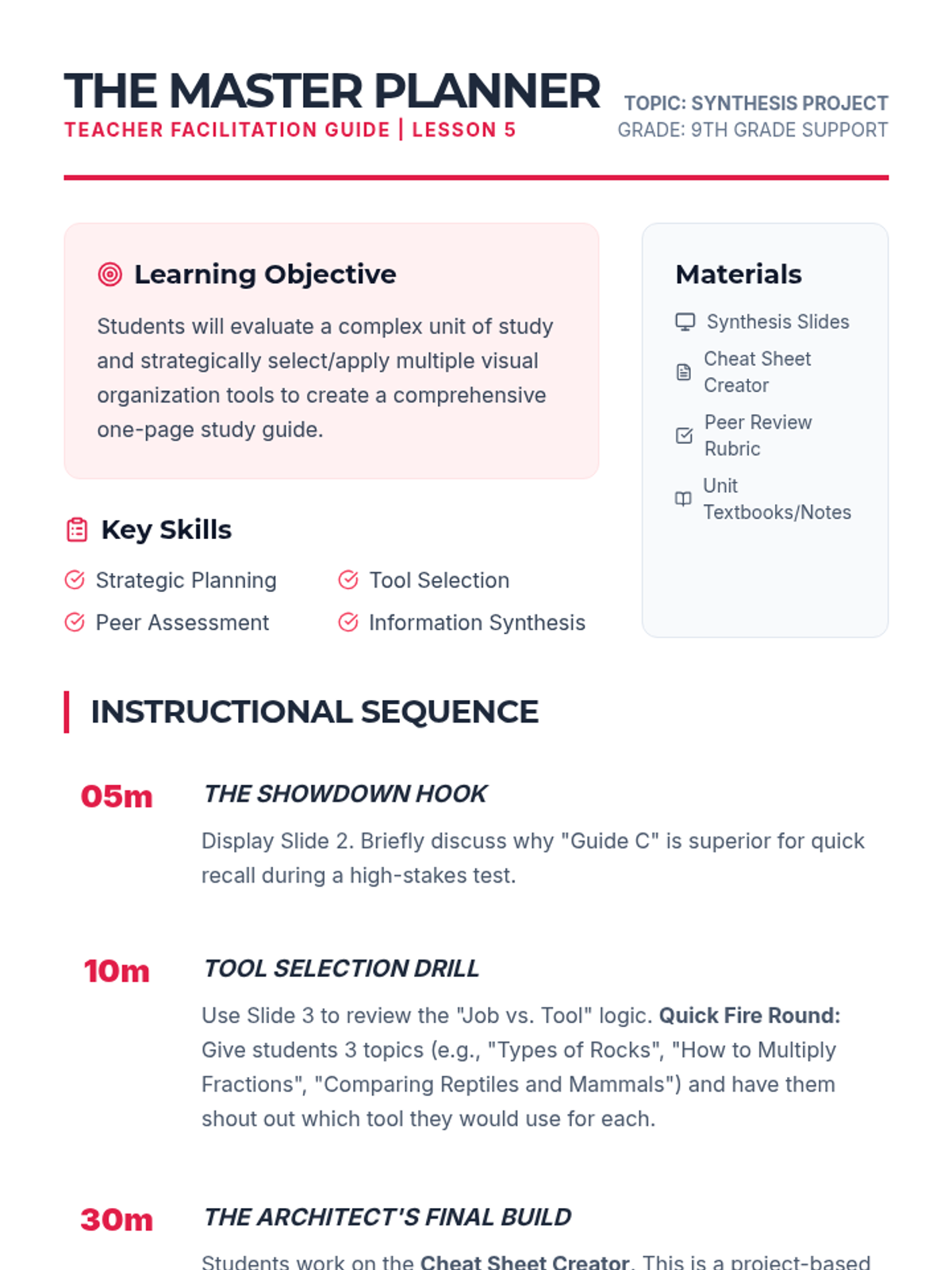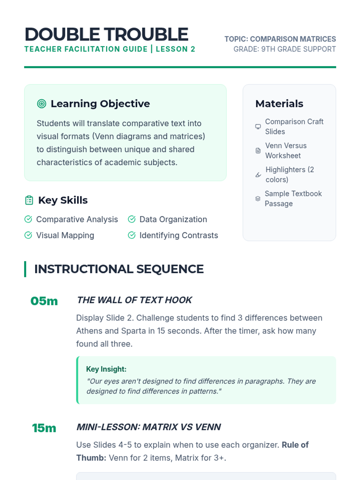 A 5-lesson sequence for 9th-grade students on transforming complex academic information into visual study guides. Students learn chunking, comparison matrices, flowcharts, and concept maps to improve comprehension and memory.