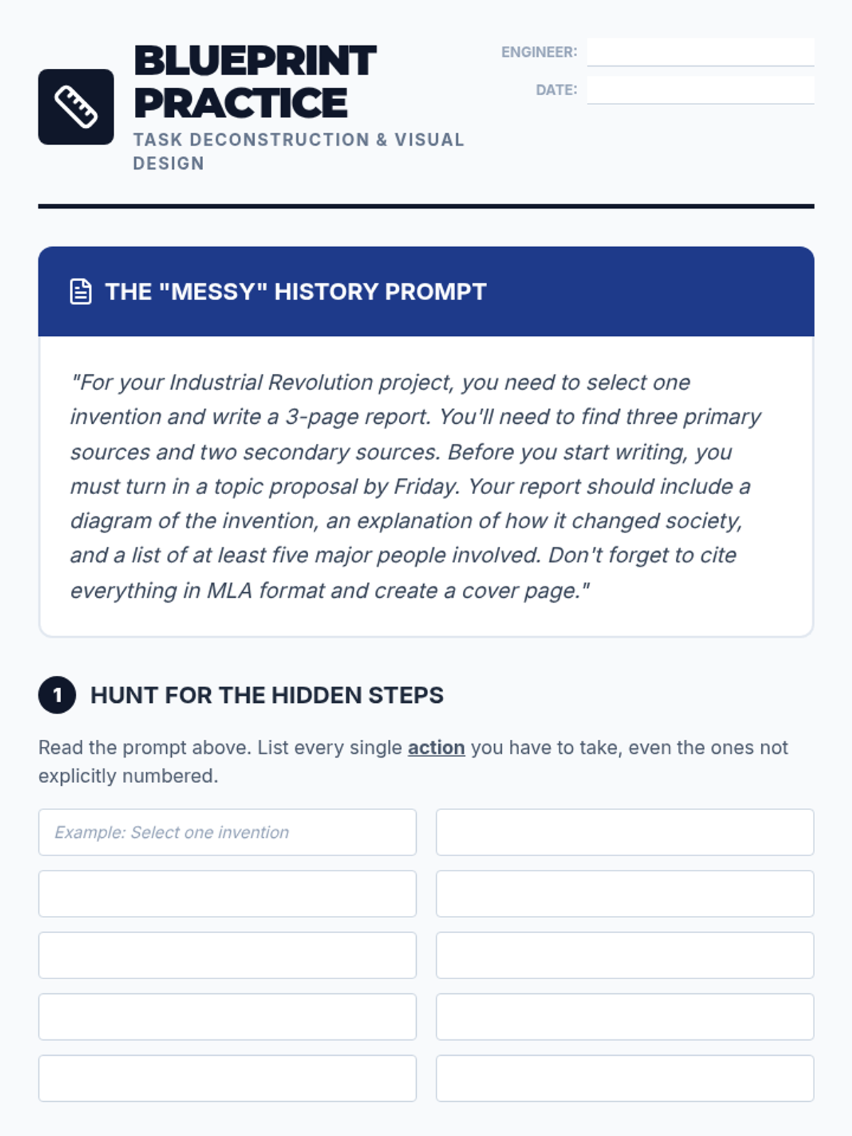 A comprehensive sequence for 9th-grade students to master working memory compensation through visual supports. Students move from understanding cognitive load to designing and applying personalized checklists, graphic organizers, and environmental cues to their actual schoolwork.