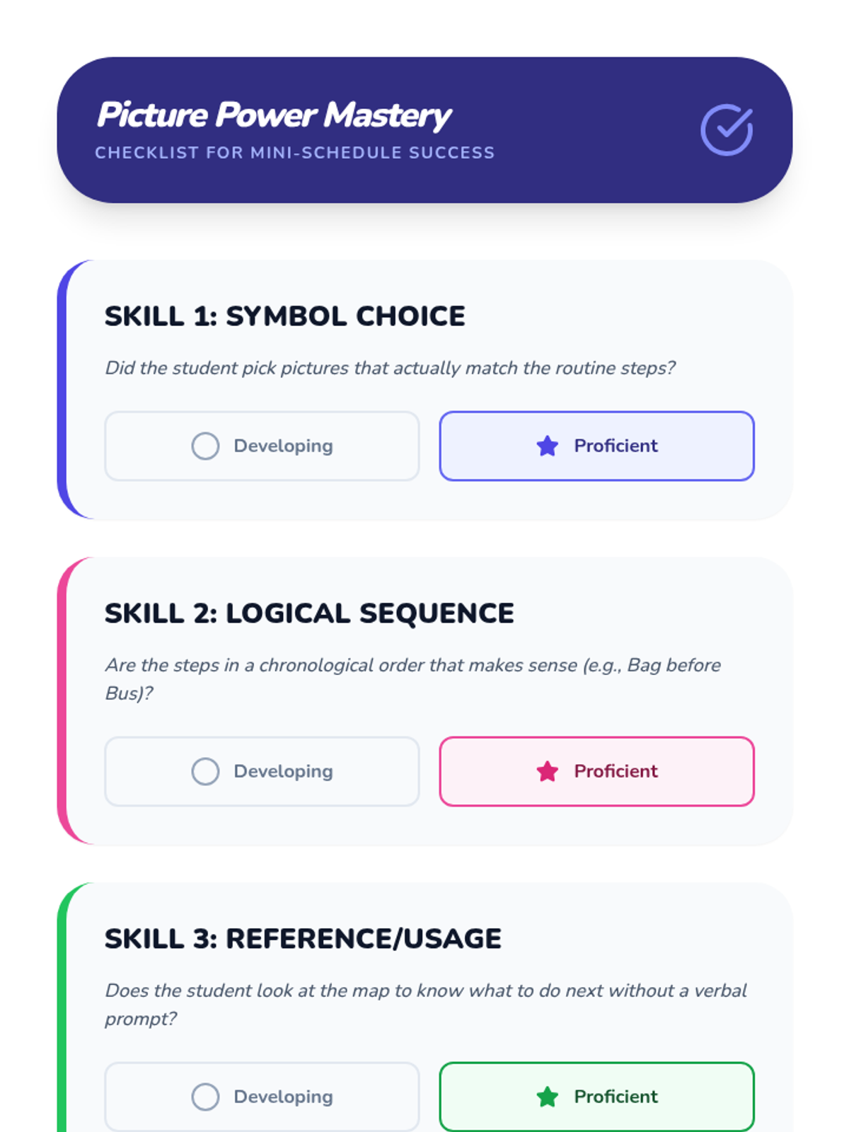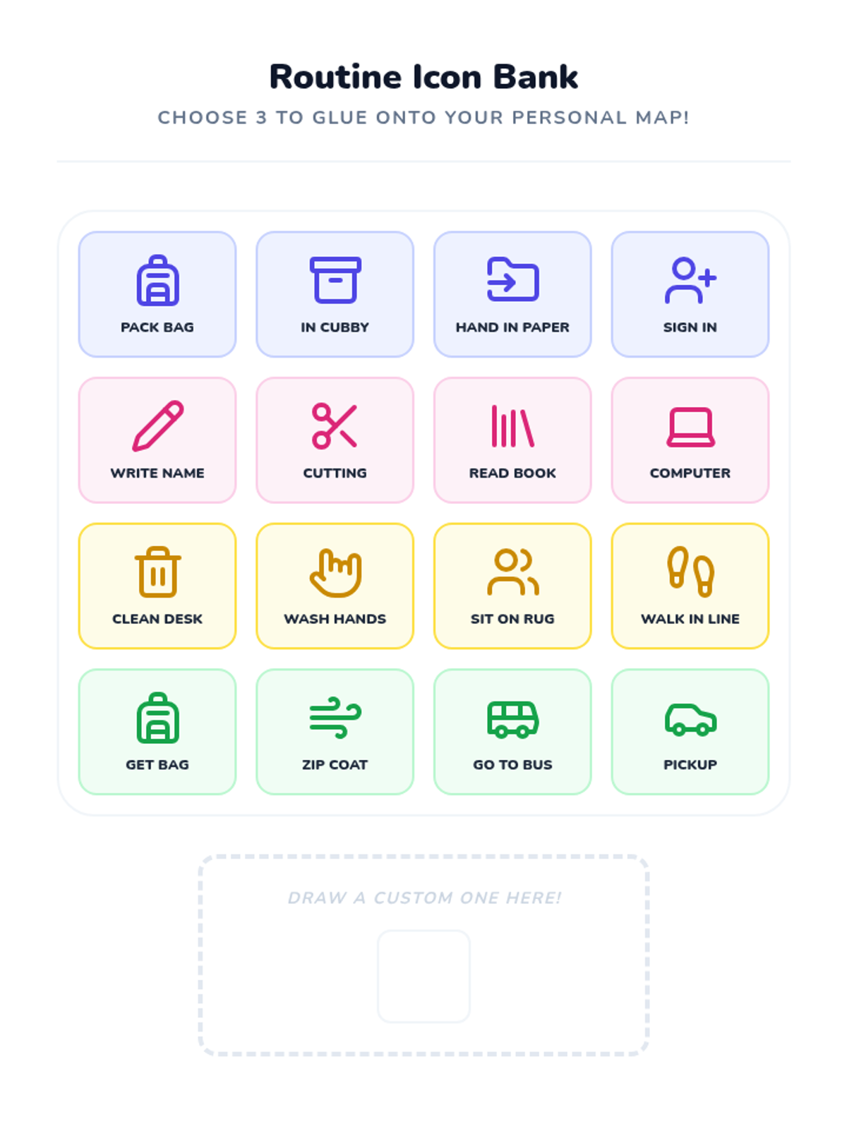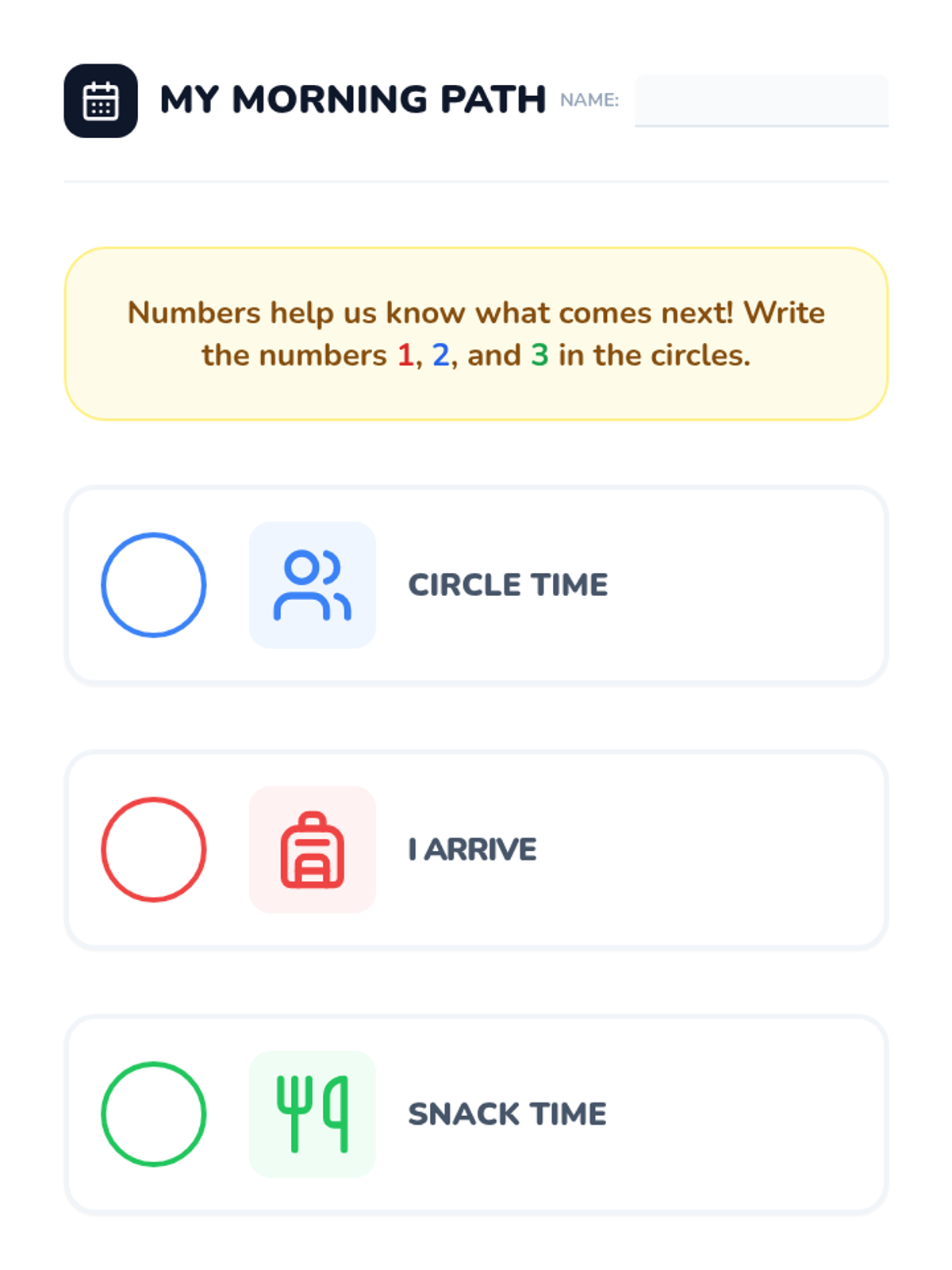A 5-lesson series designed for a kindergarten student to understand the importance of school attendance, healthy habits, asking for help, and home routines. The sequence uses visual support and engaging activities to build school readiness.