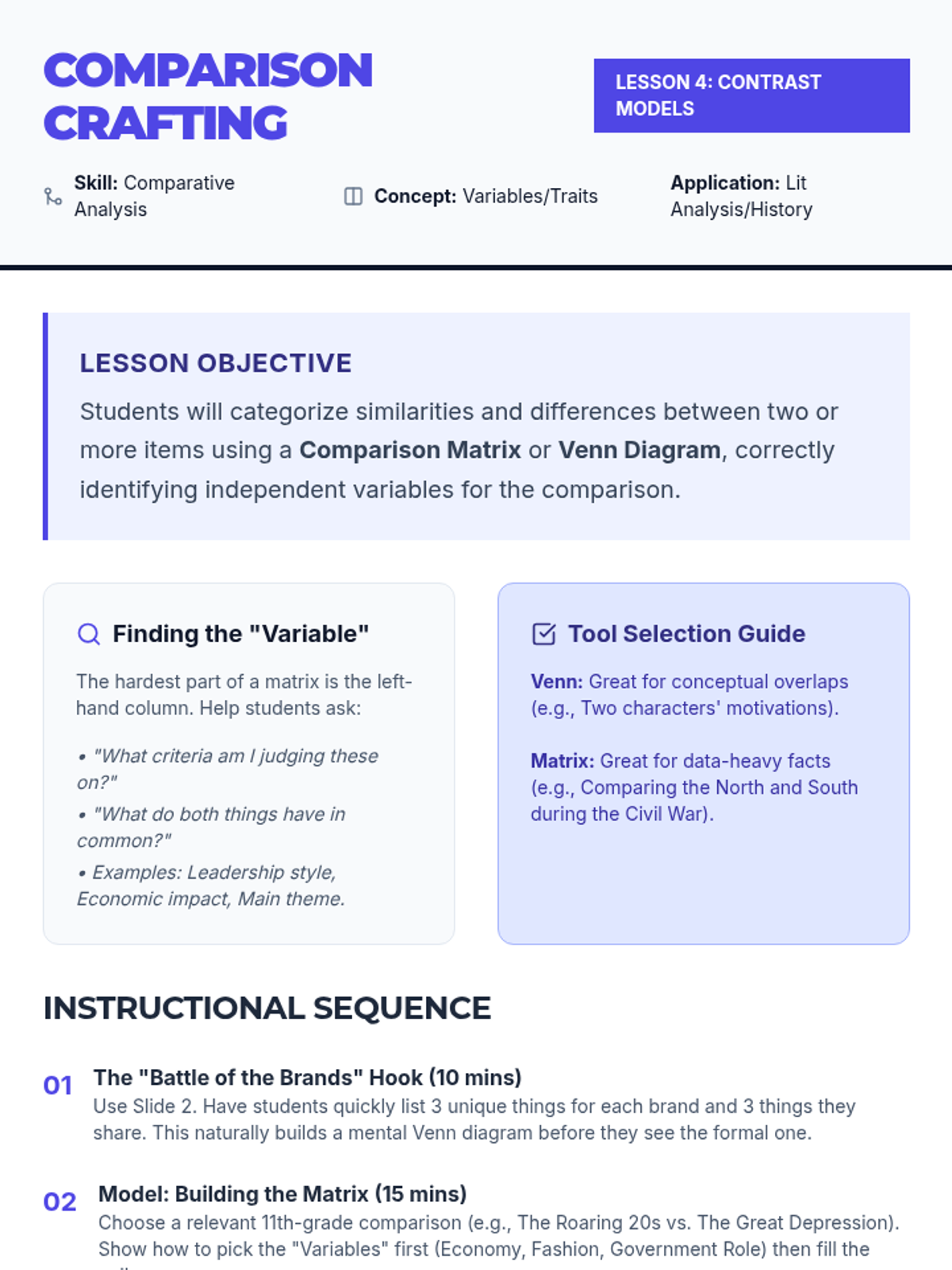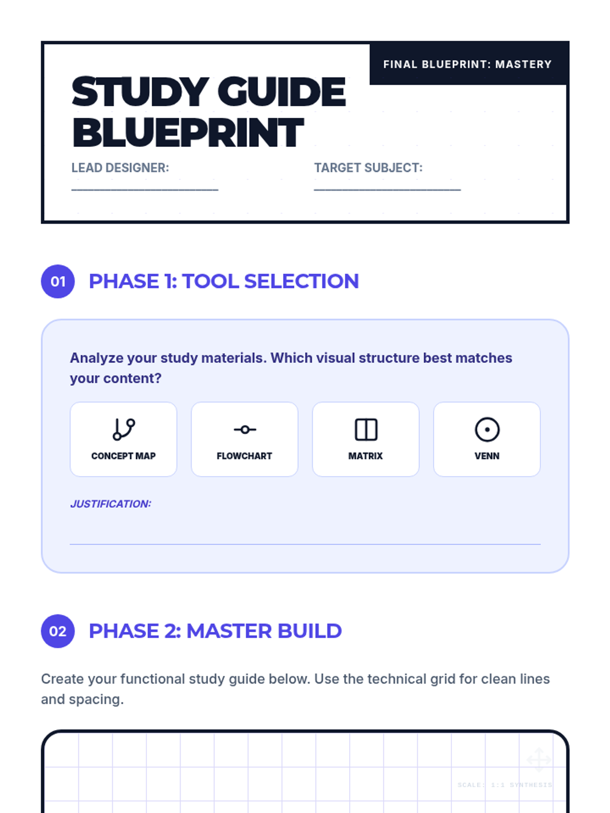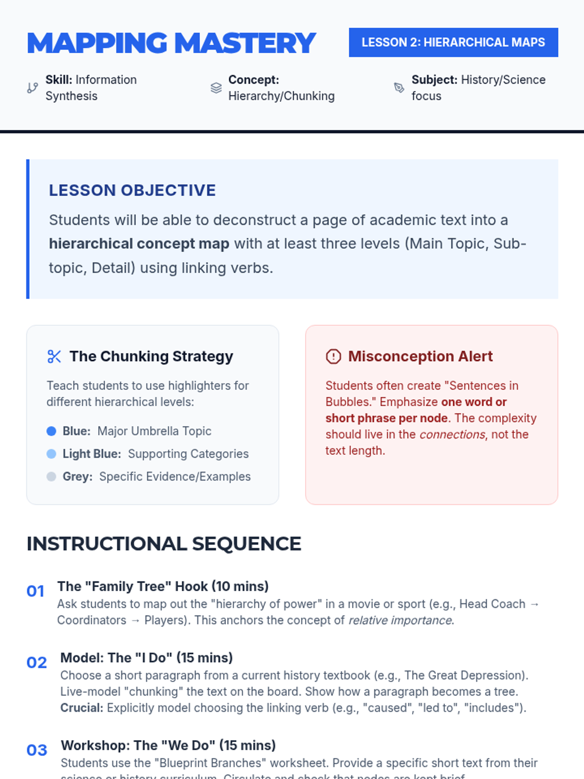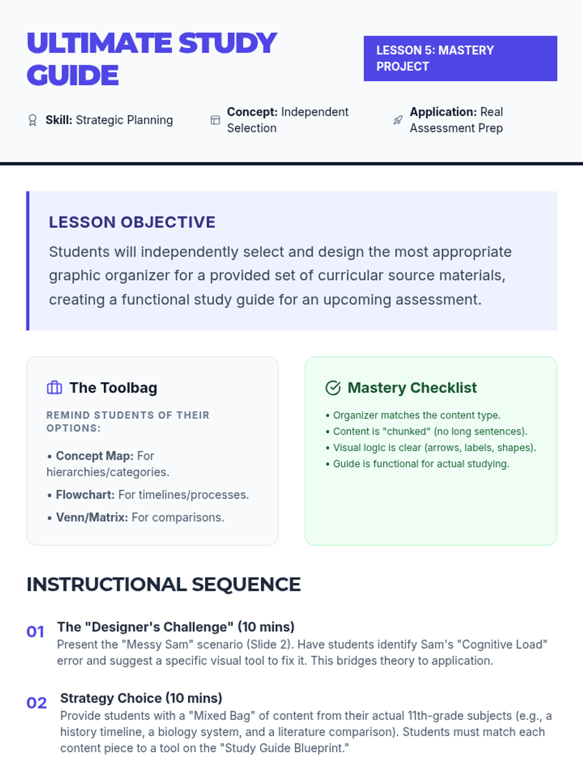 This sequence transforms passive reading into active visual synthesis for 11th-grade students. Students will master graphic organizers like concept maps, flowcharts, and comparison matrices to deconstruct complex texts into functional study guides.