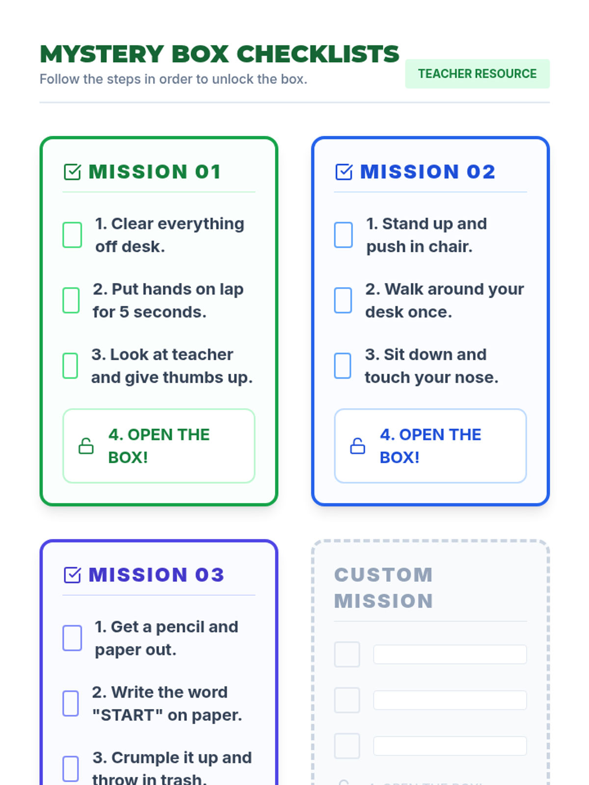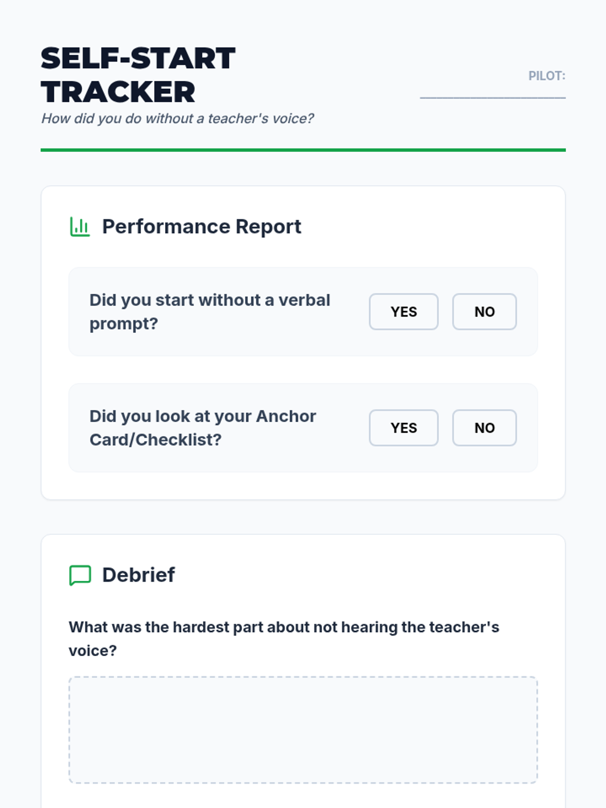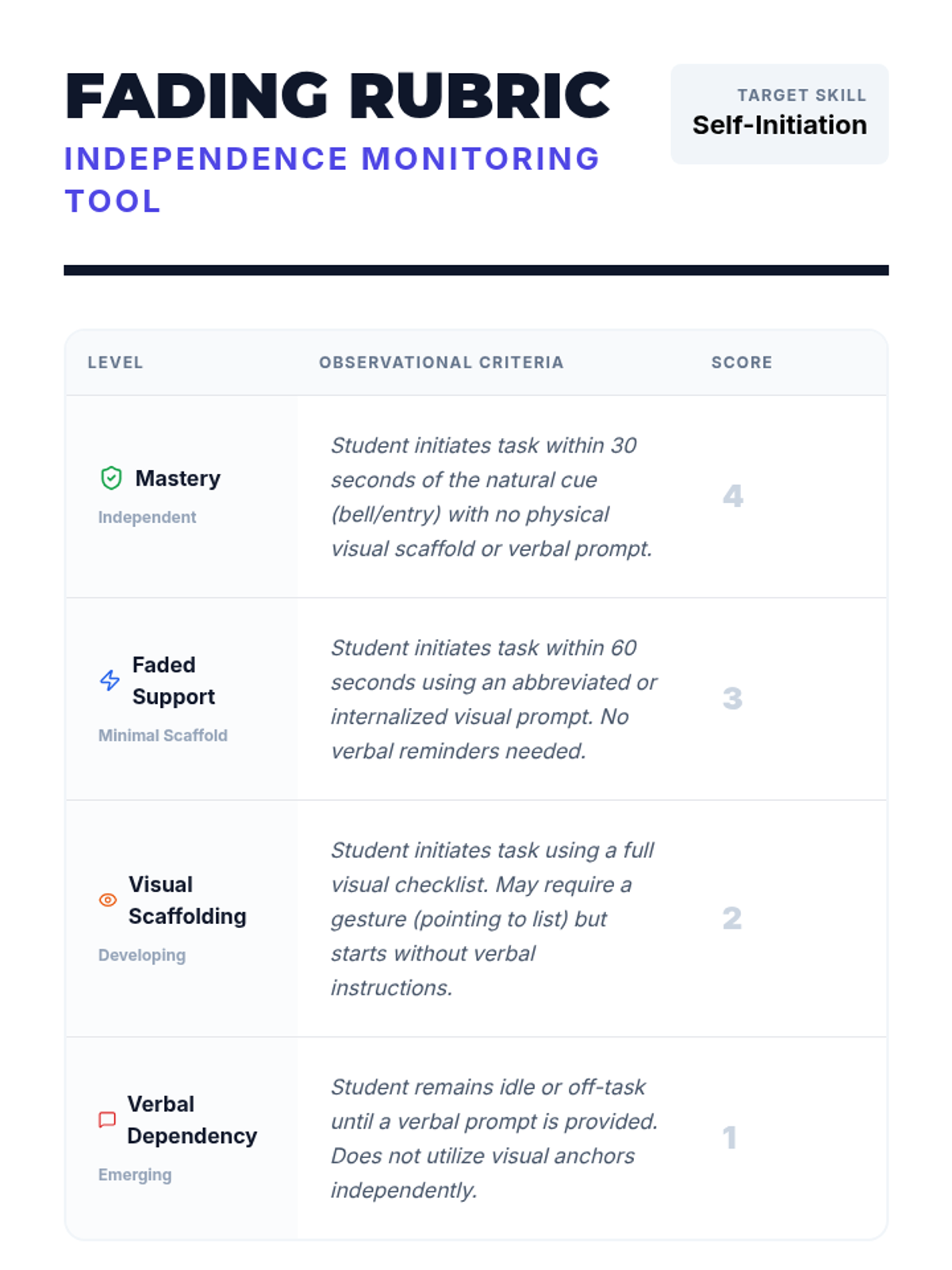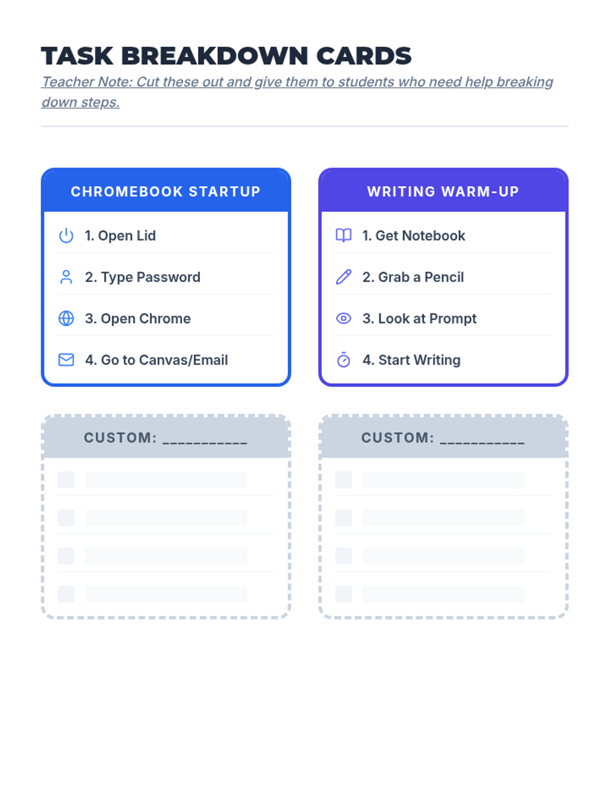 A 5-lesson sequence for 9th-grade Special Education students focused on building independence by replacing verbal prompts with visual systems. Students learn to use checklists and visual anchors to initiate tasks without teacher intervention.
