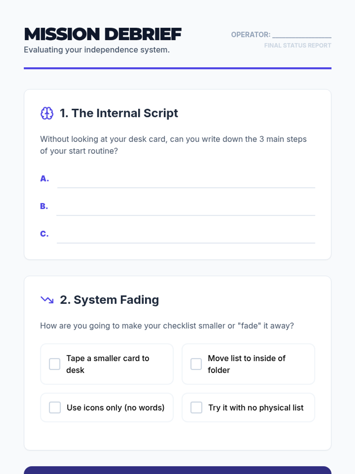 A series of mini-lessons designed to help students understand and optimize their working memory through environmental organization and cognitive strategies.