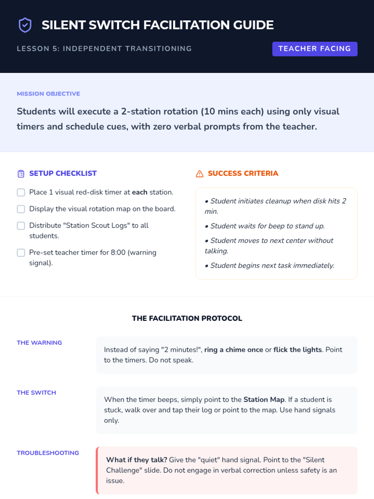 A 5-lesson sequence designed for 2nd-grade students to master the use of visual timers and schedules for smoother activity transitions. Students explore time perception, learn to read various visual countdowns, and develop self-regulation strategies for independent transitions.