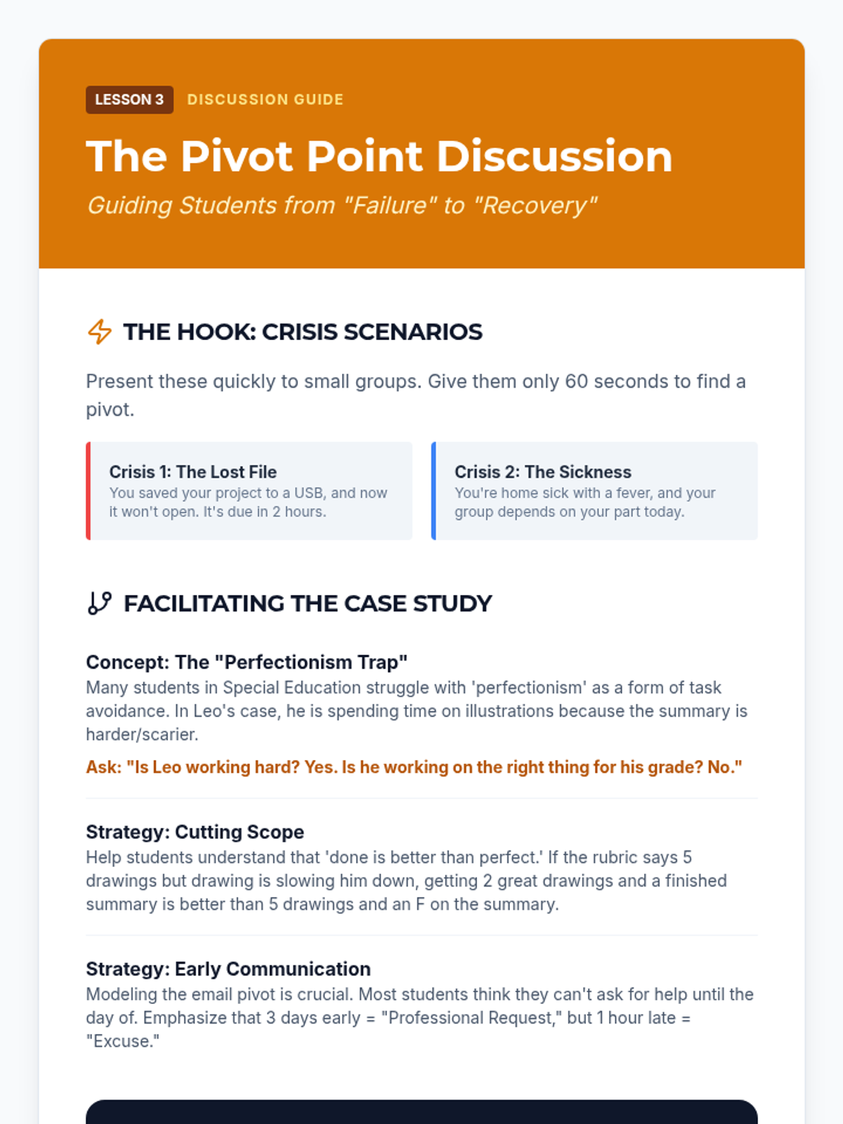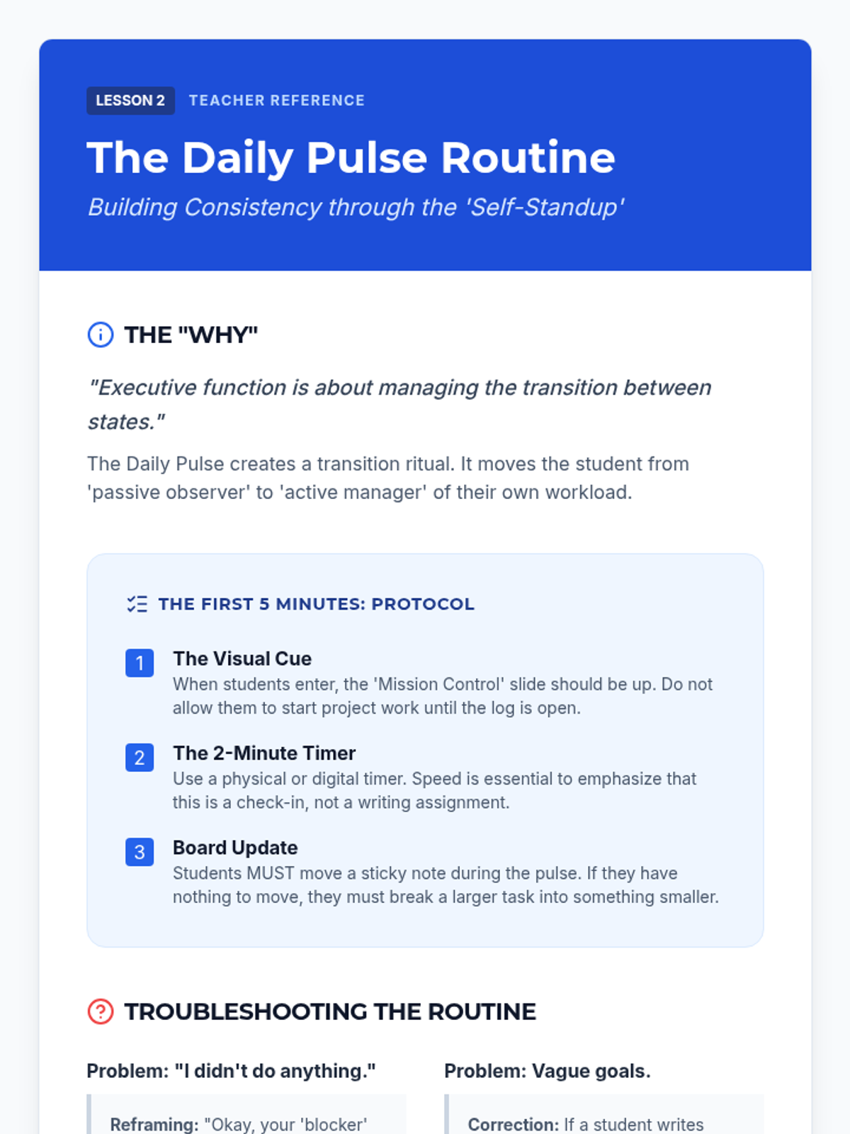 A sequence designed for 10th-grade students to master long-term project management through visual workflow systems like Kanban, daily self-monitoring routines, and adaptive problem-solving. Students learn to externalize executive memory and pivot when plans change.