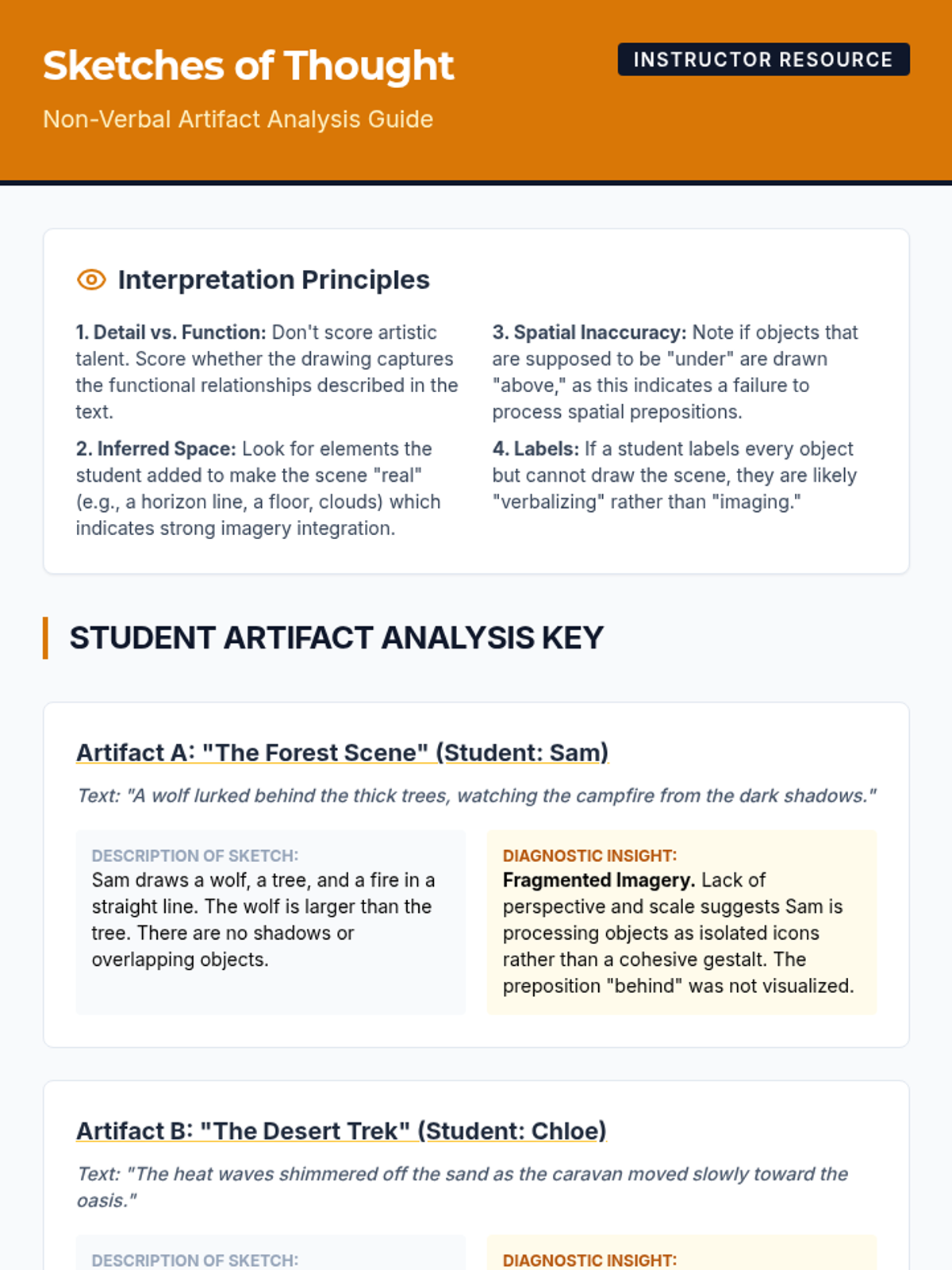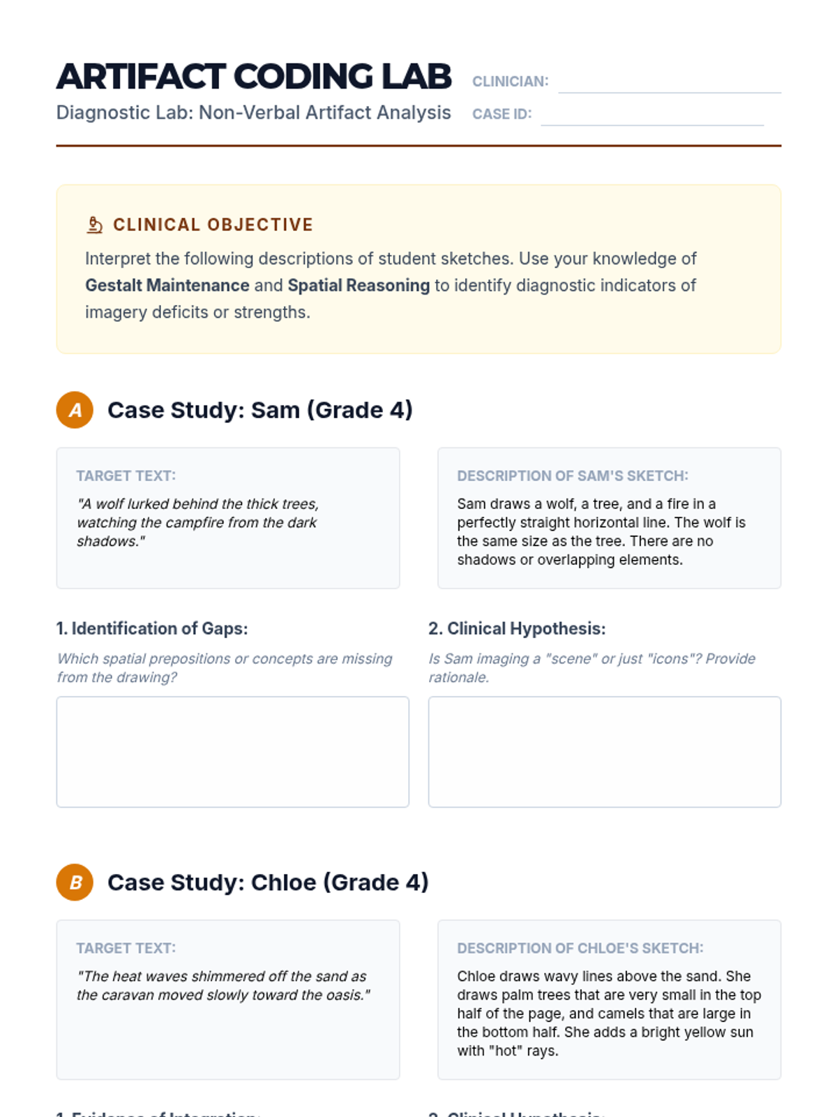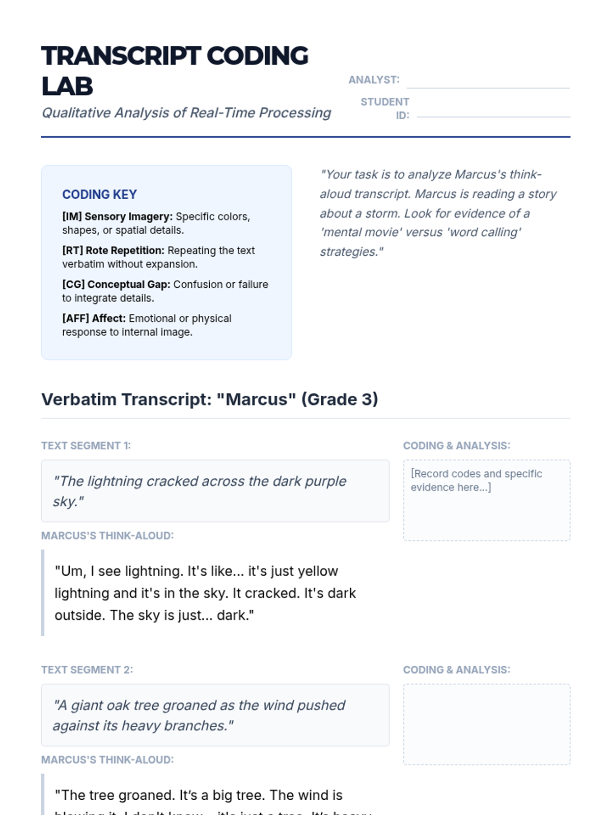 This graduate-level sequence focuses on the clinical diagnosis and assessment of visualization deficits in students with comprehension challenges. Participants will learn to differentiate between decoding and imagery-based deficits, conduct clinical think-aloud interviews, and develop qualitative rubrics for sensory recall and non-verbal representations.