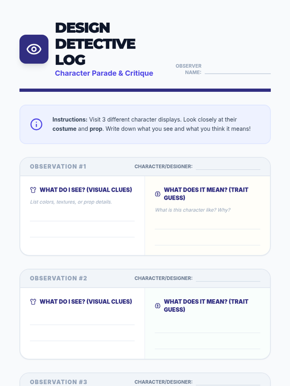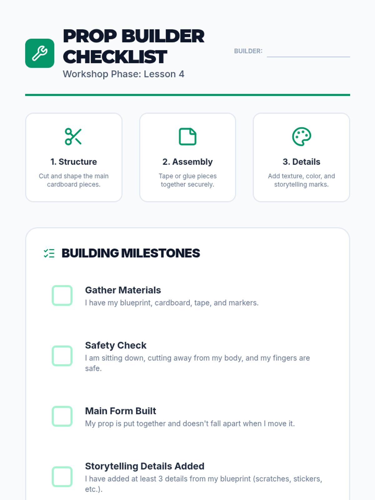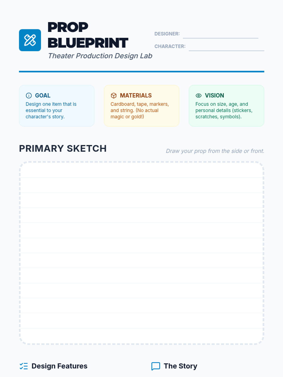 A design-focused sequence for 3rd graders on how costumes and props communicate character. Students analyze traits, select costume elements, and build cardboard props to bring characters to life.