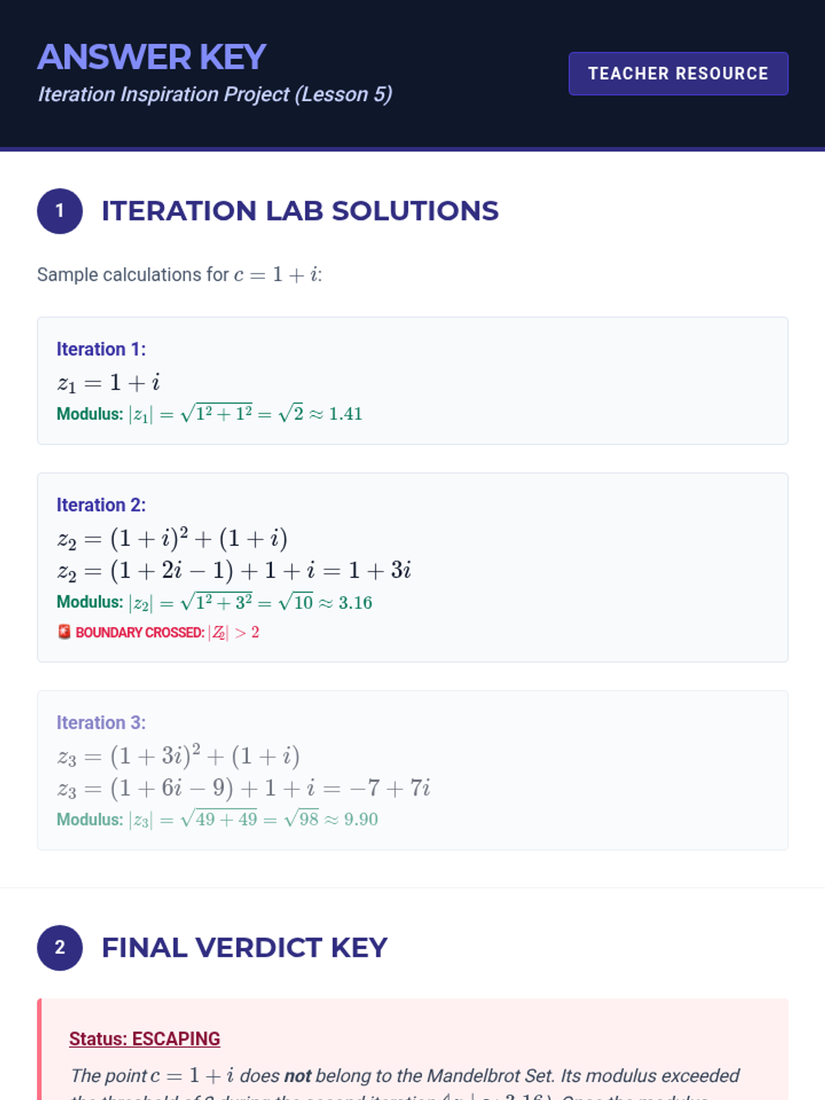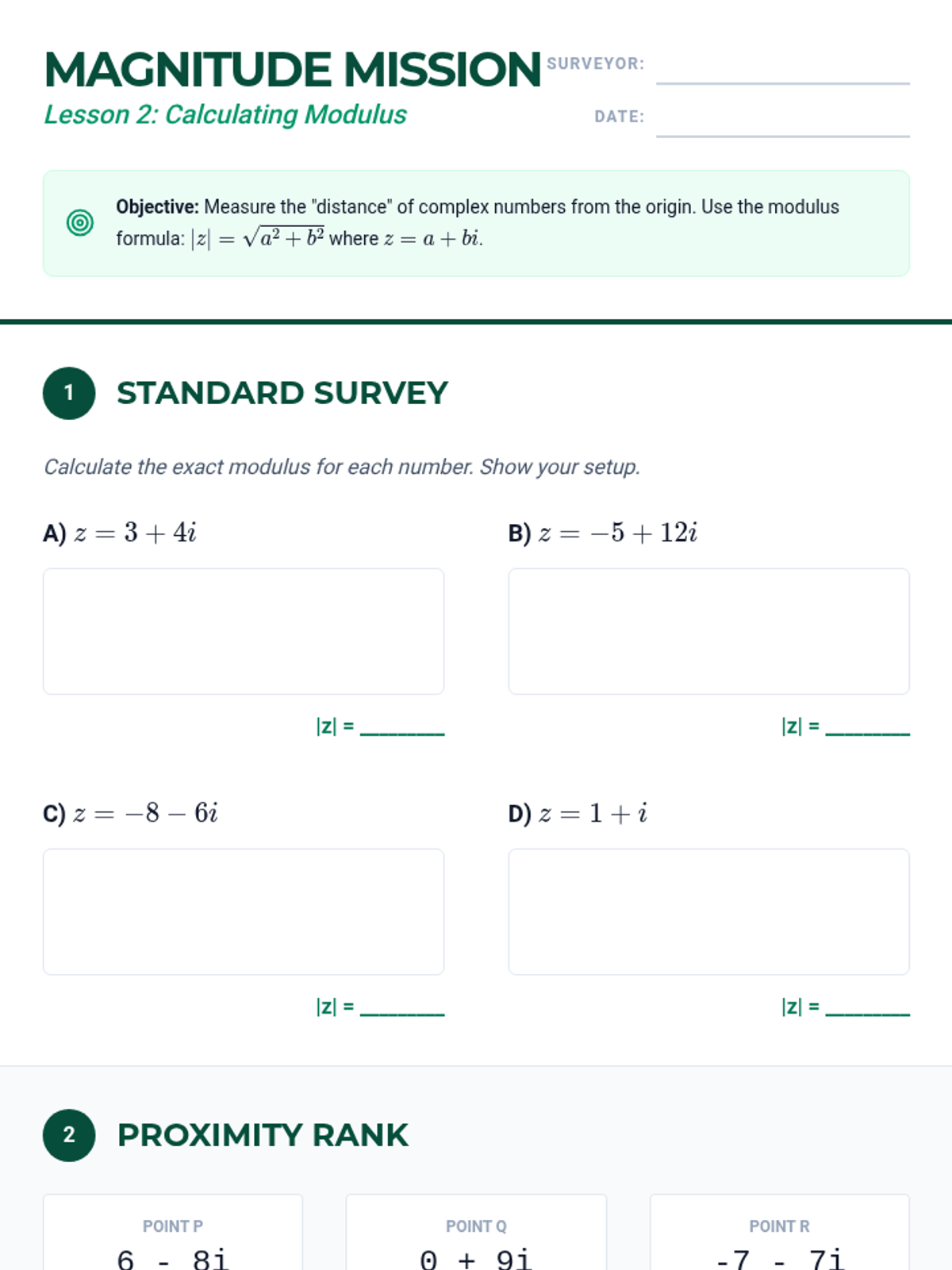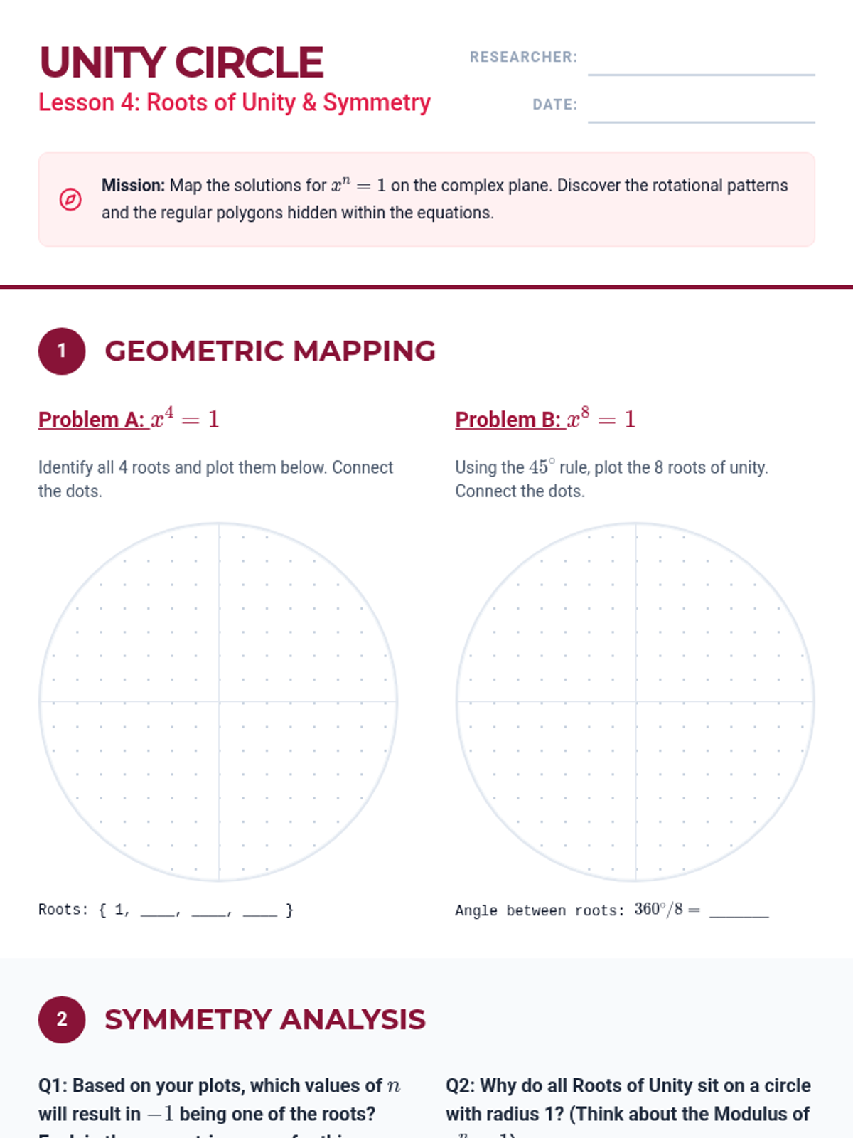 This 12th-grade mathematics sequence explores the geometric interpretation of complex numbers on the Argand plane. Students will master plotting, calculating modulus, visualizing vector arithmetic, and discovering the elegant symmetry of roots of unity, culminating in an exploration of complex iterations and fractals.