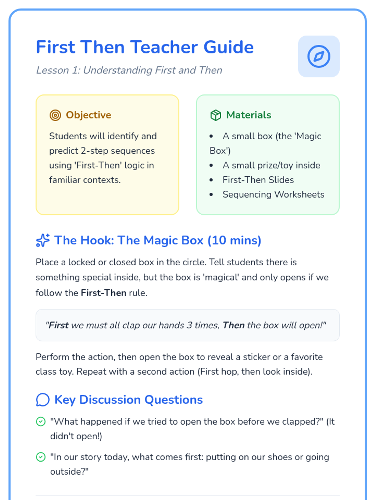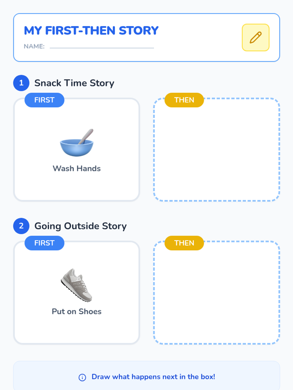 A sequence for Pre-K students focused on understanding and creating visual narratives of their daily routines. Students learn sequencing (First-Then), transition management, and flexibility through the creation of personal social stories and visual schedules.