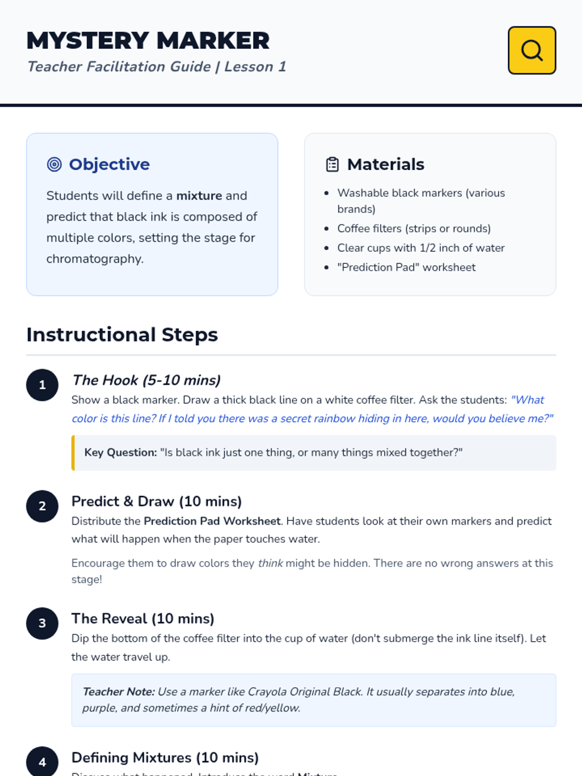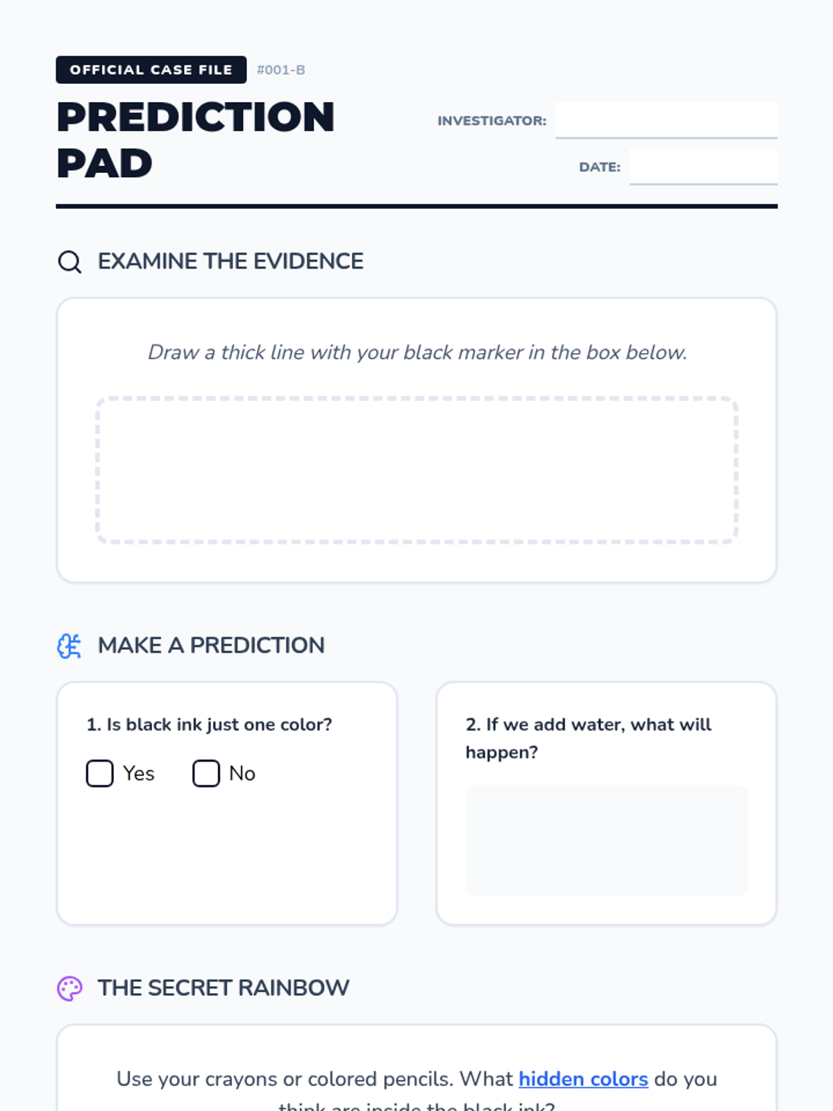 Students become 'Ink Investigators' to explore the science of mixtures through chromatography. They discover that black ink is often a combination of many colors and learn about solubility by testing different markers.