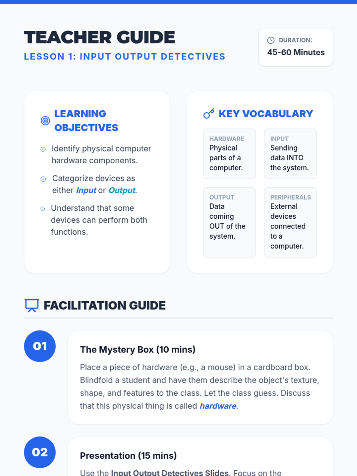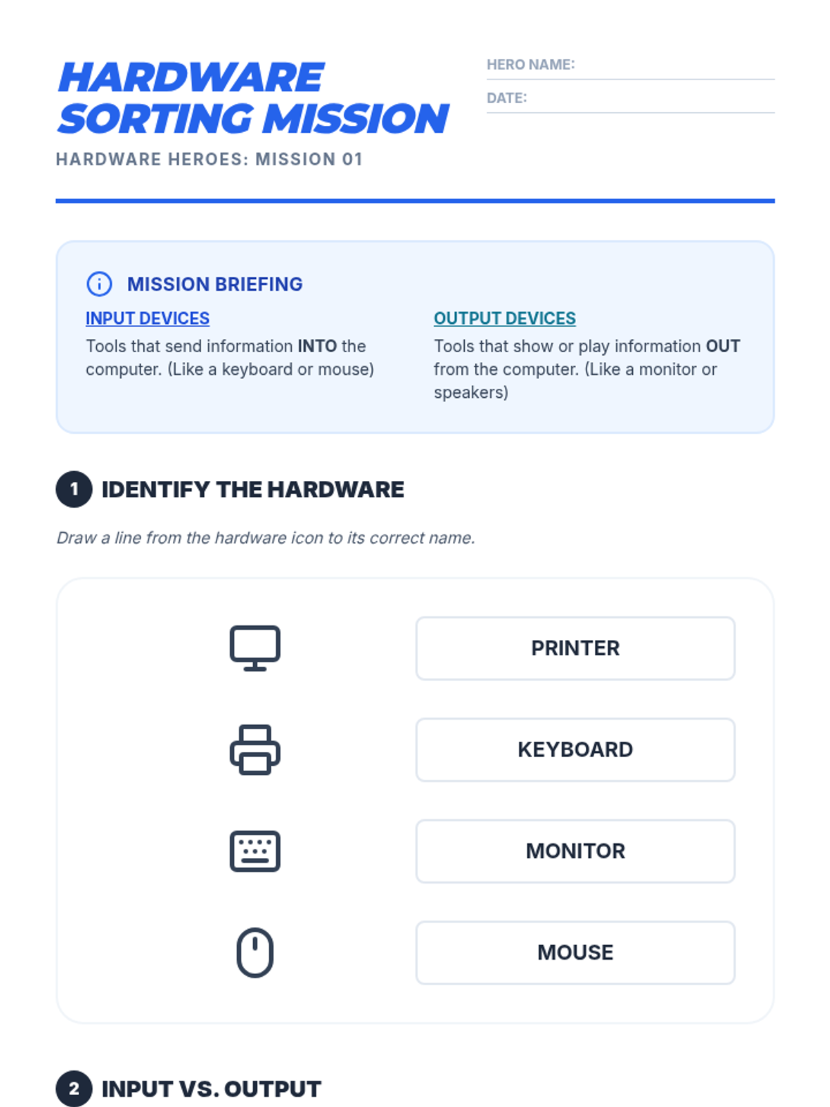 A comprehensive introduction to computer hardware for 3rd graders, covering identification, connectivity, ergonomics, troubleshooting, and device care. Students become 'Hardware Heroes' as they learn to navigate and maintain technology independently.