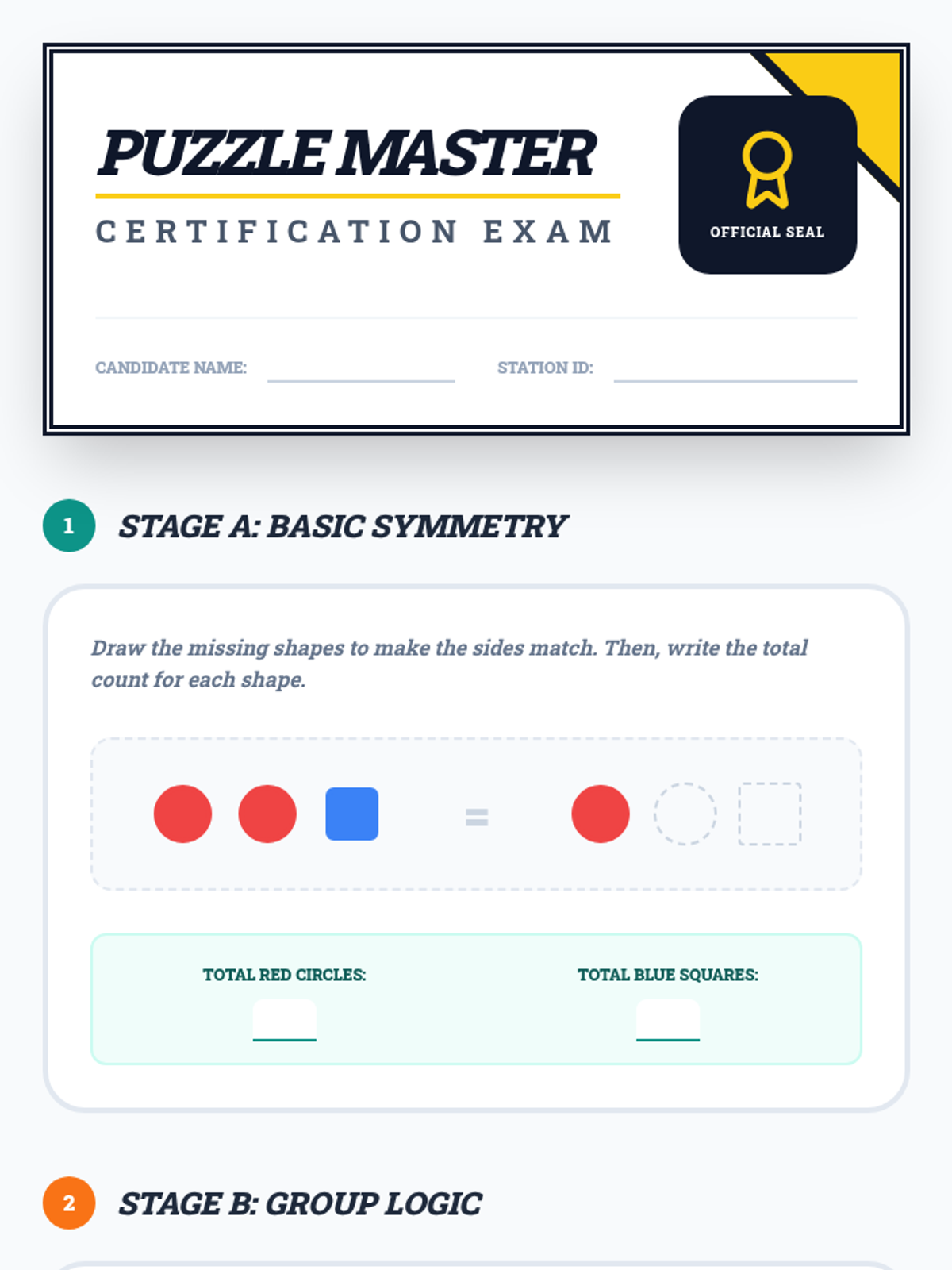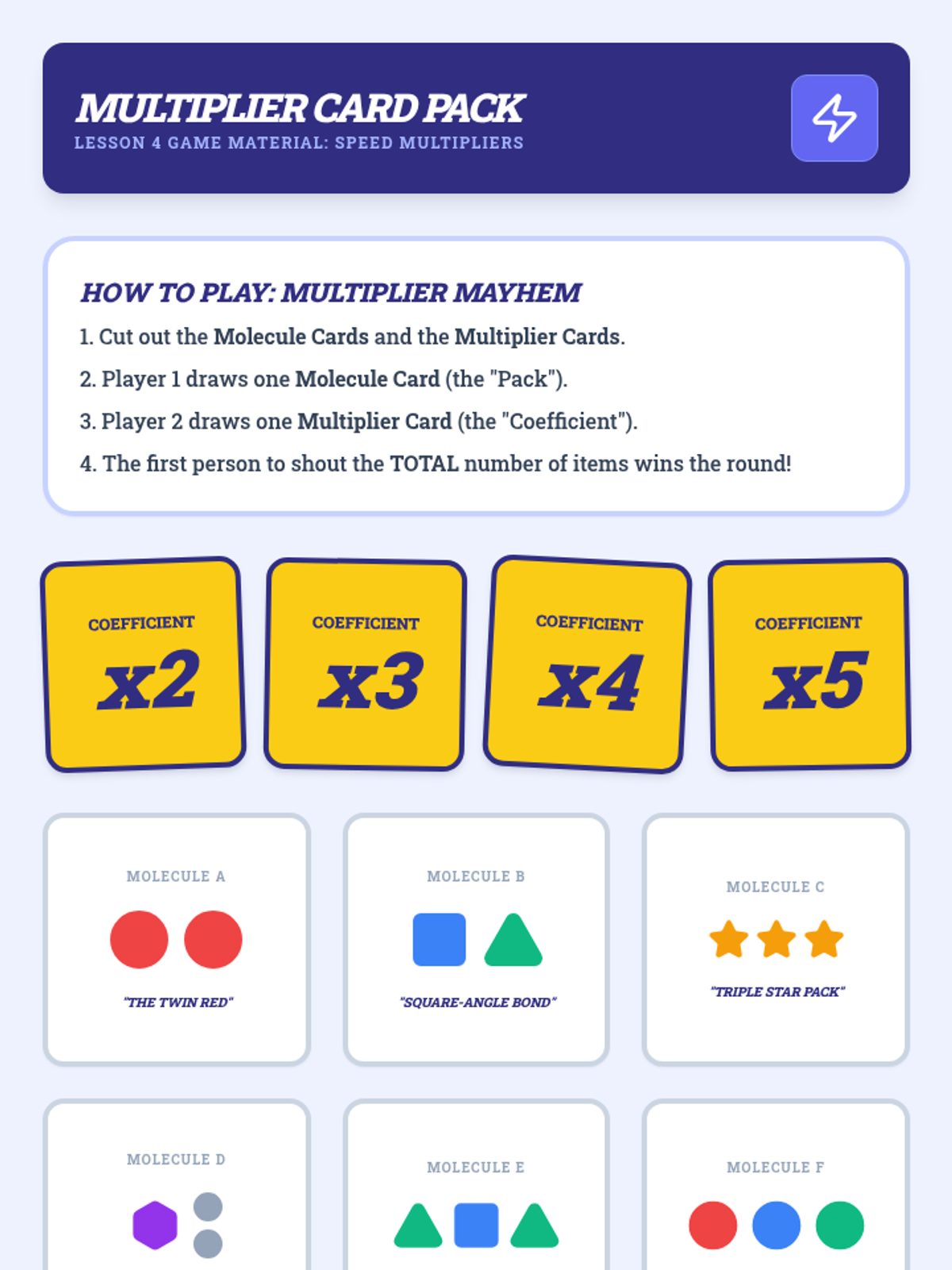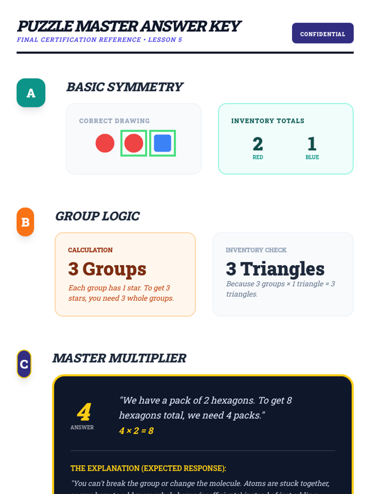 A game-based chemistry sequence for 3rd graders focusing on the mathematical symmetry of balancing equations. Students use visual puzzles, pan balances, and 'glued' shape groups to understand equilibrium and the logic of coefficients.