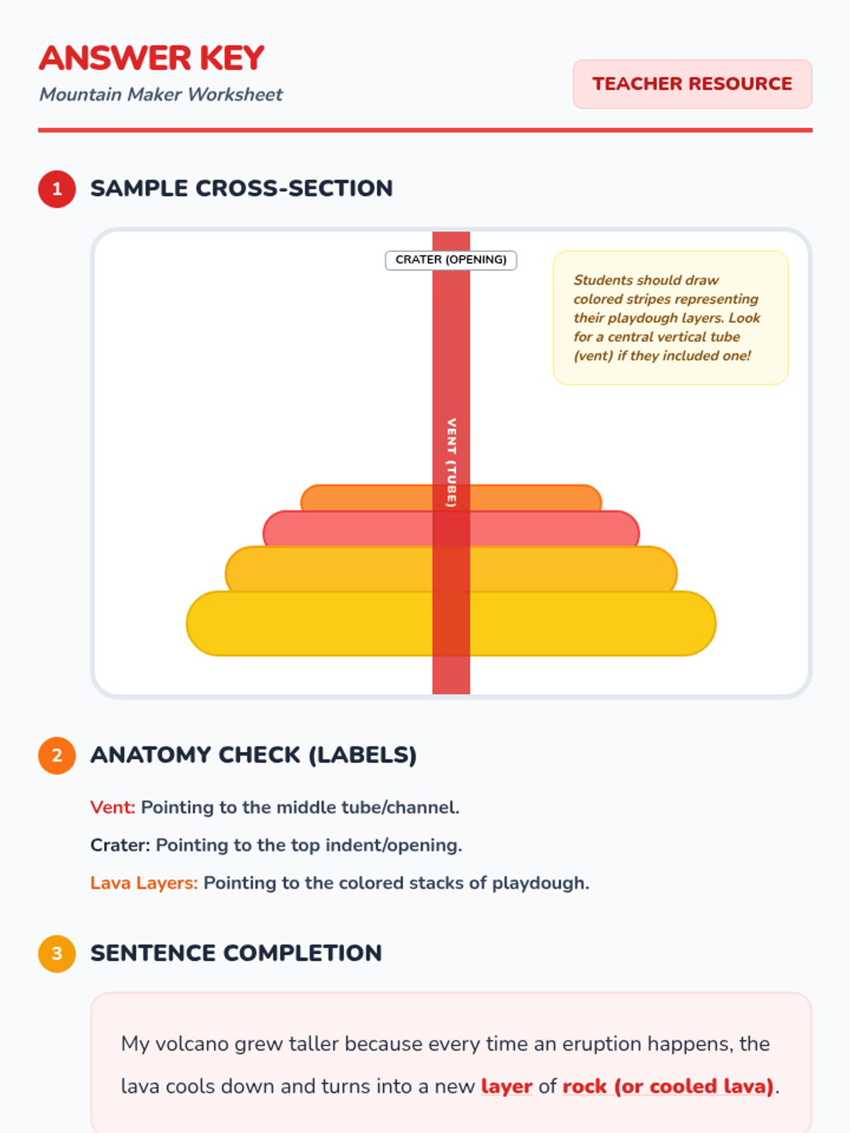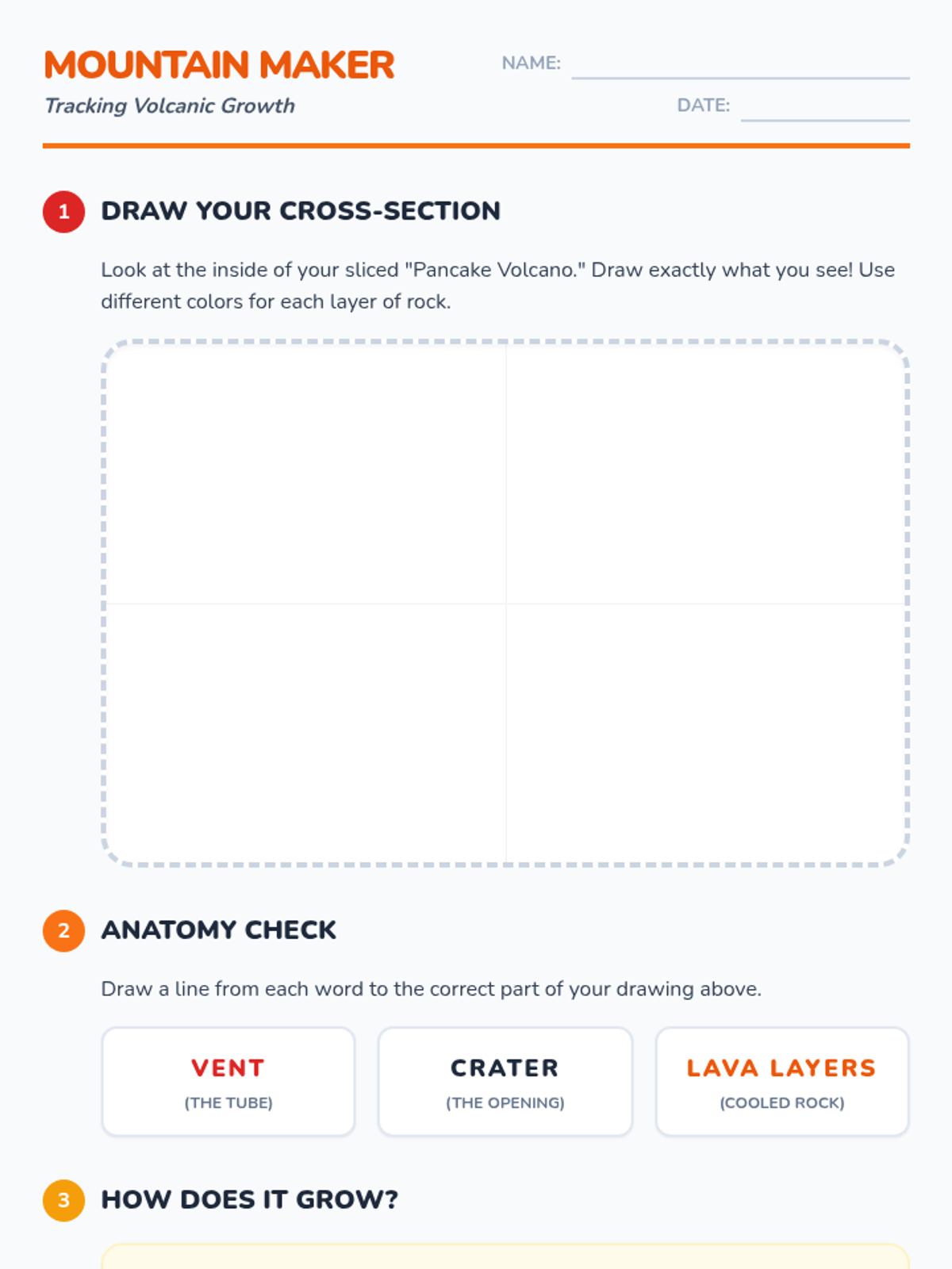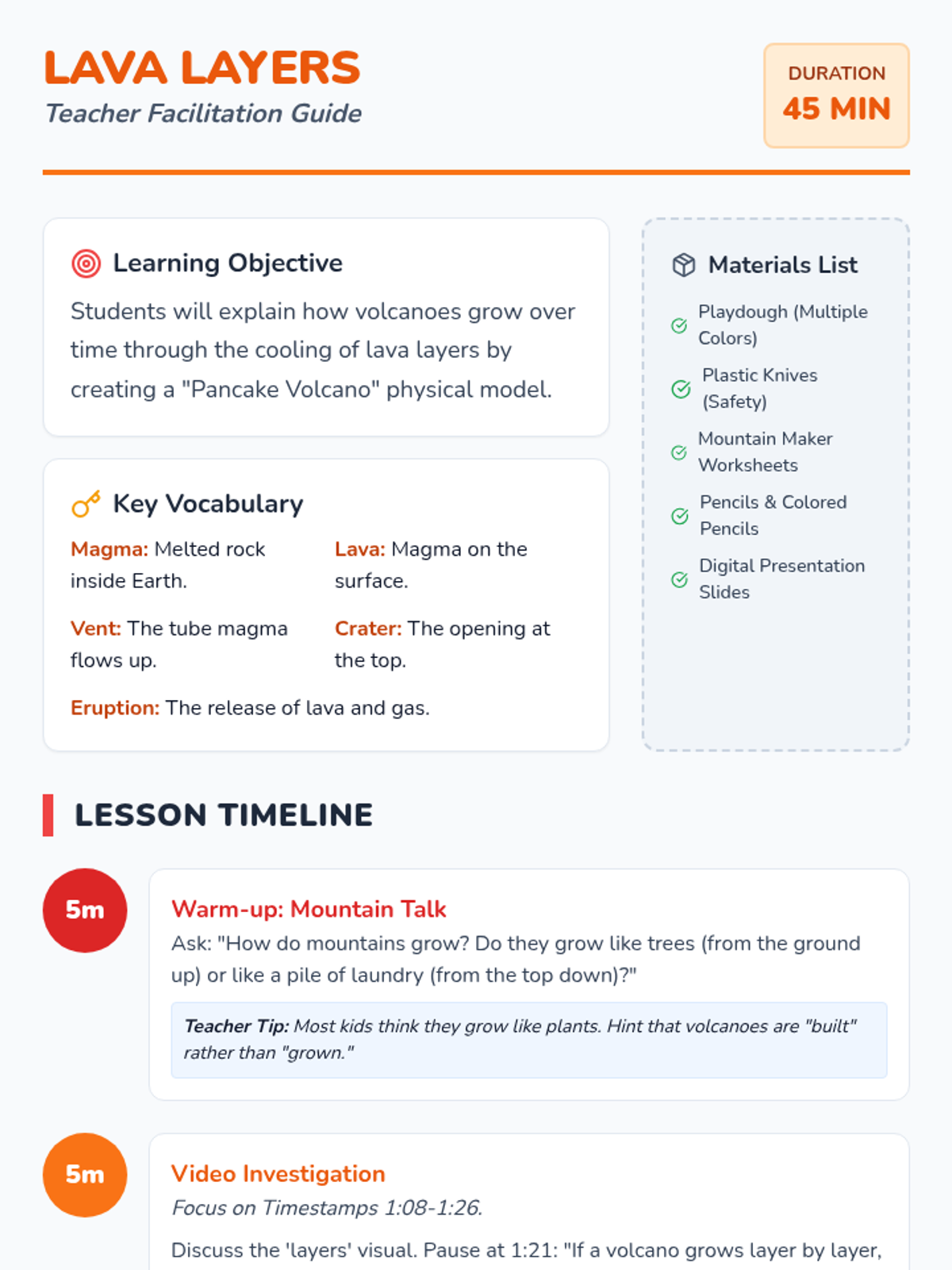 A lesson sequence exploring how volcanoes grow through the accumulation and cooling of lava layers, featuring hands-on modeling and visual analysis.