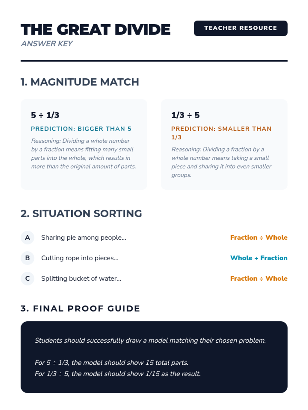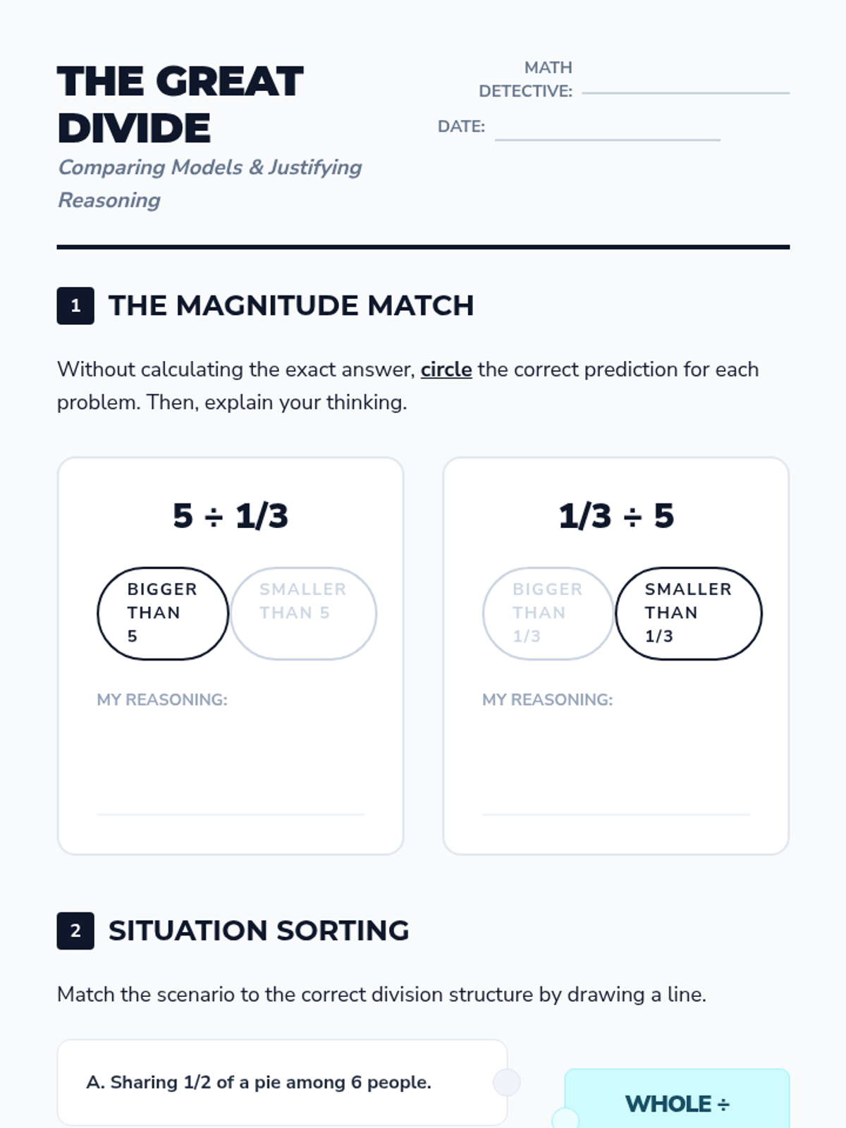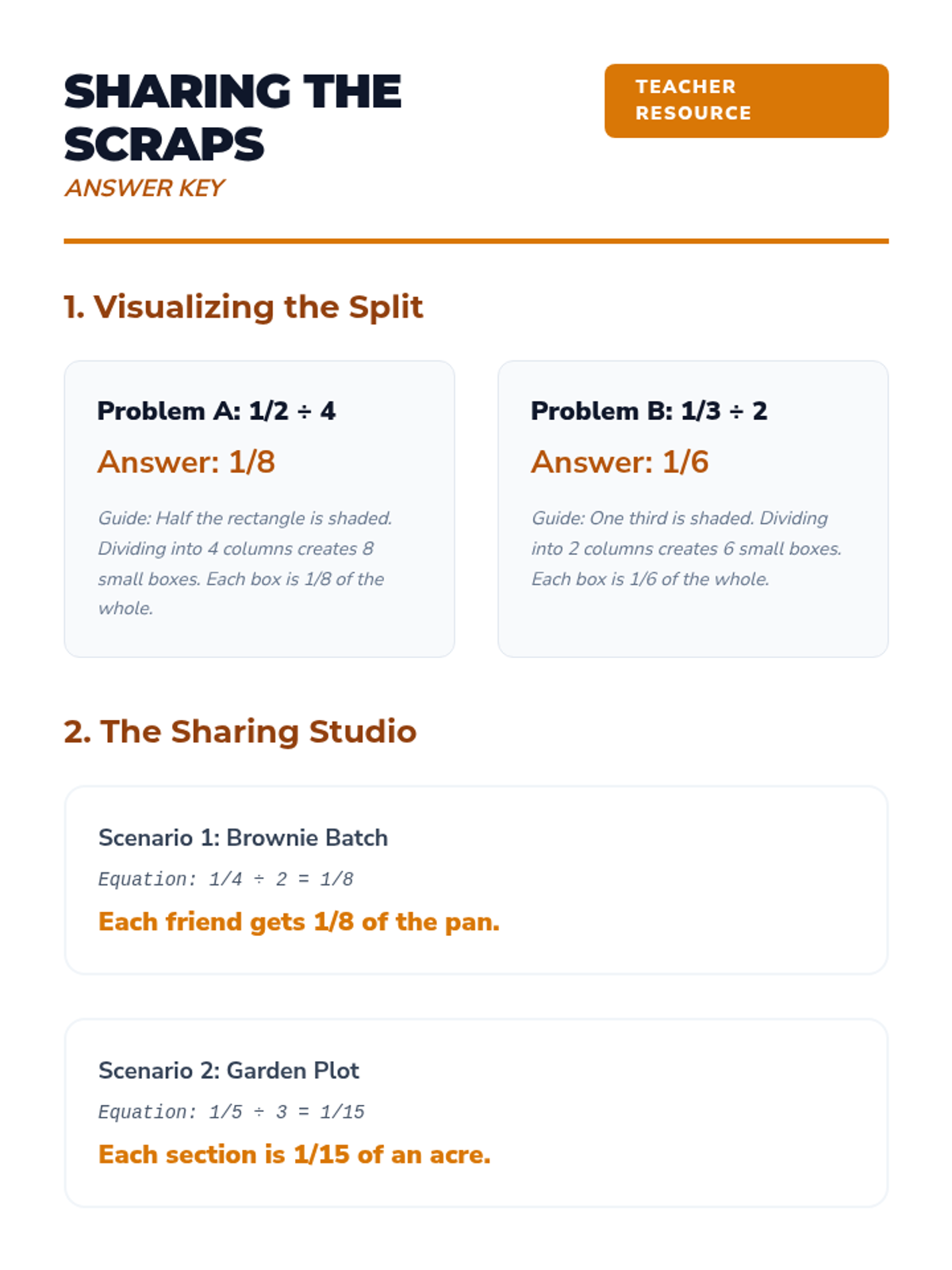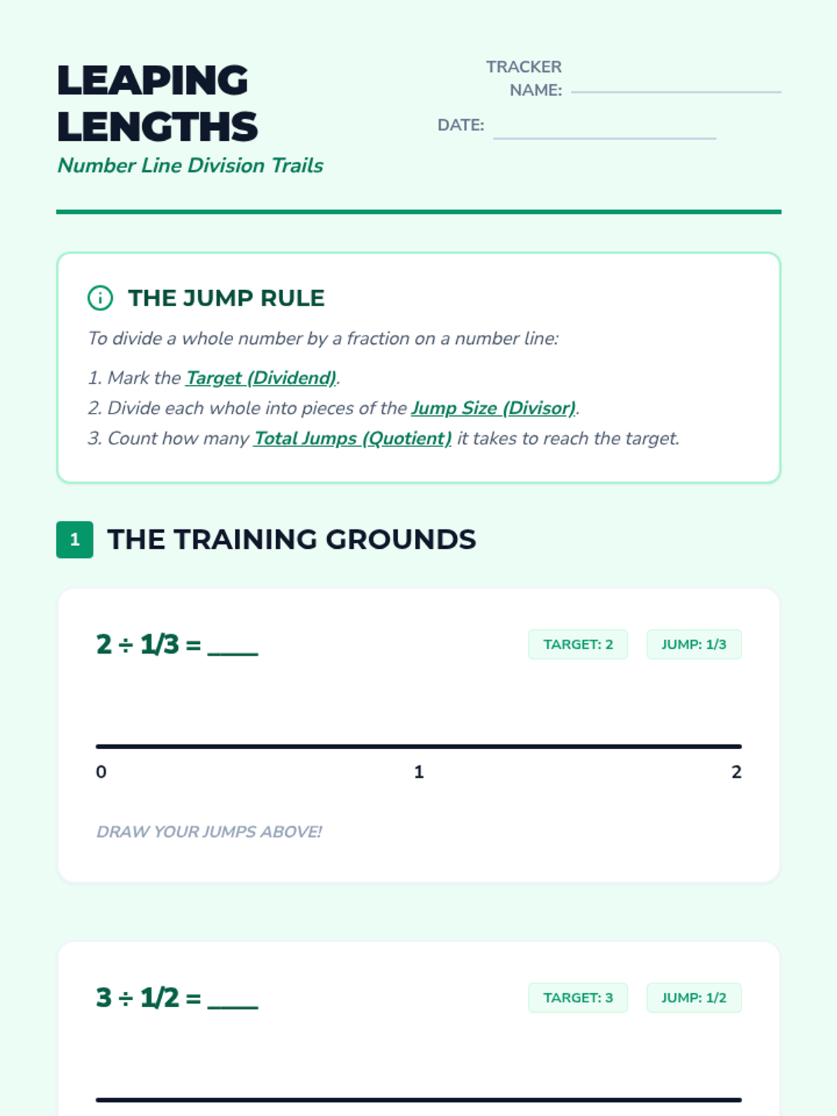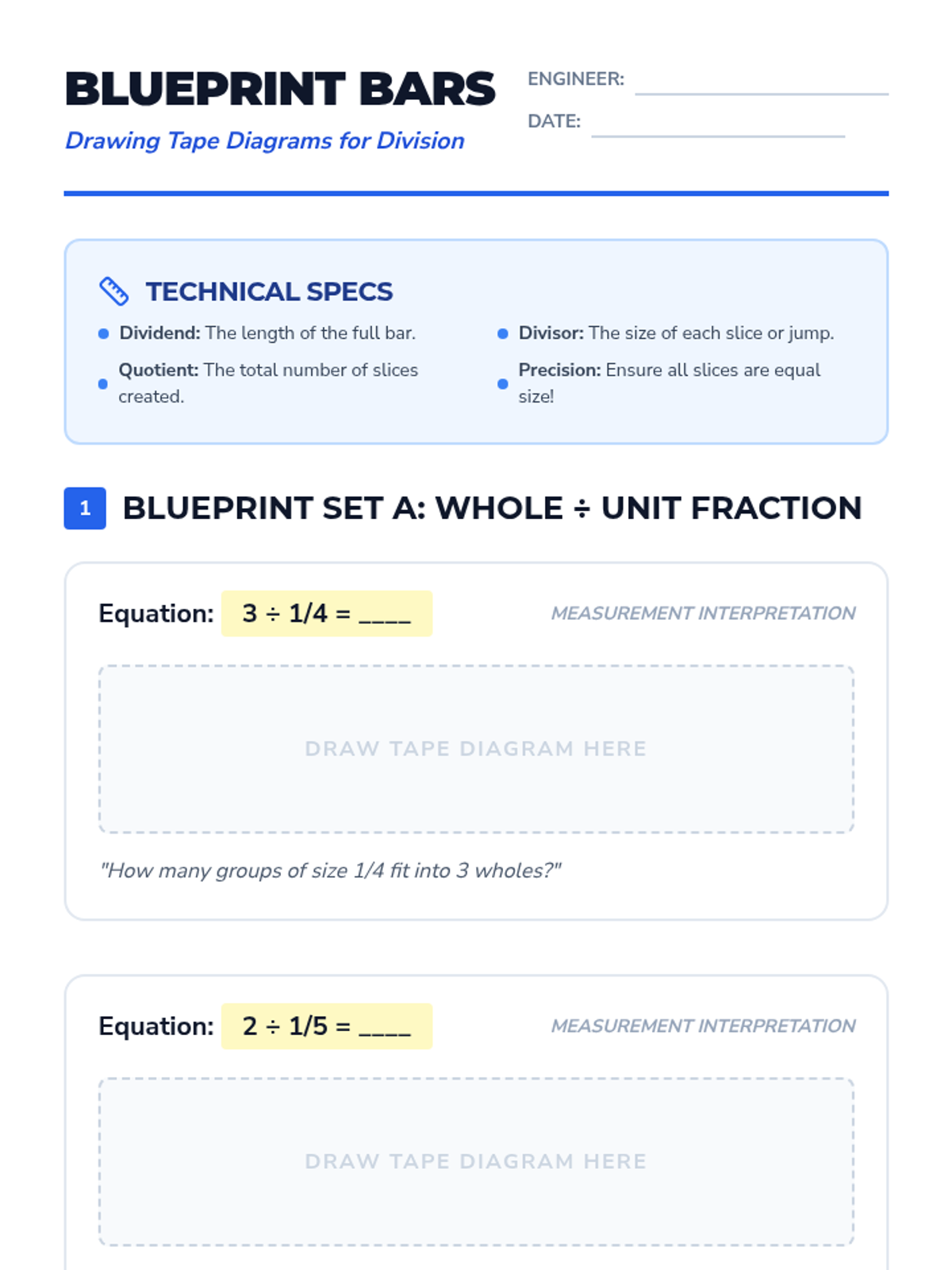 This sequence builds a strong conceptual foundation for fraction division by using visual models (tape diagrams, number lines, area models) before introducing algorithms. Students explore dividing whole numbers by unit fractions and vice versa, mastering the 'how many groups' vs 'sharing' interpretations of division.