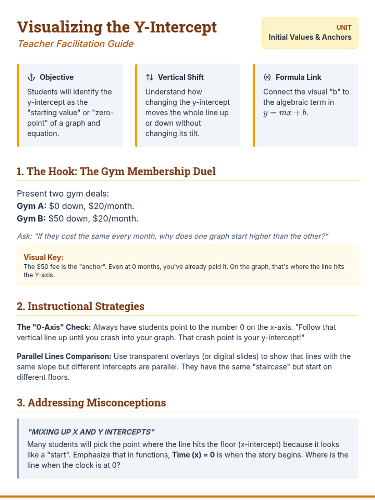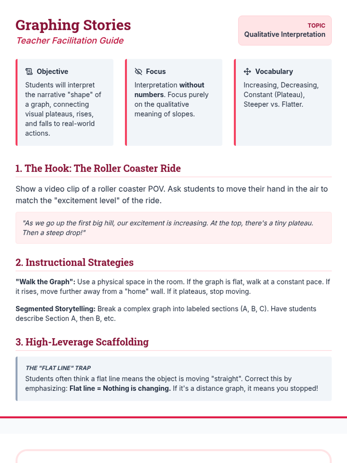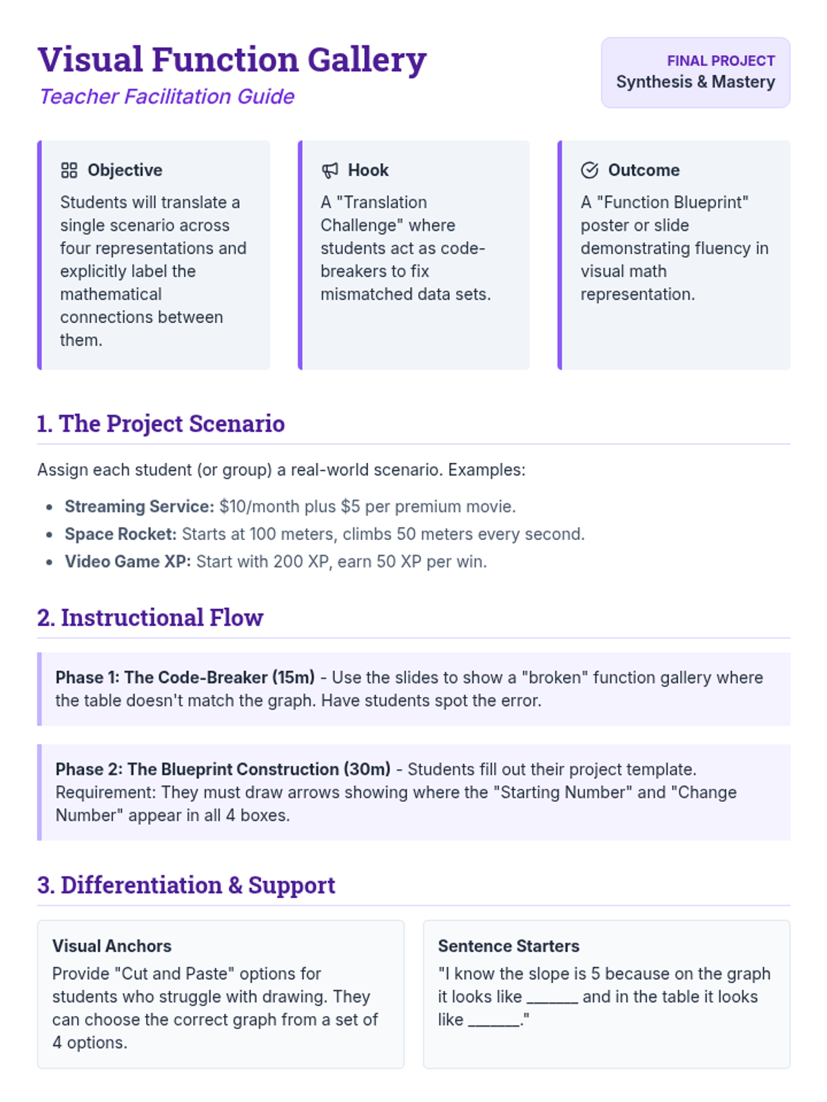 This sequence uses visual tools like double number lines, slope triangles, and coordinate overlays to help 8th-grade students understand functions and rates of change. It provides concrete representations for abstract algebraic concepts, supporting students who benefit from visual and spatial reasoning.