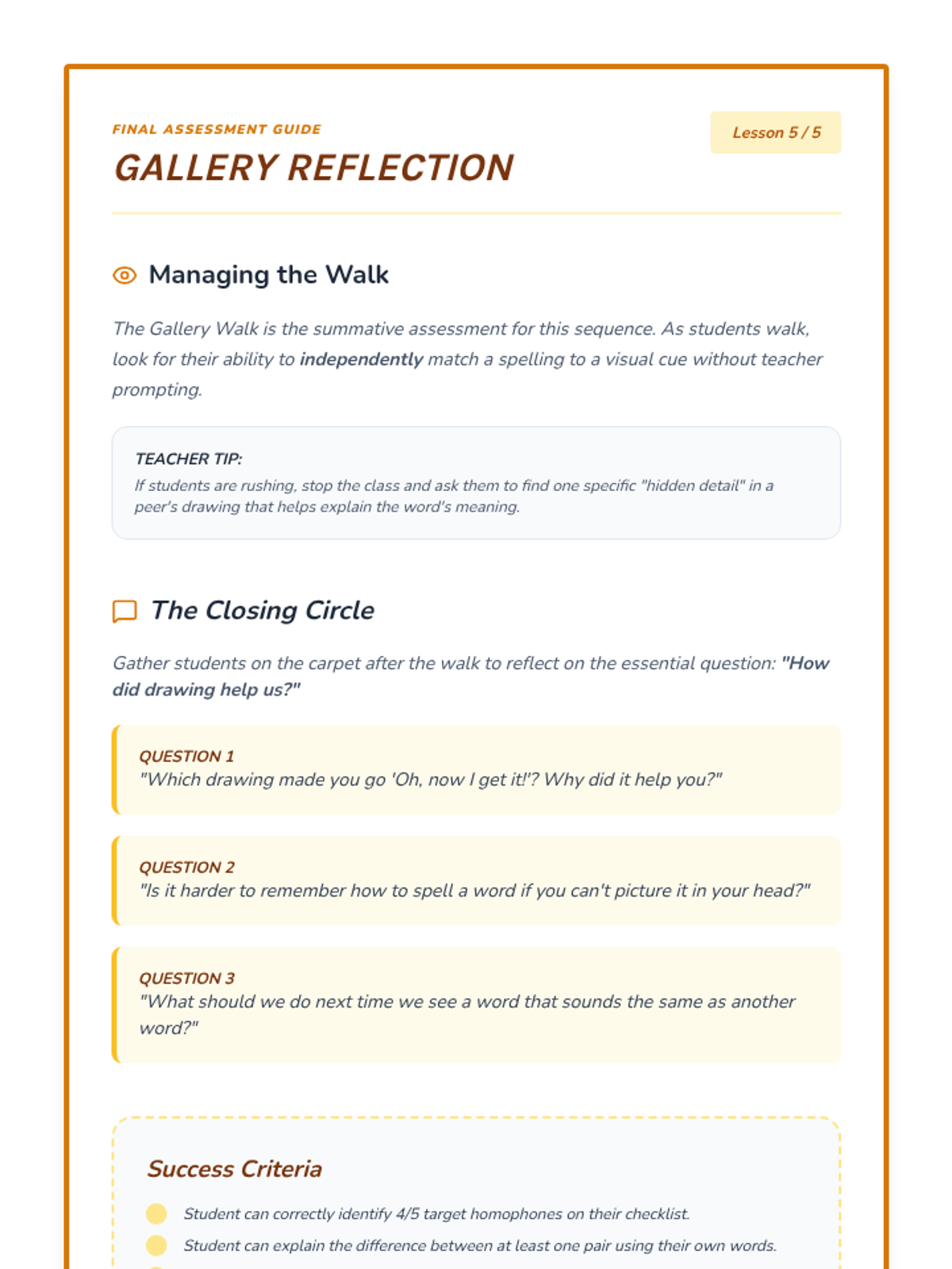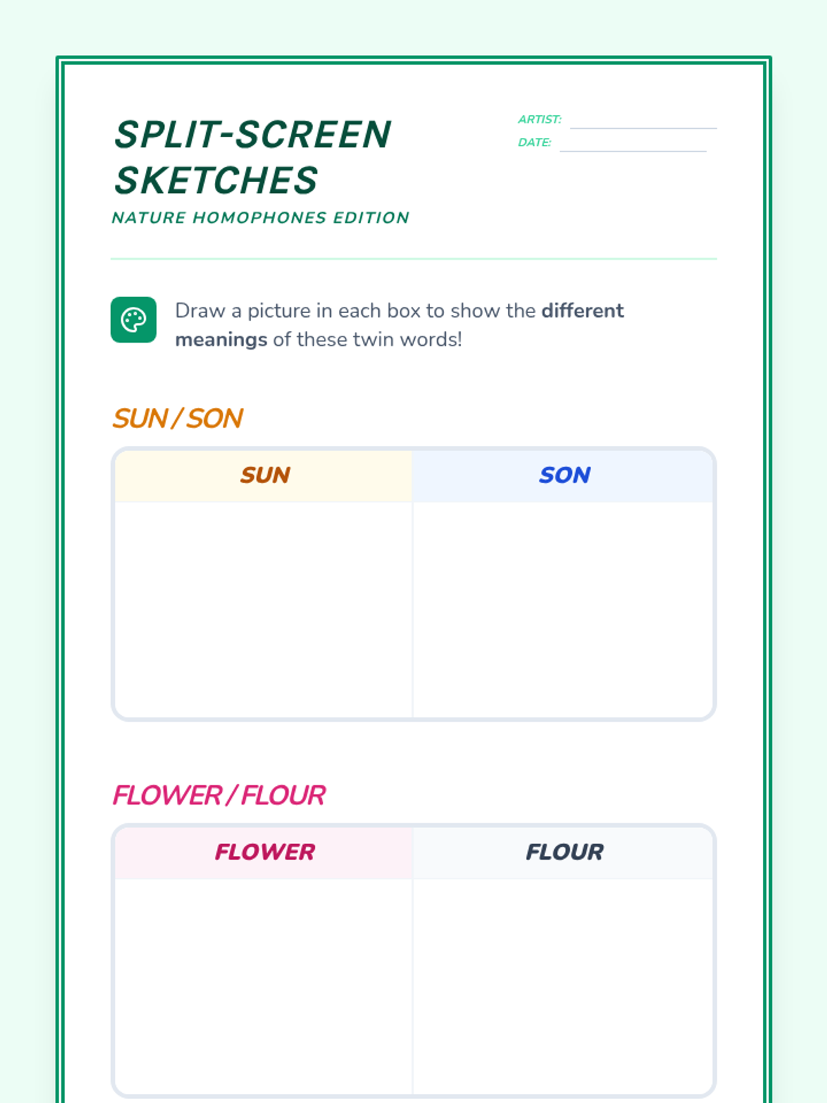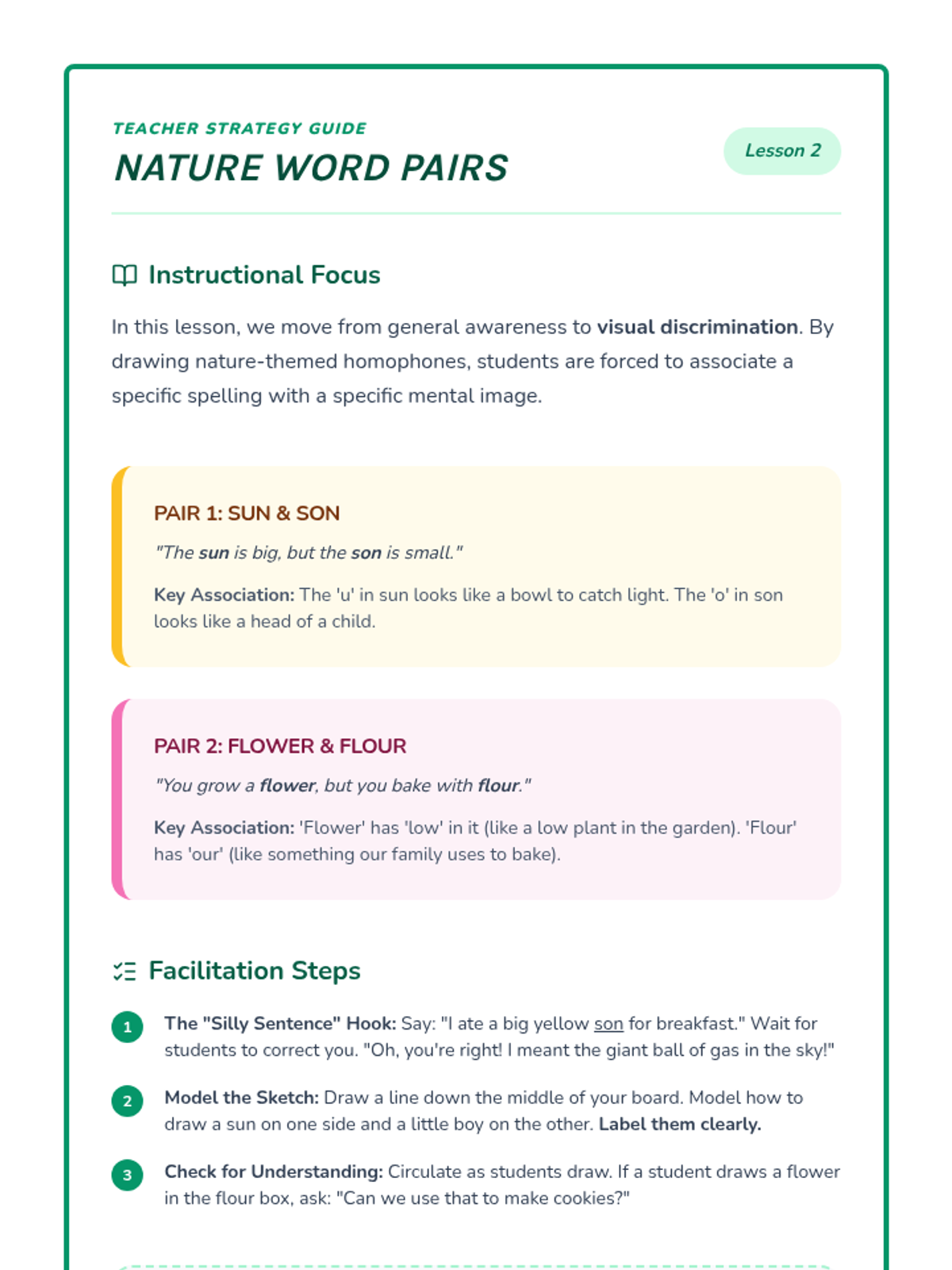 This first-grade sequence introduces homophones through visual art and project-based learning. Students explore common word pairs like 'sun/son', 'flower/flour', and 'bear/bare', creating a 'Homophone Gallery' to solidify their understanding of how spelling and meaning differ despite identical sounds.