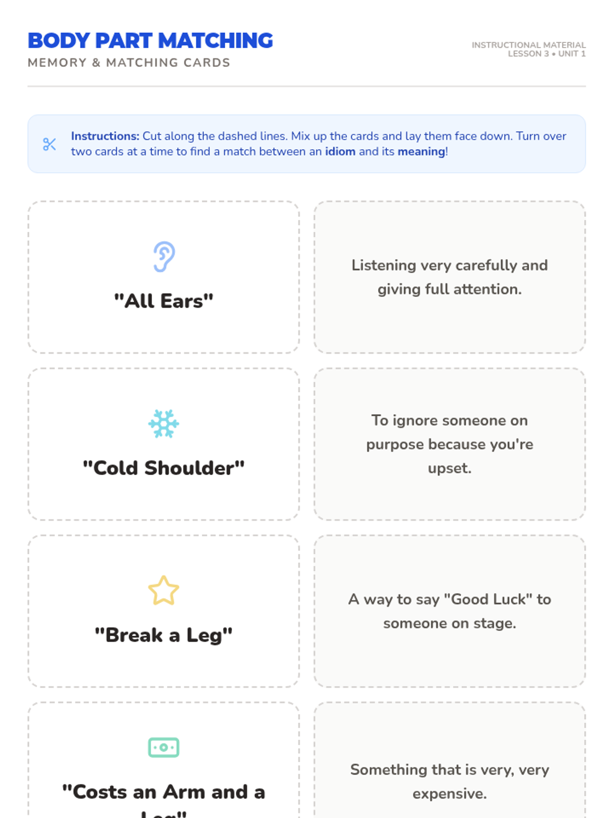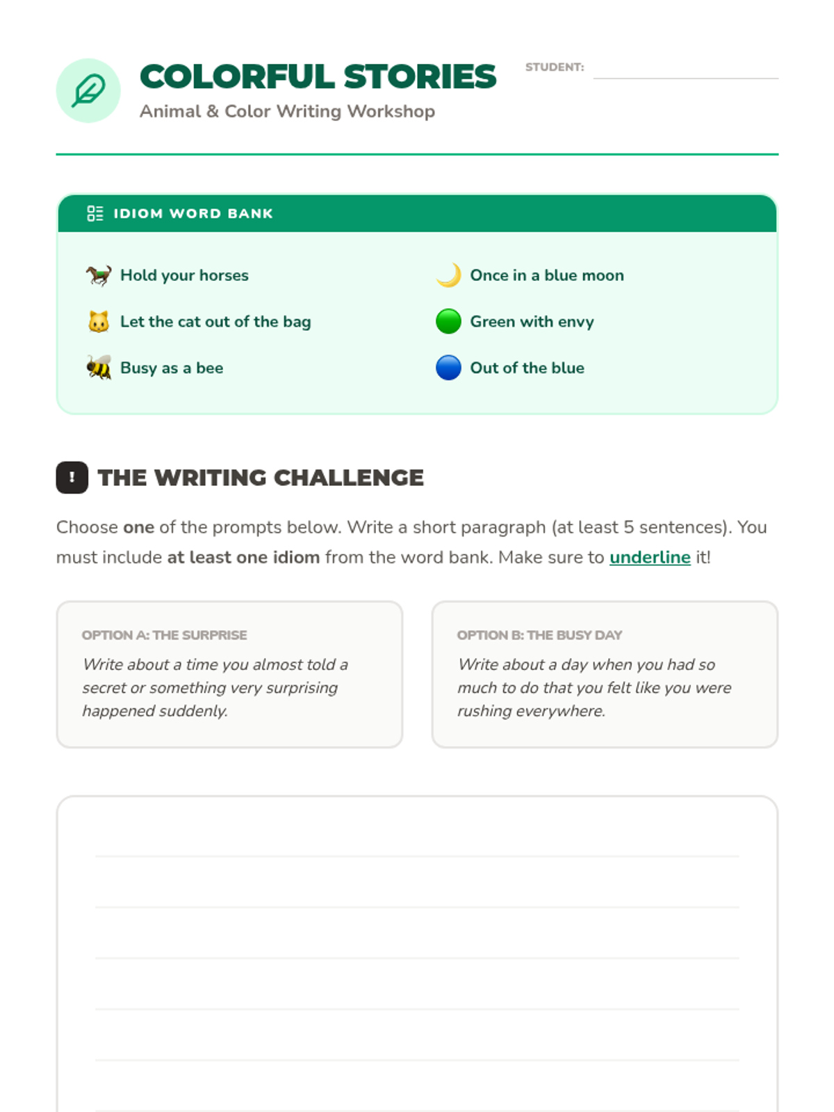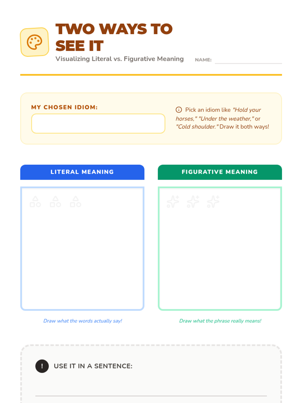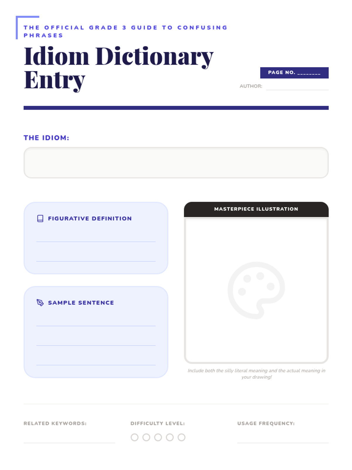 A 5-lesson unit for 3rd grade students exploring the difference between literal and figurative language through the study of common idioms. Students will visualize, analyze, and use idioms in their own writing, culminating in a class idiom dictionary.
