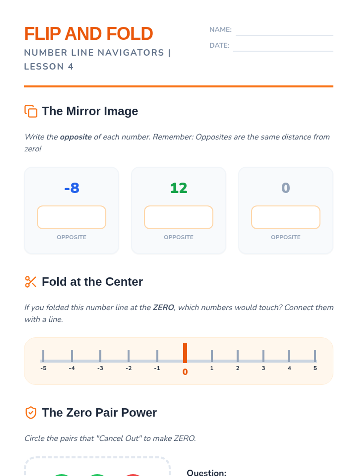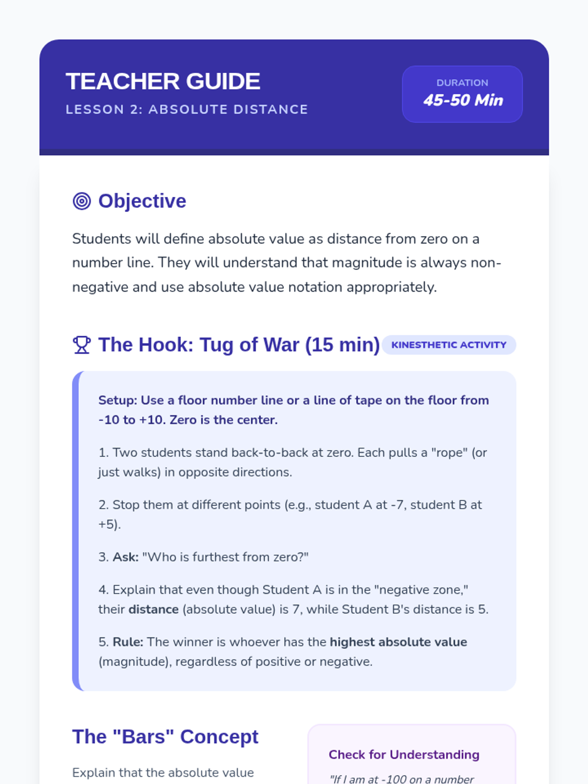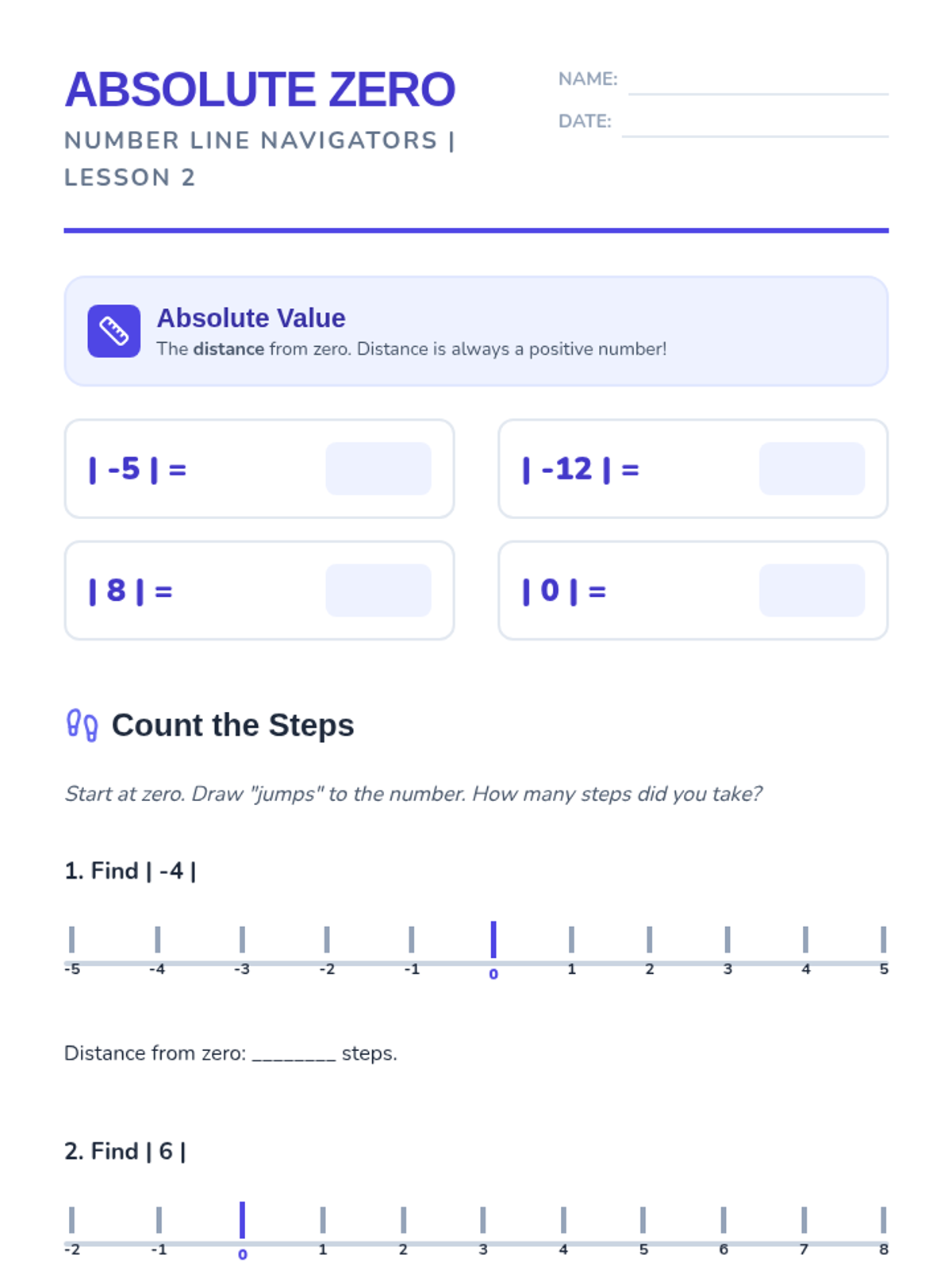 A sequence focused on visual representations of integers, absolute value, and inequalities using vertical and horizontal number lines to support 6th-grade academic support students.