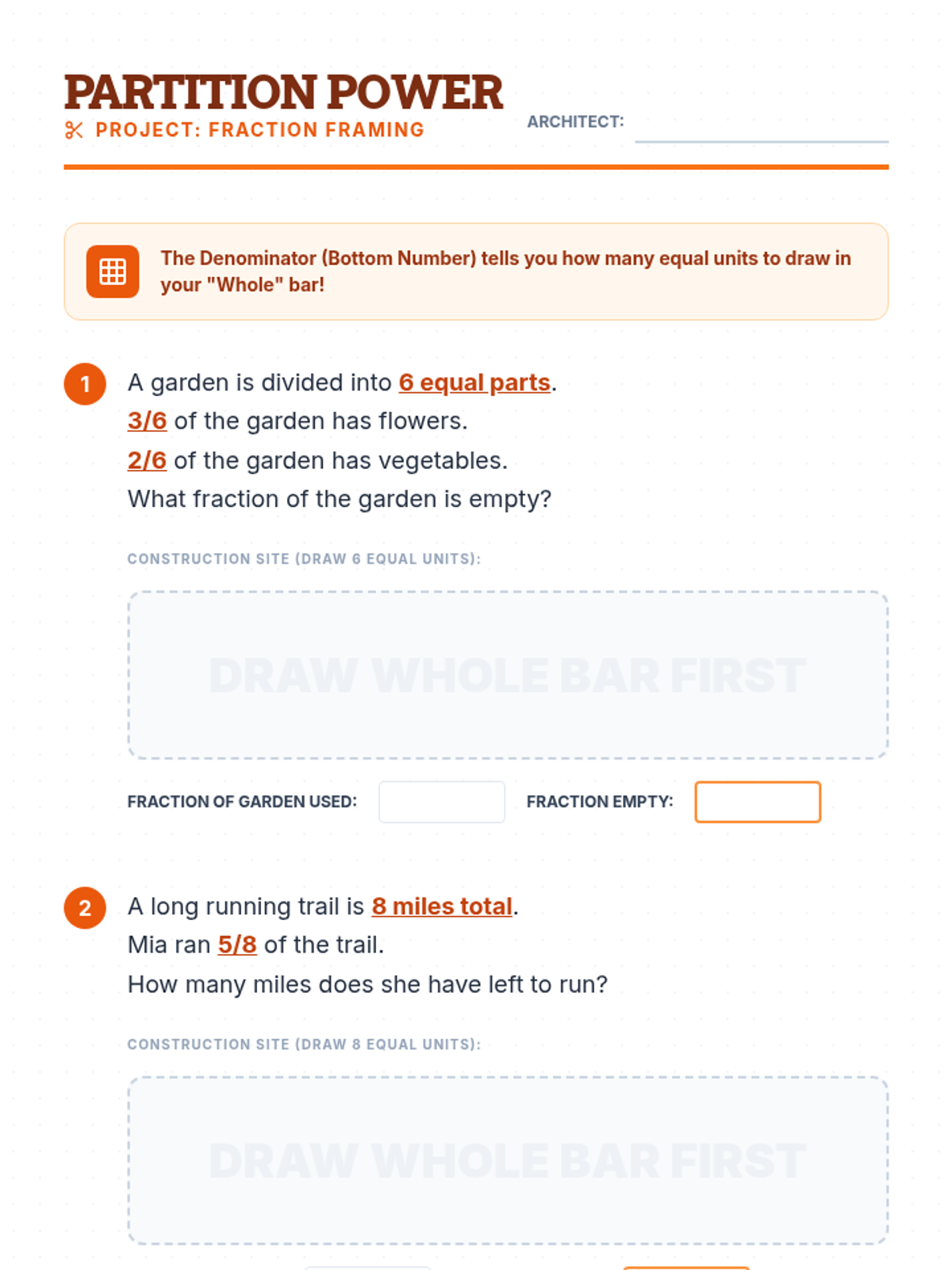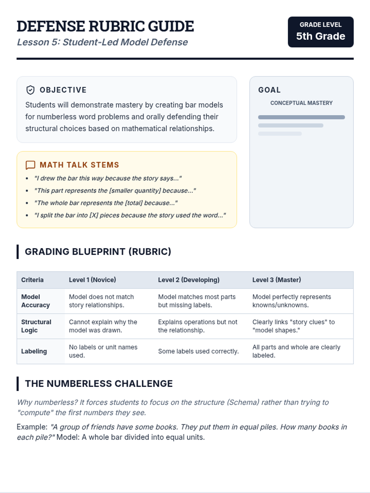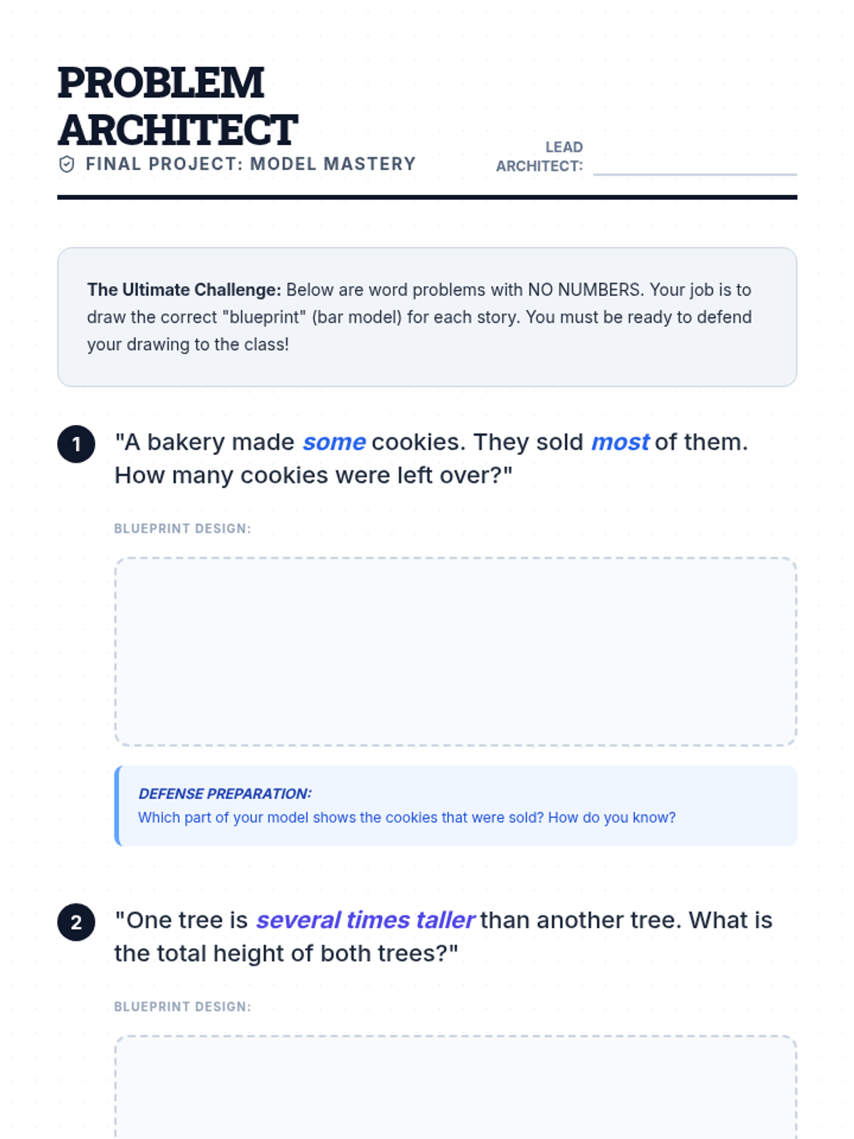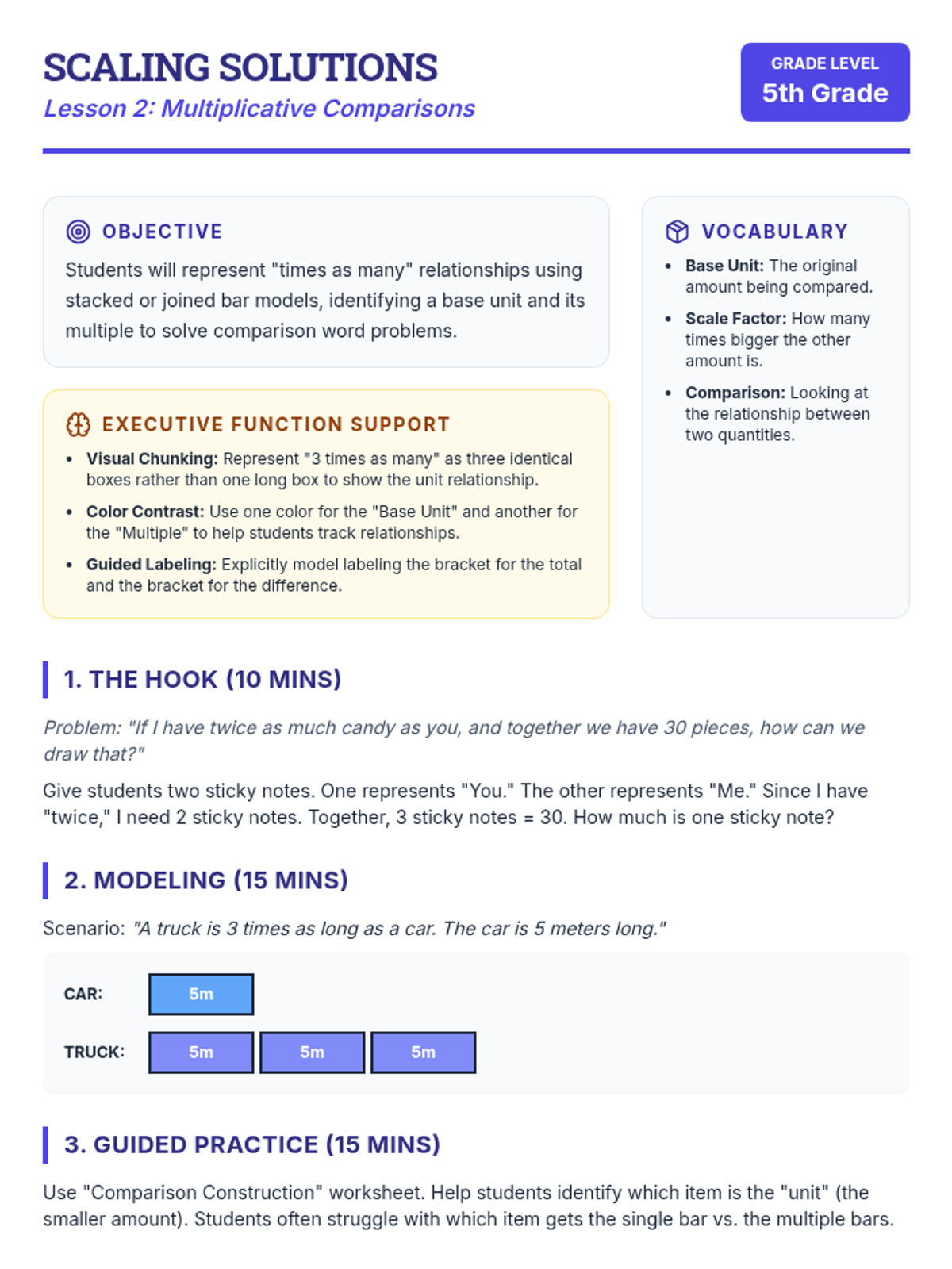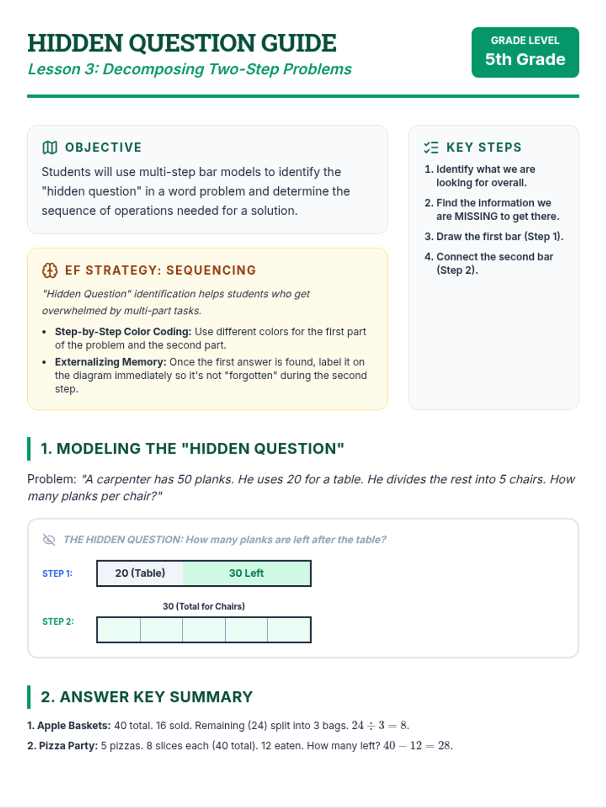 A sequence focused on using bar models to visualize and solve complex math problems, specifically designed for students needing academic support in executive functioning and working memory. Students progress from concrete block representations to abstract multi-step problem decomposition.