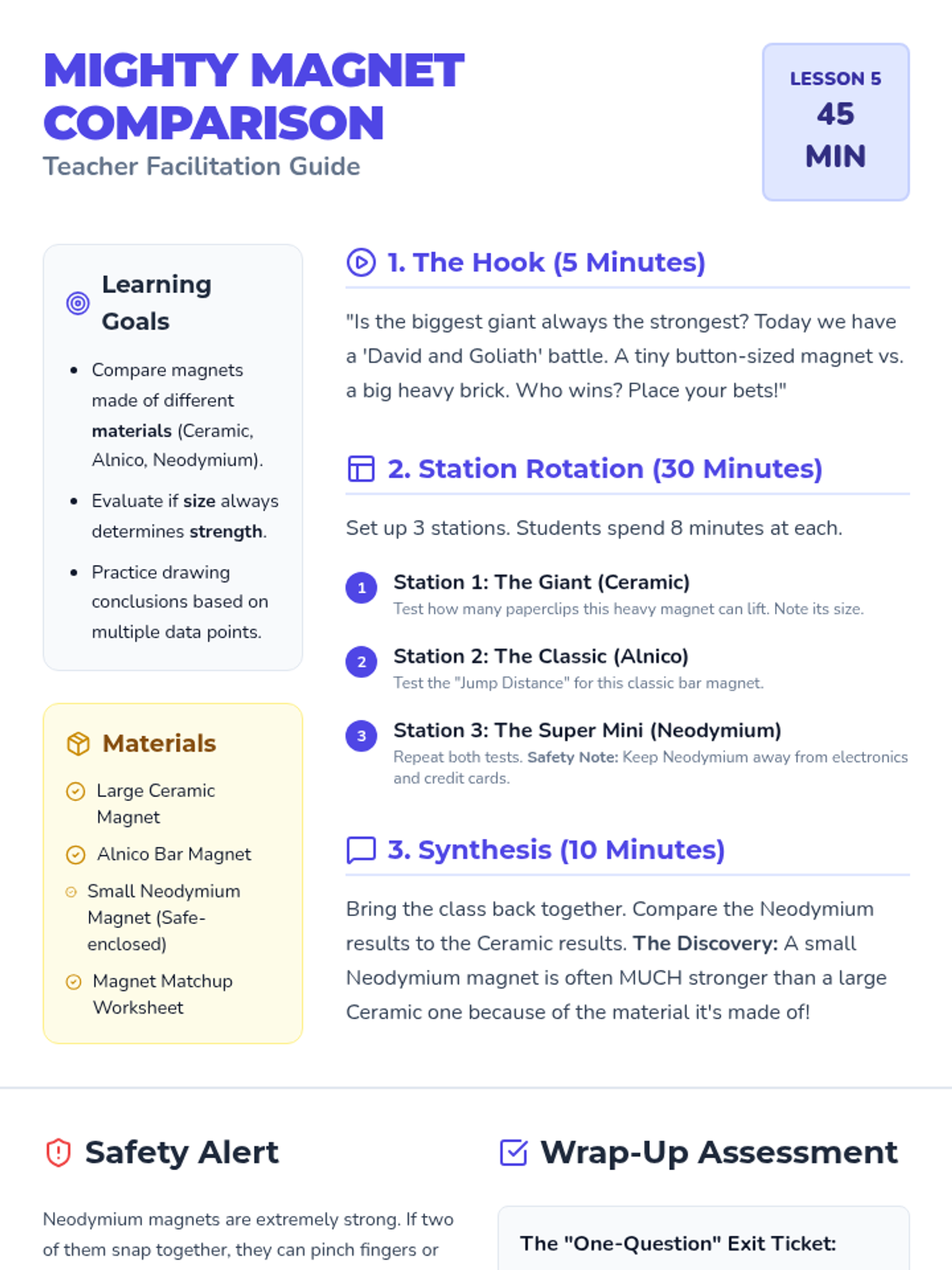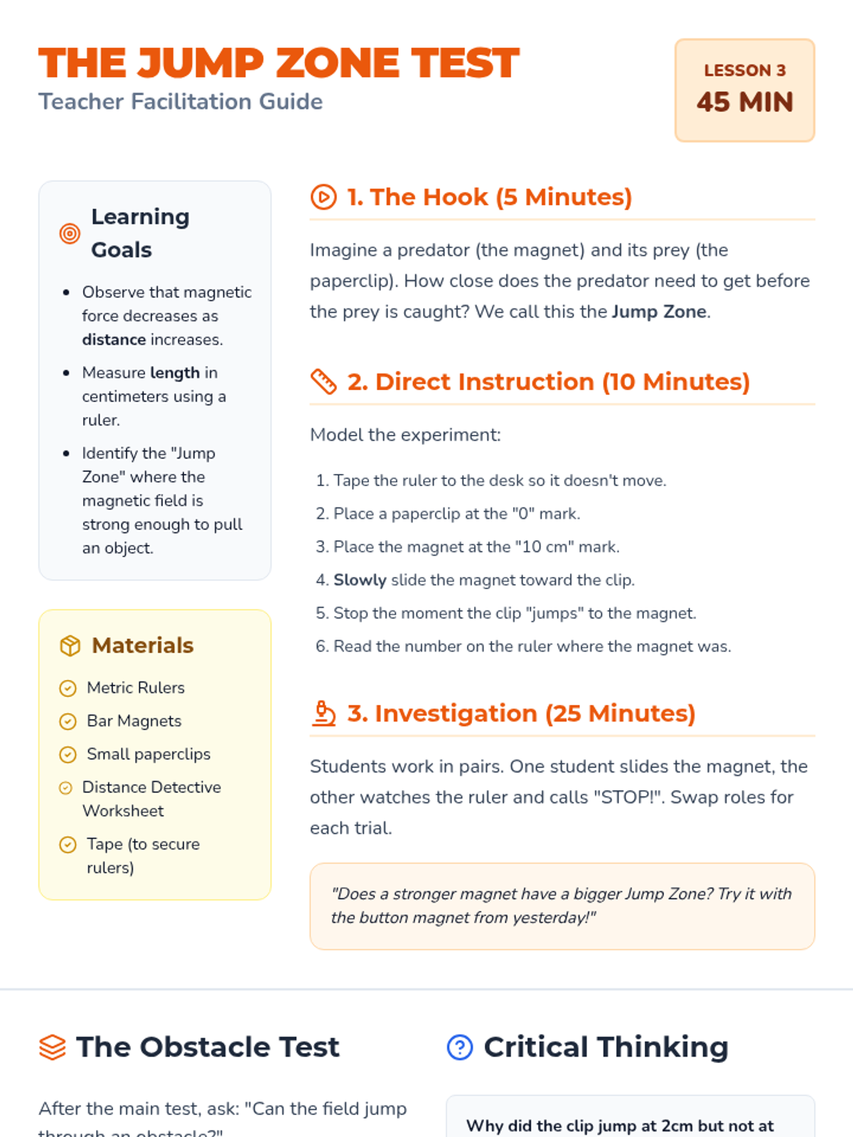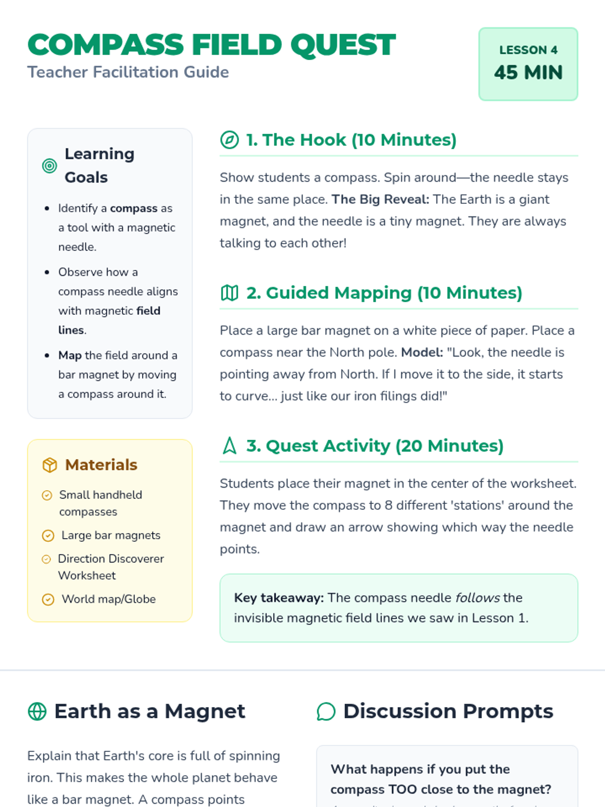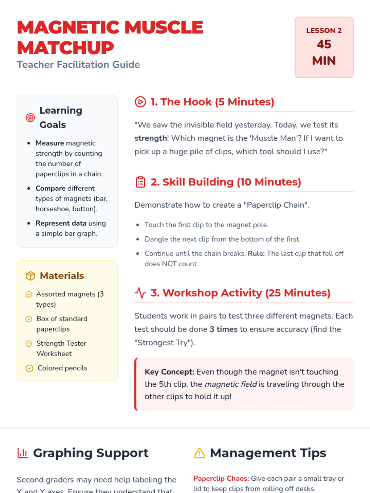 This 5-lesson sequence for 2nd graders focuses on the invisible properties of magnetism. Students move from simple observation of iron filings to measuring magnetic strength, testing the effect of distance, and using compasses to map magnetic fields, concluding with a comparison of different magnet types.