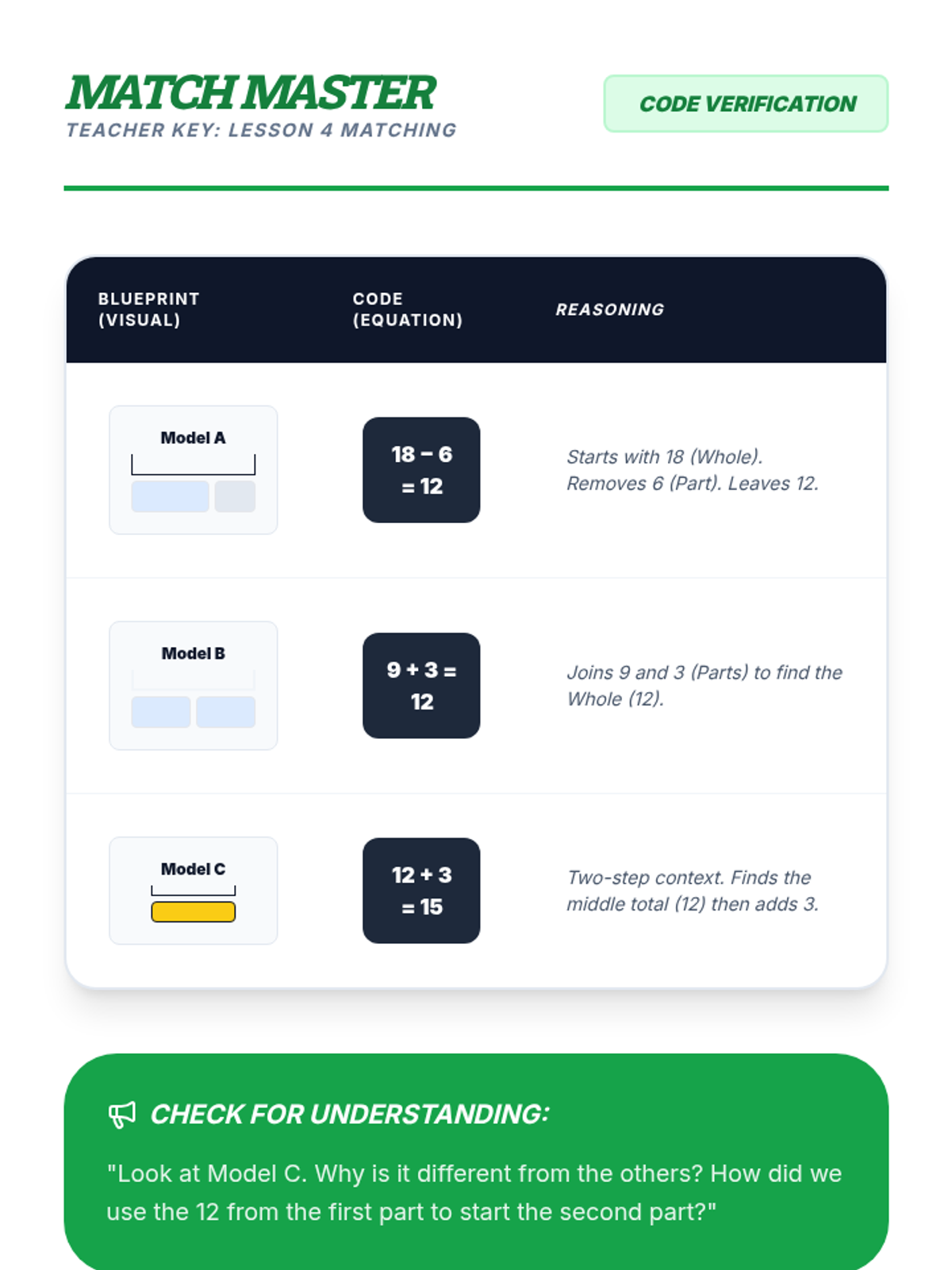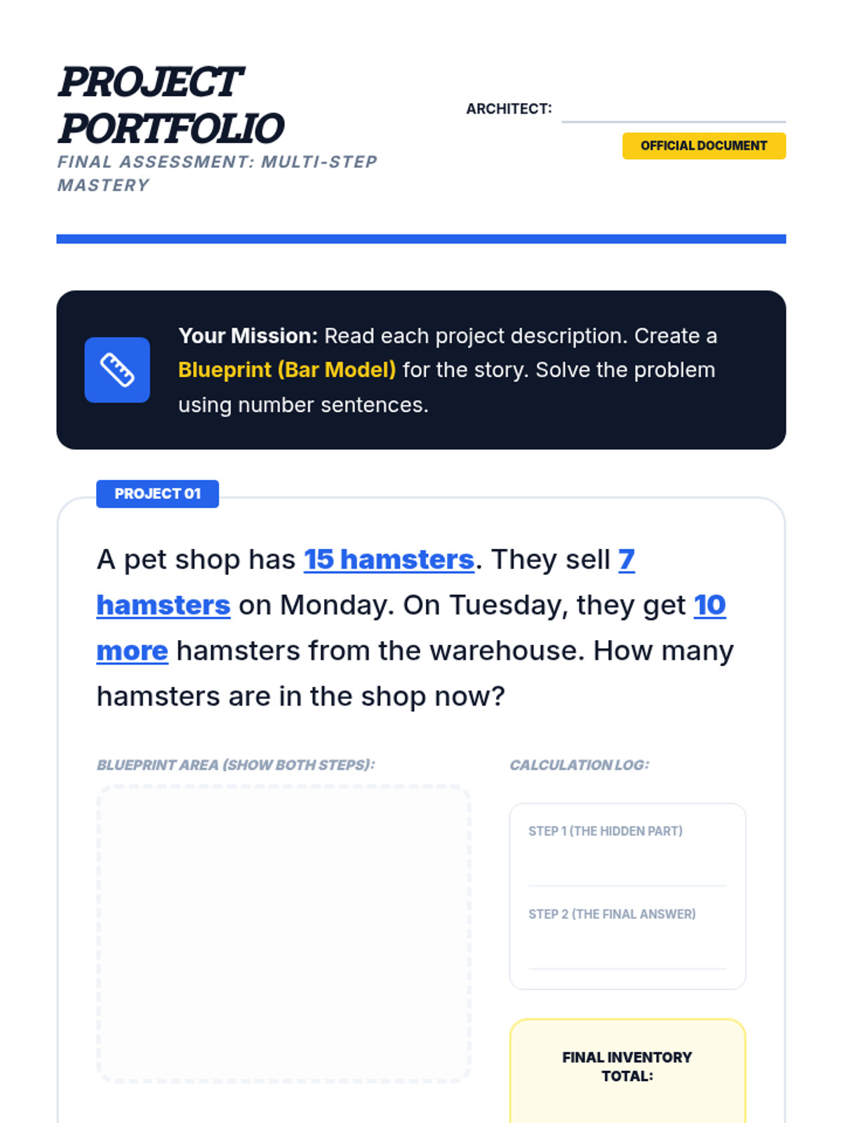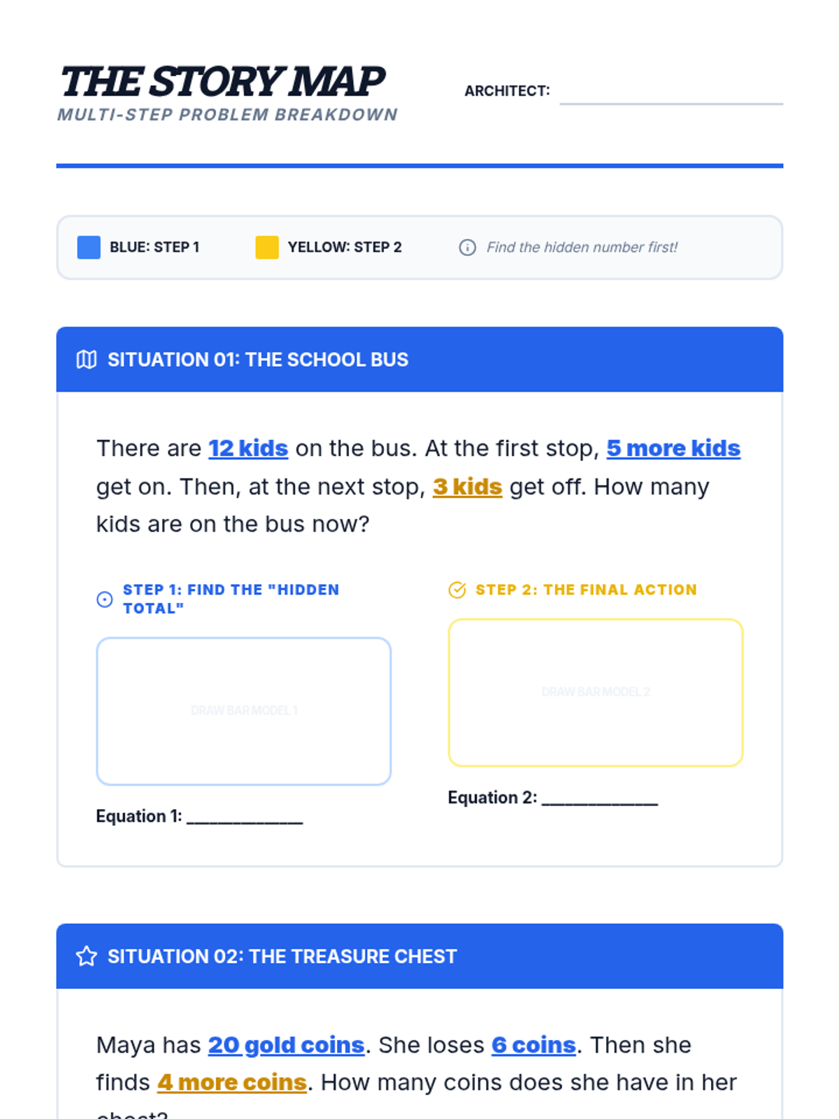 A 3rd-grade special education sequence focused on decomposing multi-step math word problems through visualization techniques. Students progress from physical acting with manipulatives to creating sophisticated bar models for two-step problems.