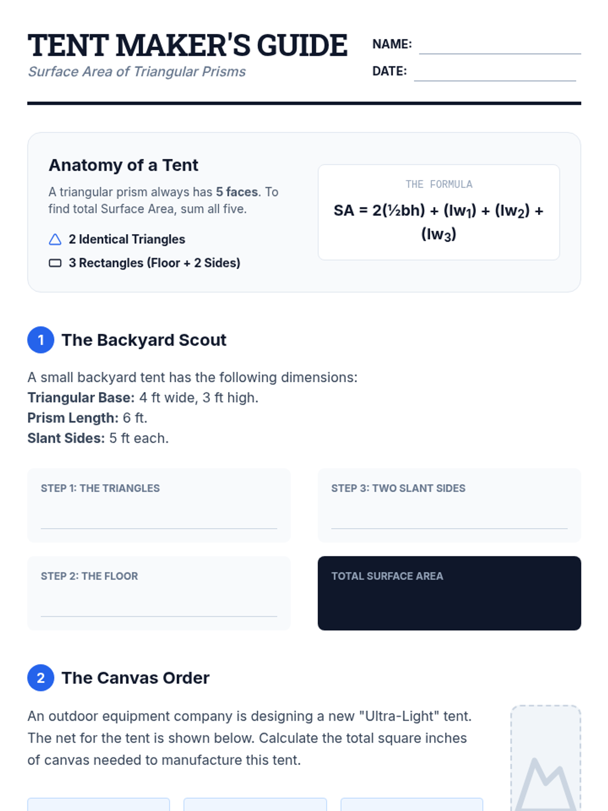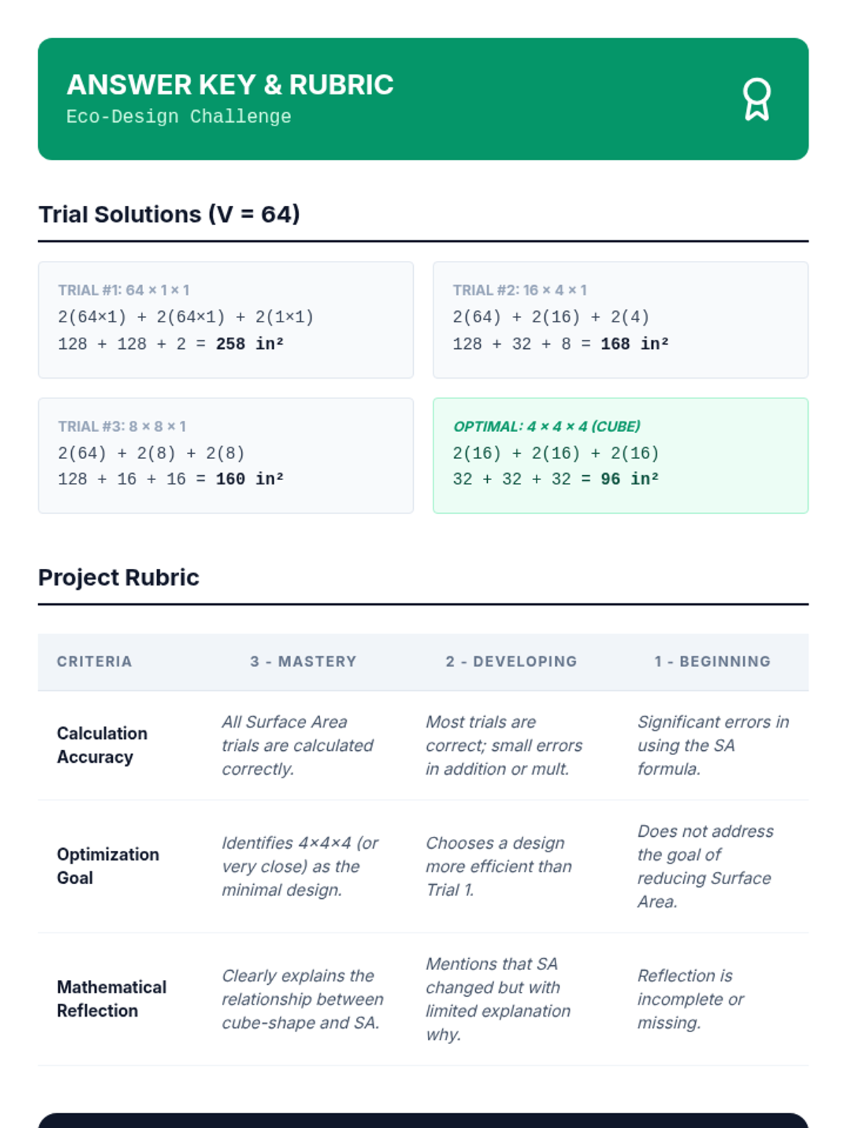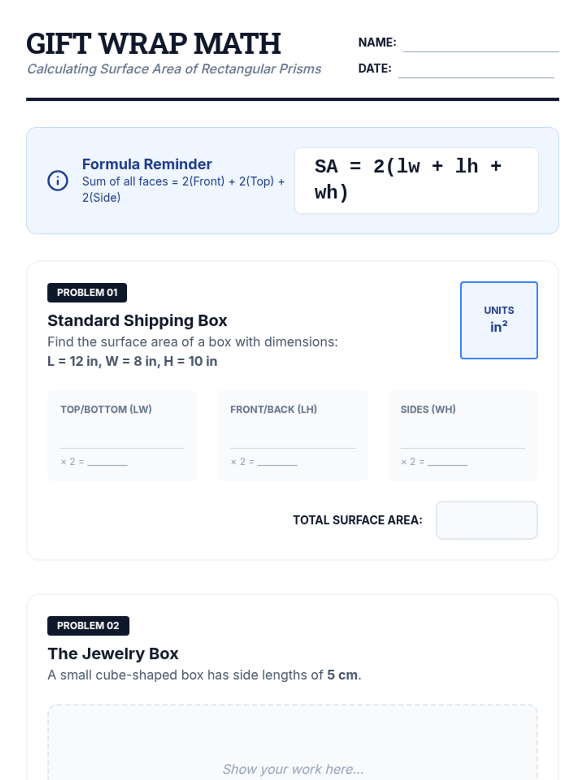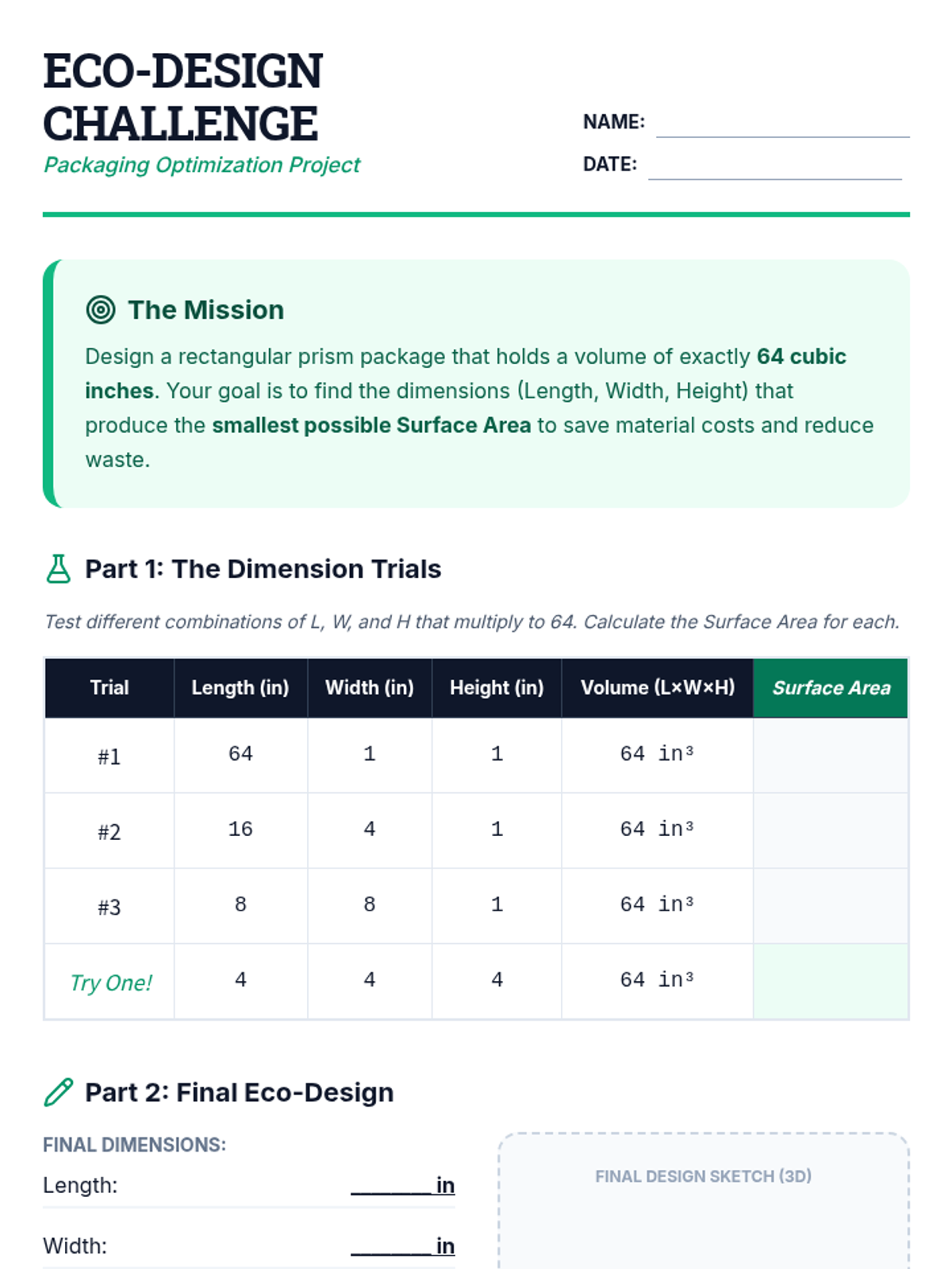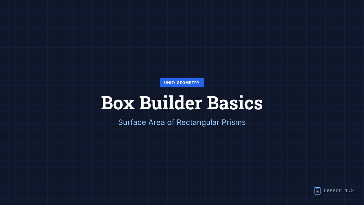 This sequence builds spatial reasoning by connecting 2D nets to 3D surface area. Students move from physical deconstruction of boxes to calculating surface area for rectangular prisms, triangular prisms, and pyramids, culminating in a packaging optimization challenge.