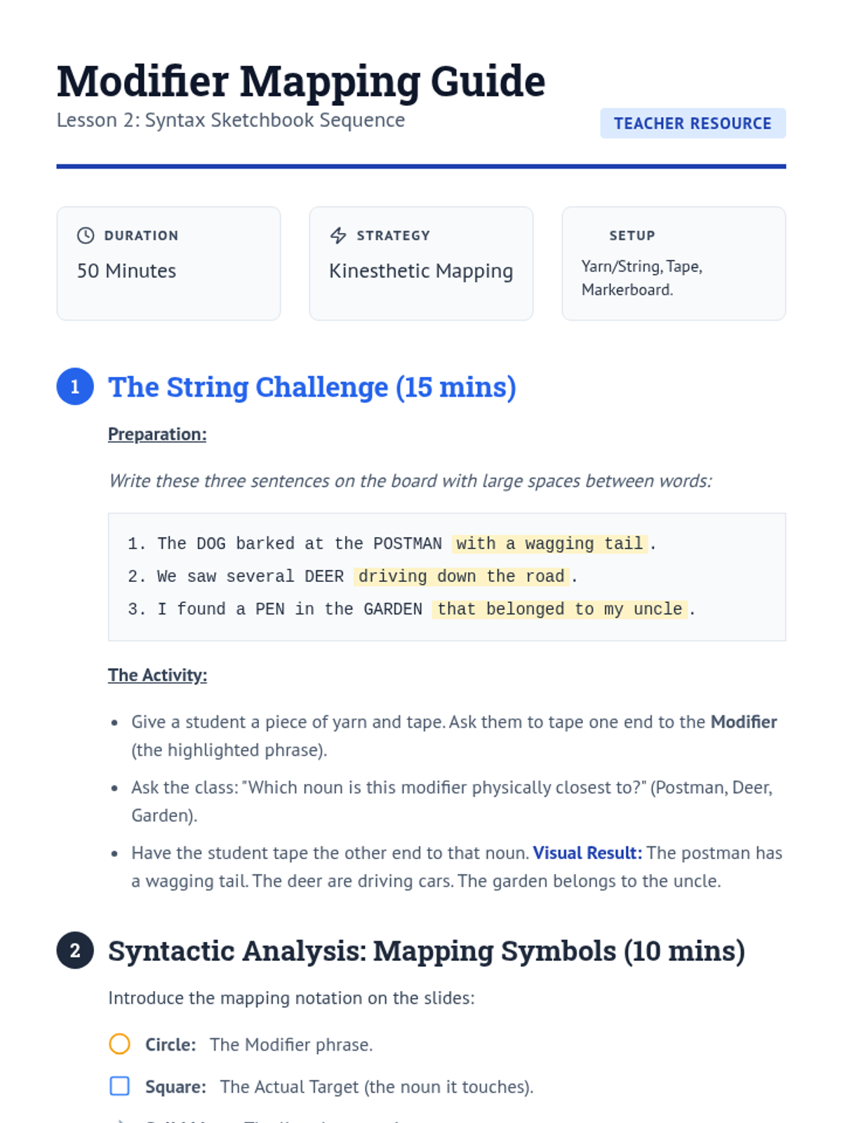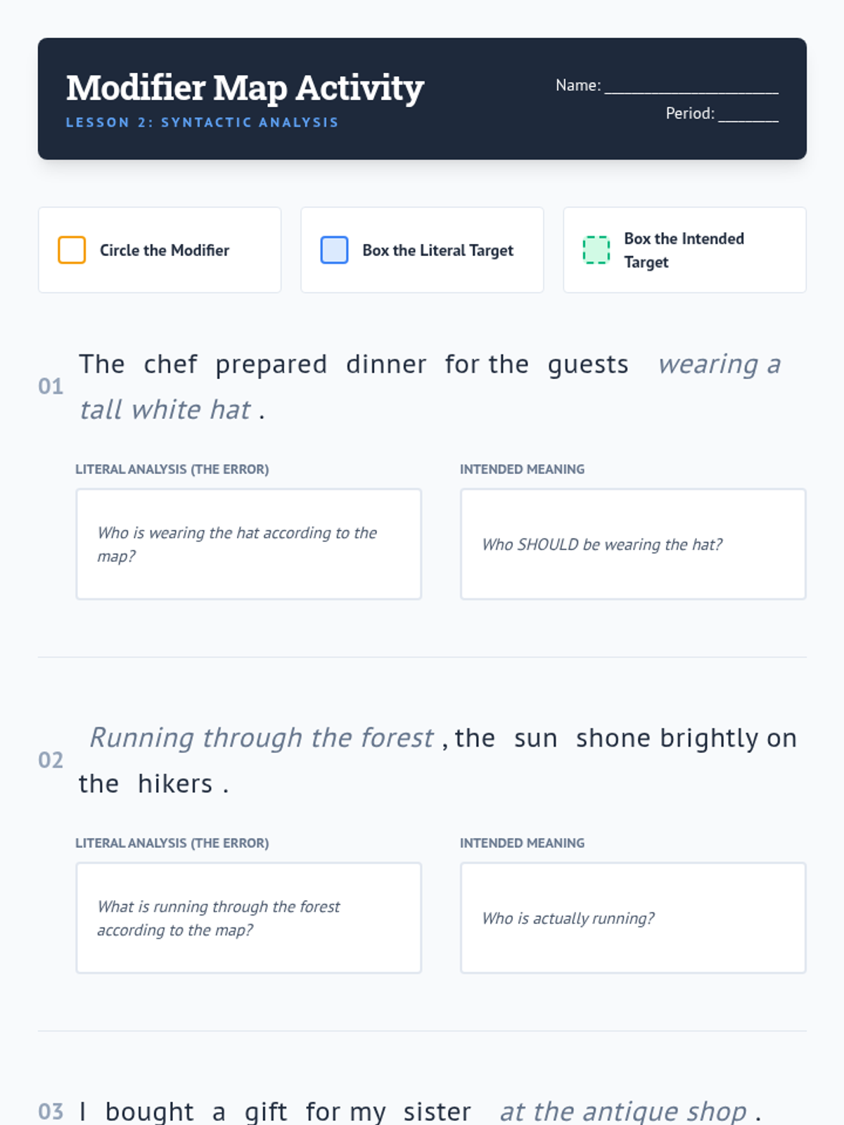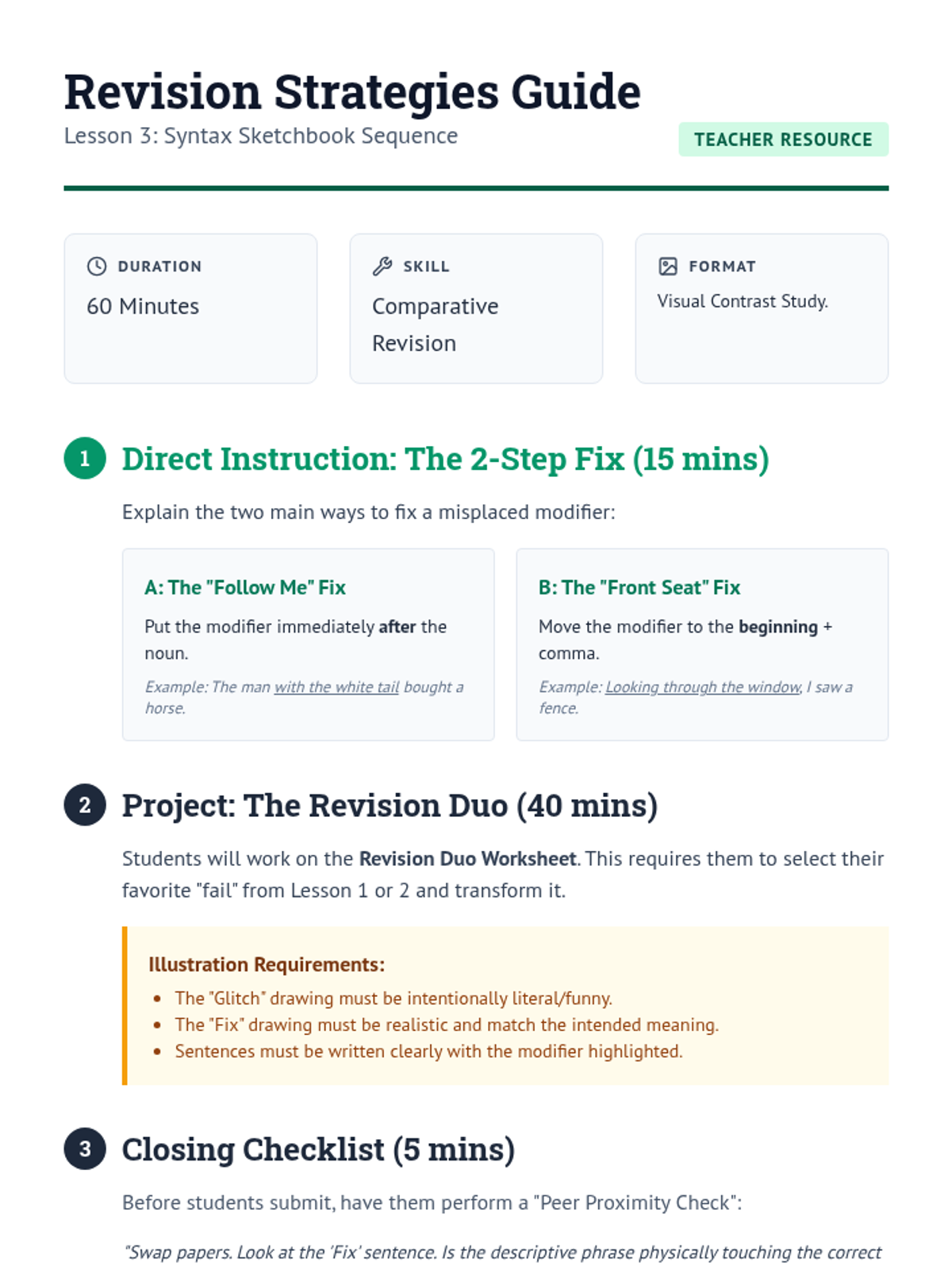 A 5-lesson 6th Grade ELA unit that uses visualization and illustration to help students identify and correct misplaced modifiers, culminating in a gallery walk of 'Before' and 'After' sentence corrections.