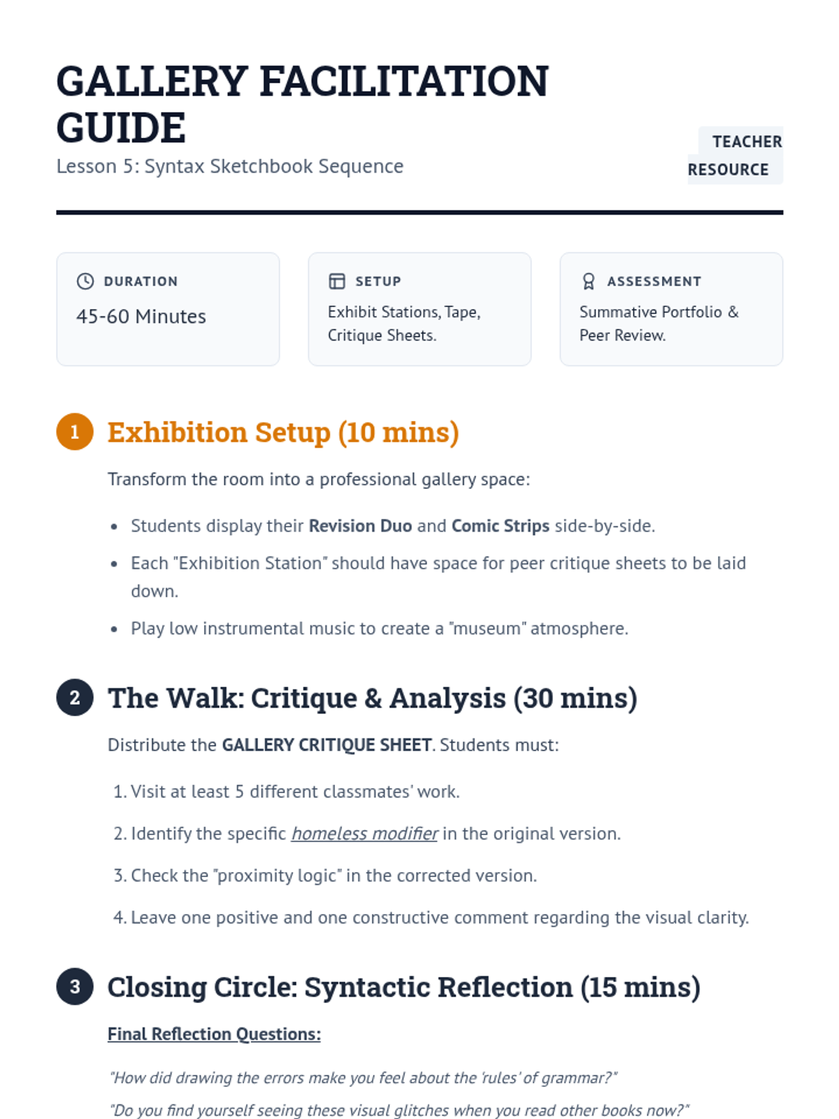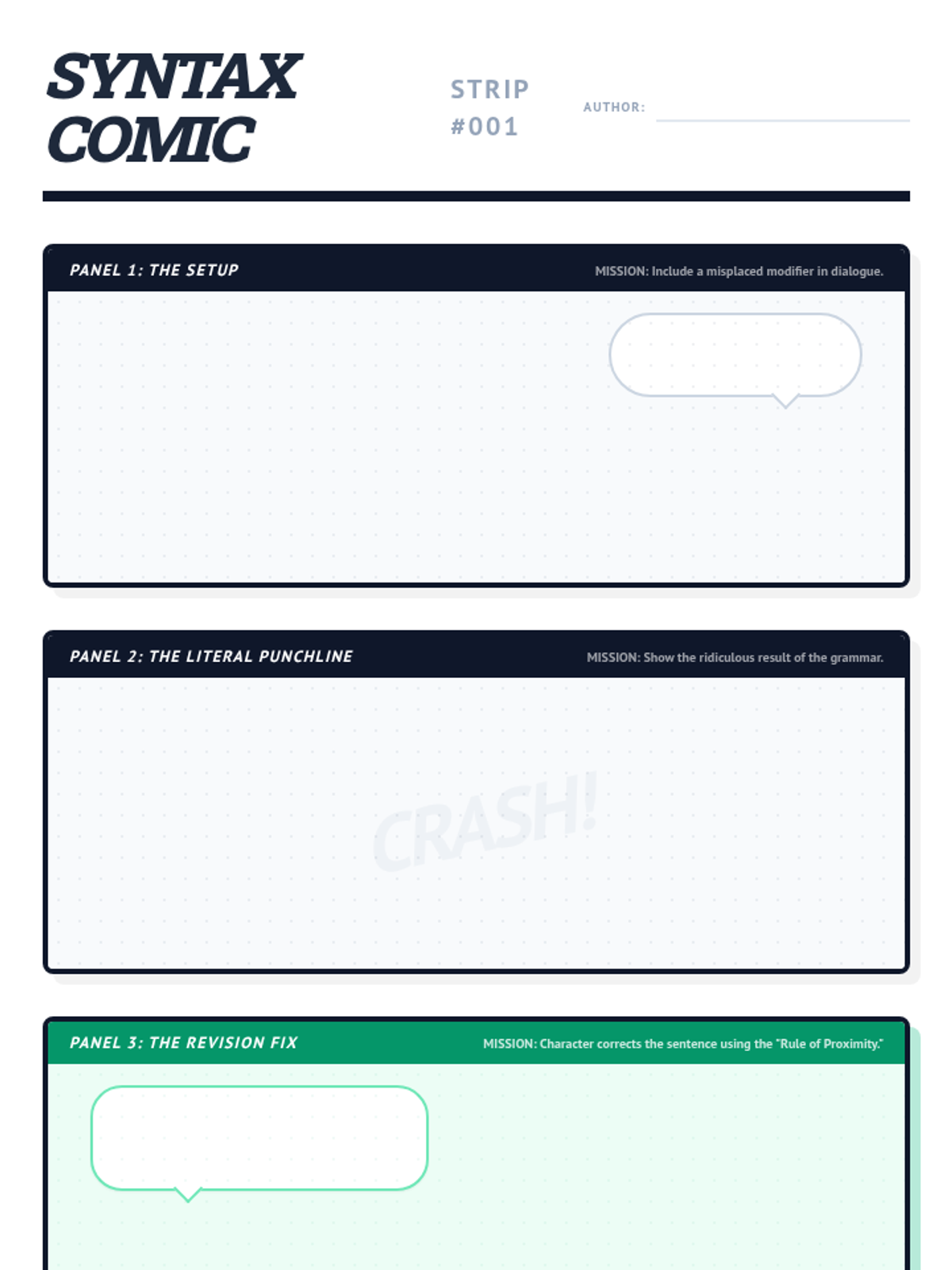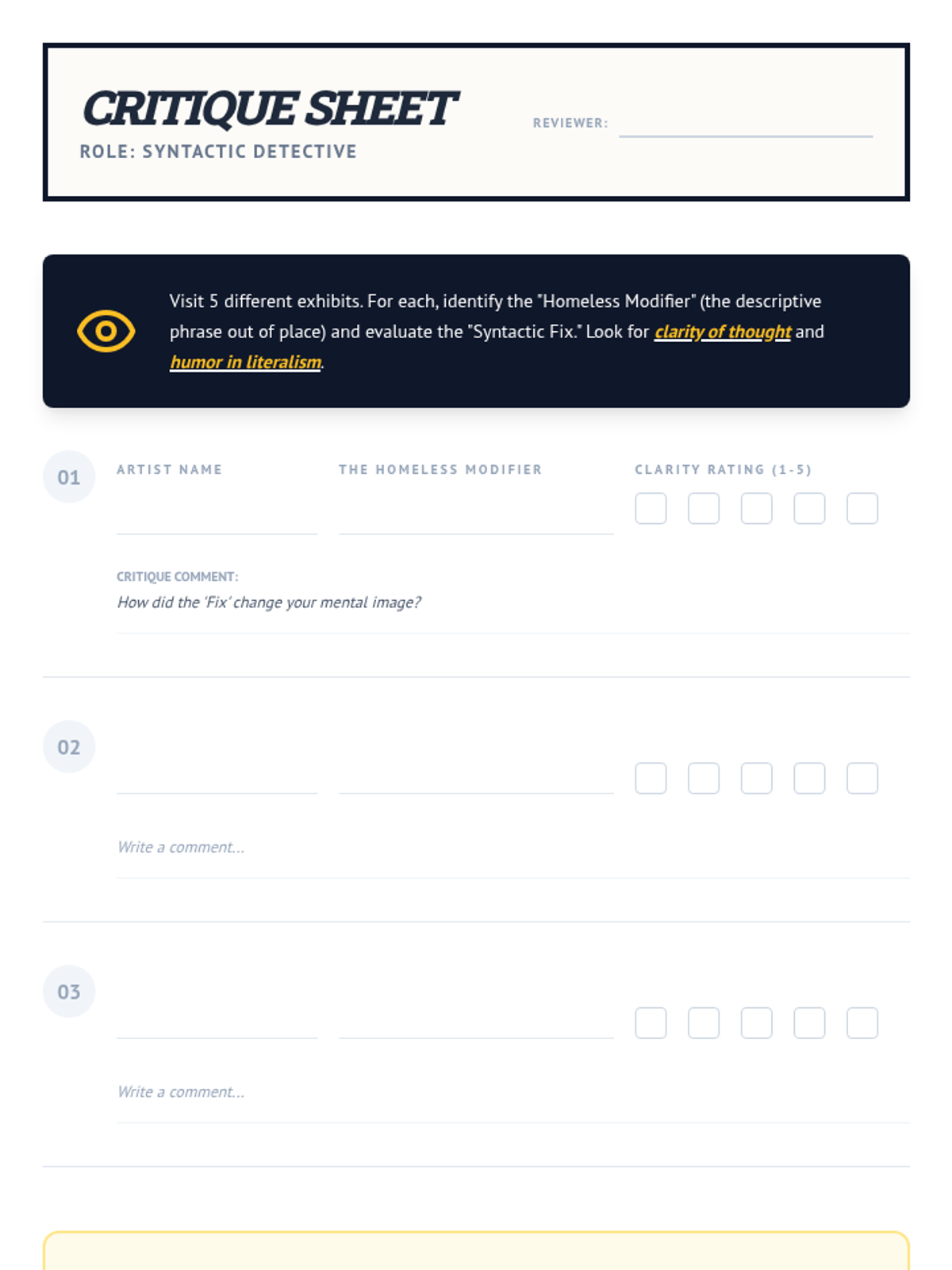 A 5-lesson 6th Grade ELA unit that uses visualization and illustration to help students identify and correct misplaced modifiers, culminating in a gallery walk of 'Before' and 'After' sentence corrections.