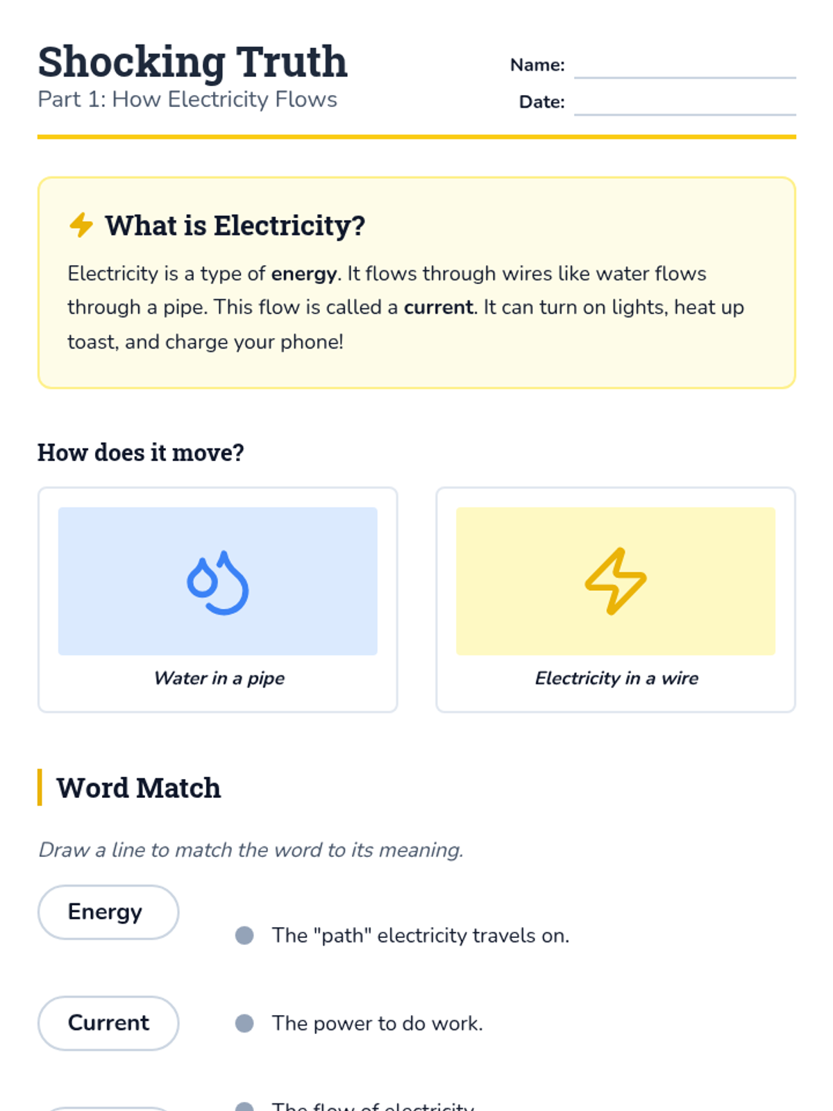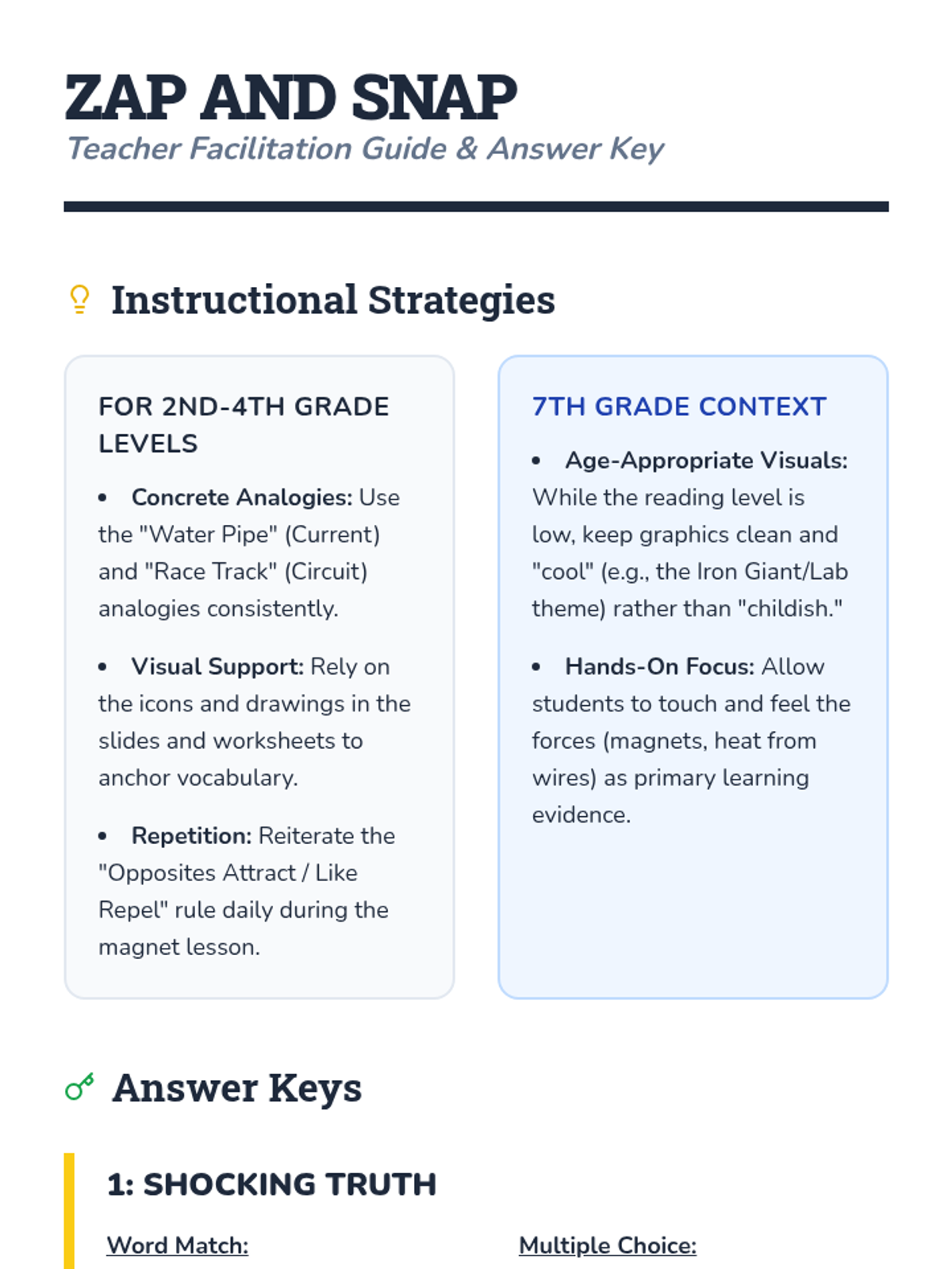 A foundational review of electricity and magnetism tailored for 7th-grade students working at 2nd-4th grade skill levels. The unit covers flow of electricity, magnetic properties, circuit building, and electromagnetism through highly visual and hands-on activities.