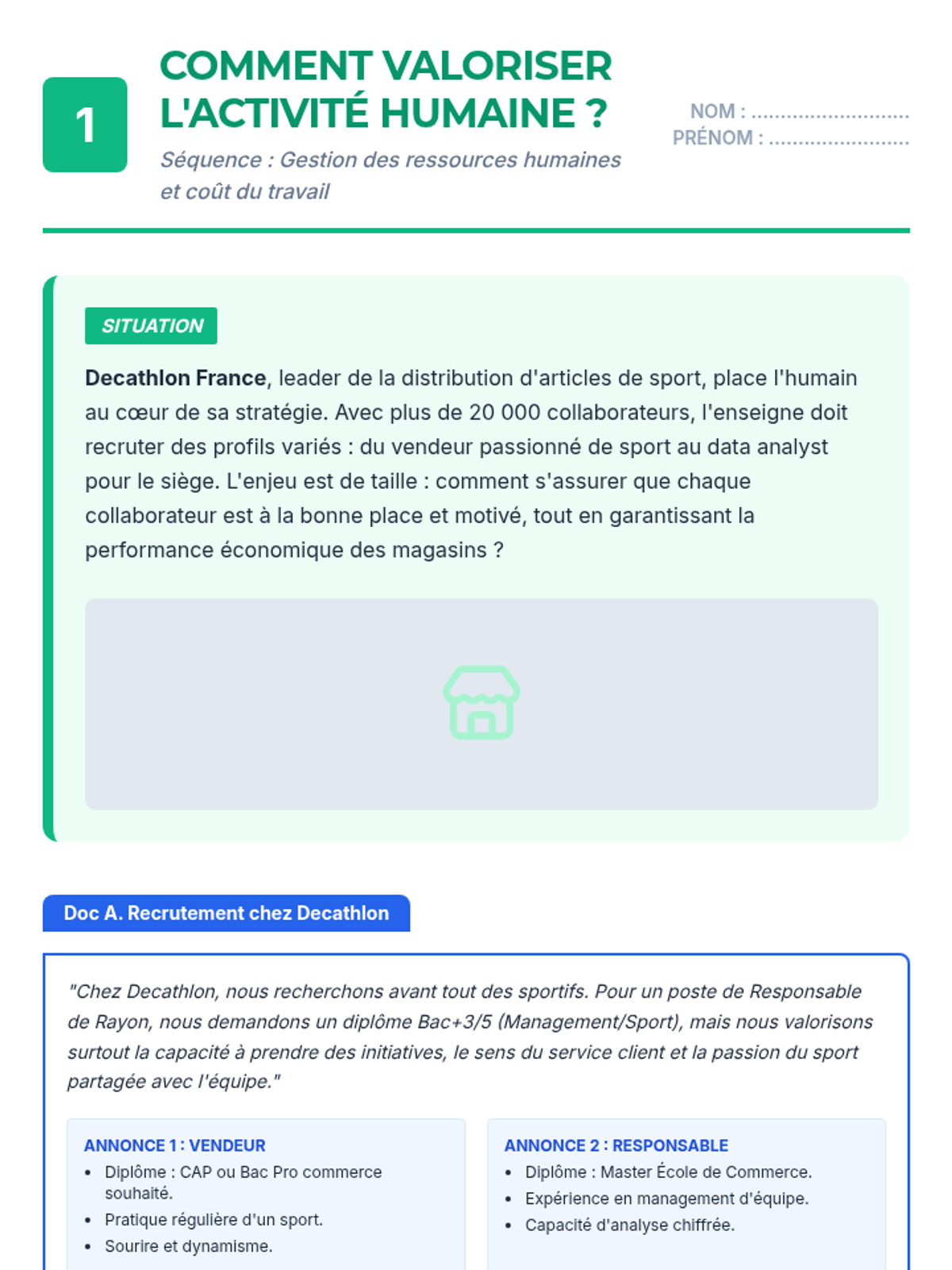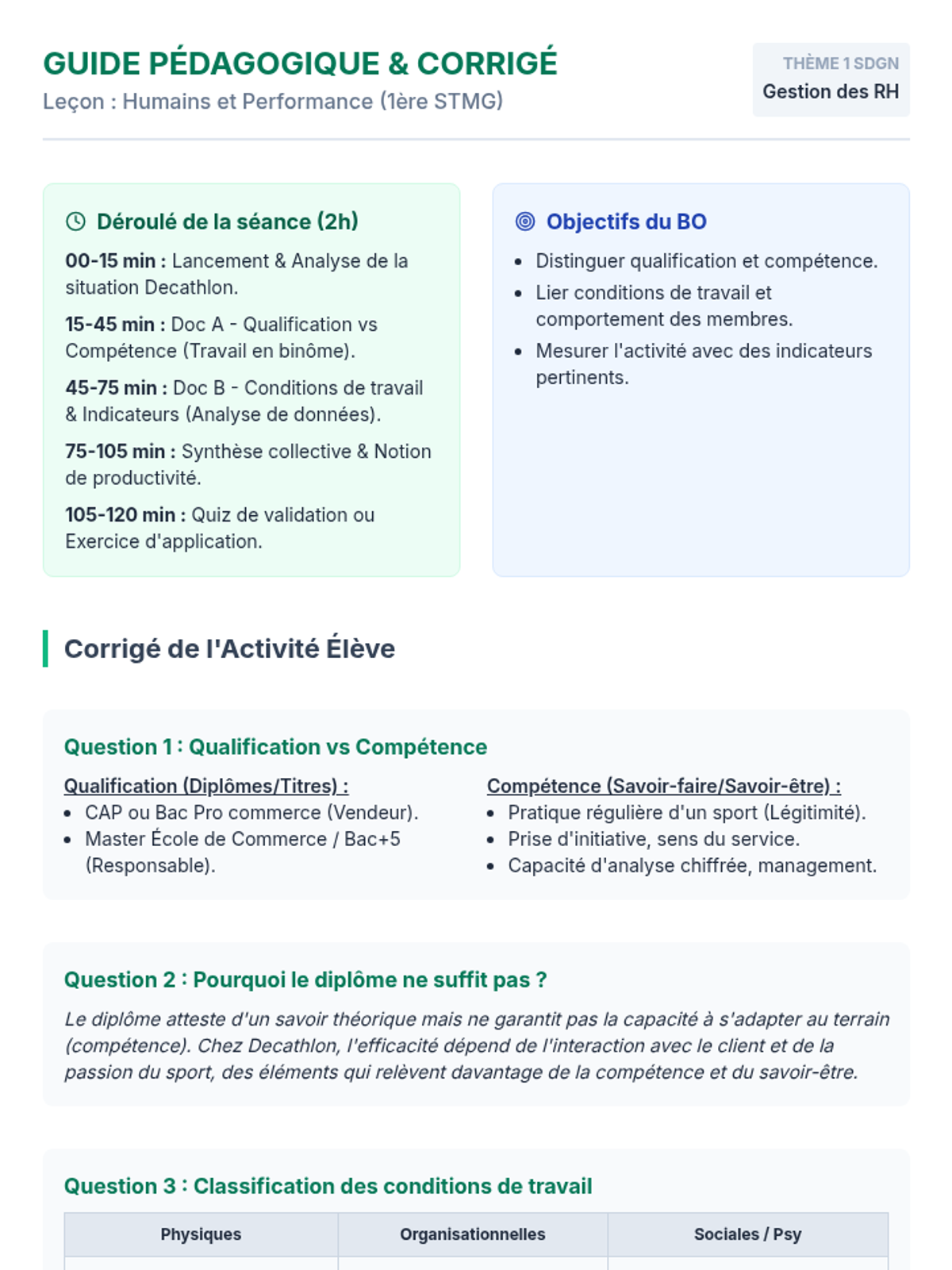 Cette séquence explore les enjeux de la gestion des ressources humaines en 1ère STMG, en articulant la valorisation de l'activité humaine avec les contraintes de performance et de coût du travail. Elle s'appuie sur des cas d'entreprises réelles pour illustrer les notions de qualification, de compétence, de conditions de travail et d'arbitrage financier.