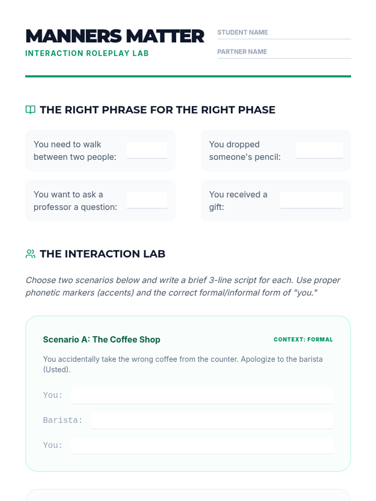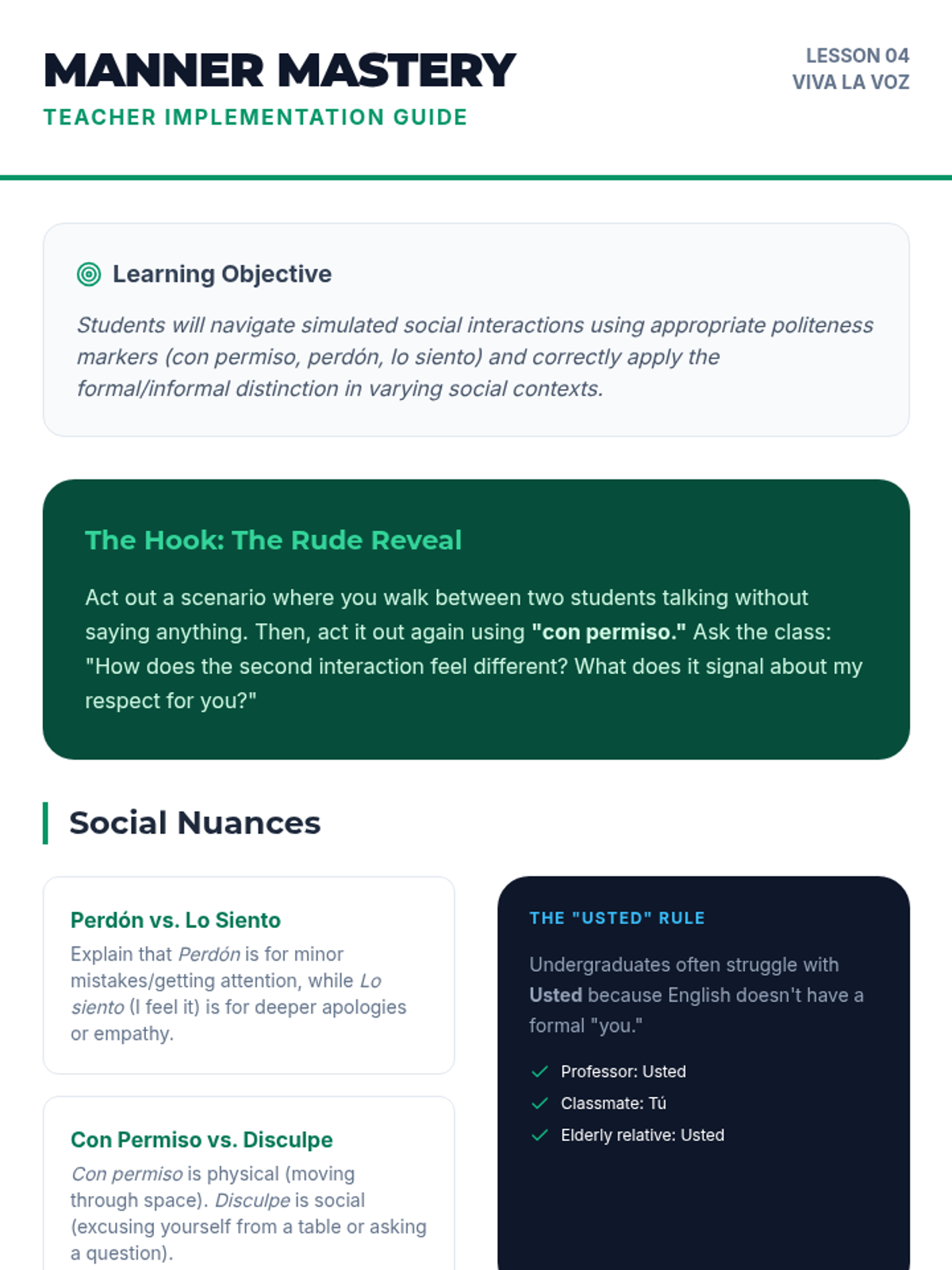 This sequence explores the sociolinguistic nuances of Spanish, focusing on the distinction between formal (usted) and informal (tú) registers. Students analyze social hierarchy and cultural values to understand how grammatical choices dictate relationship dynamics and avoid cultural faux pas.