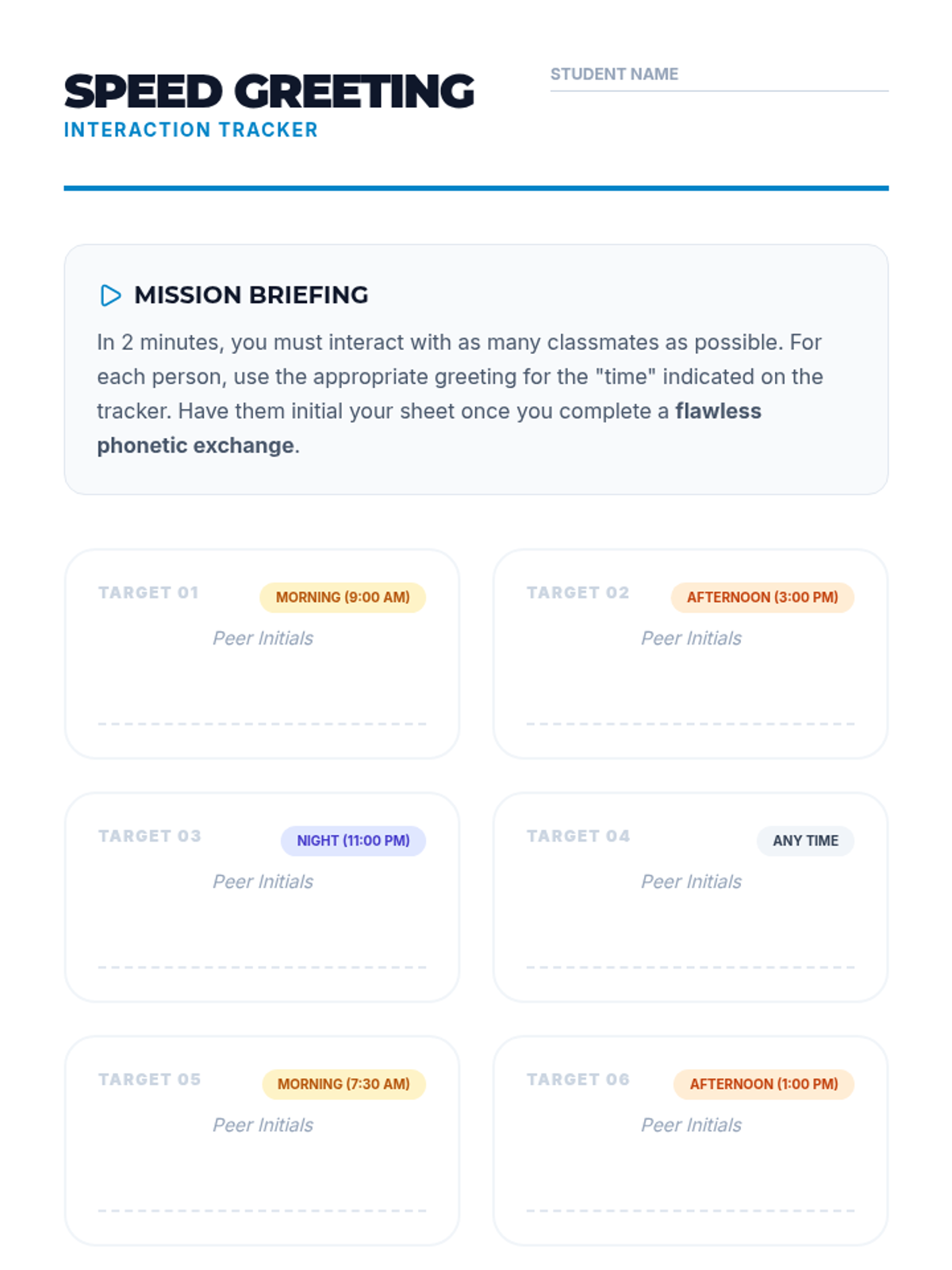 A beginner Spanish sequence for undergraduate students focused on constructing personal identity through the verbs 'ser' and 'llamarse', progressing from basic introductions to a full social simulation.