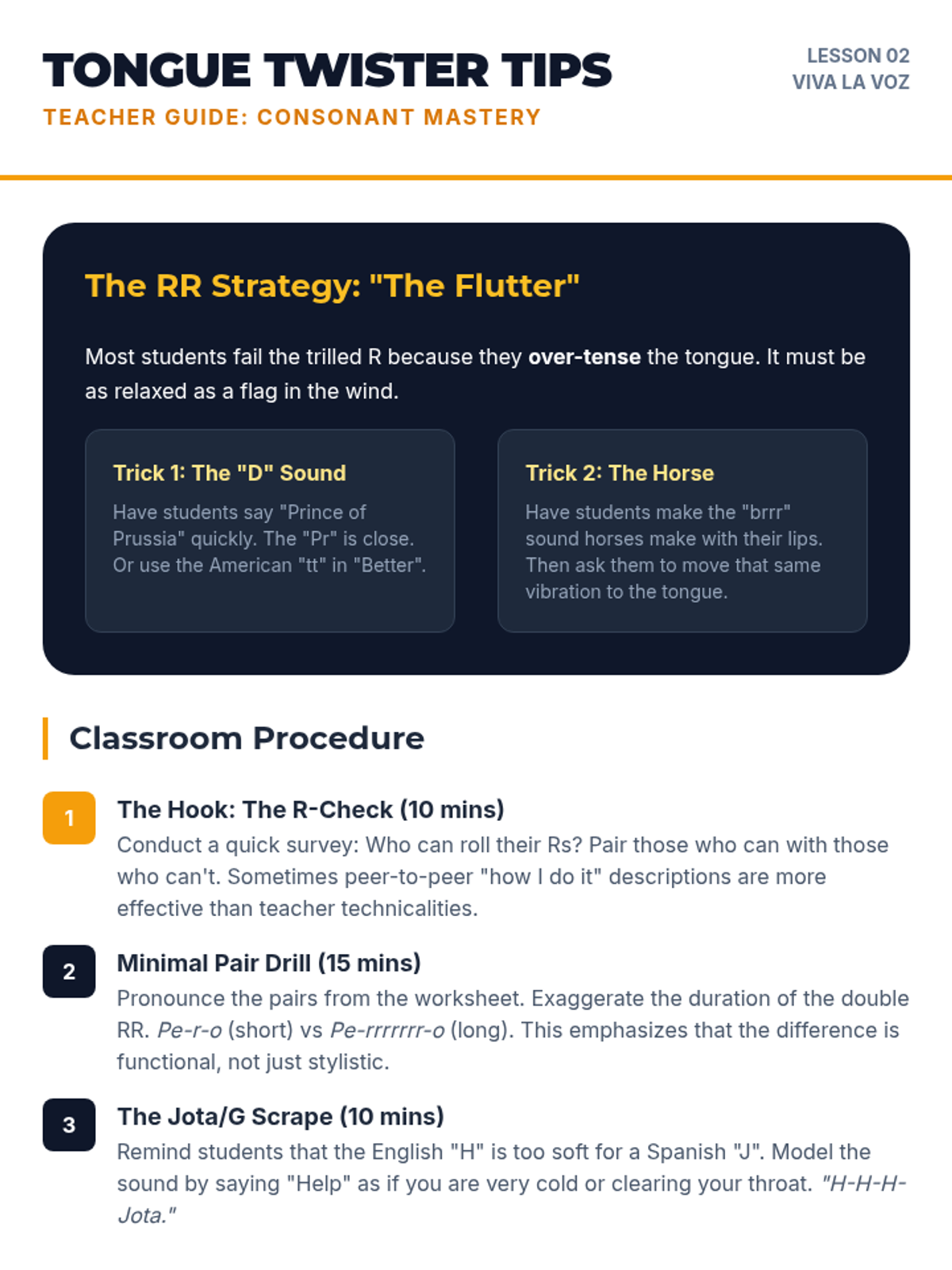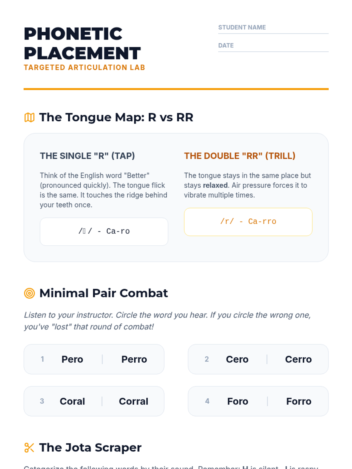 This sequence establishes foundational auditory and oral skills for Spanish fluency, focusing on vowel sounds, difficult consonants like 'rr' and 'ñ', and rules of stress and accentuation. Students transition from sound production to reading syllables and full words with accuracy.