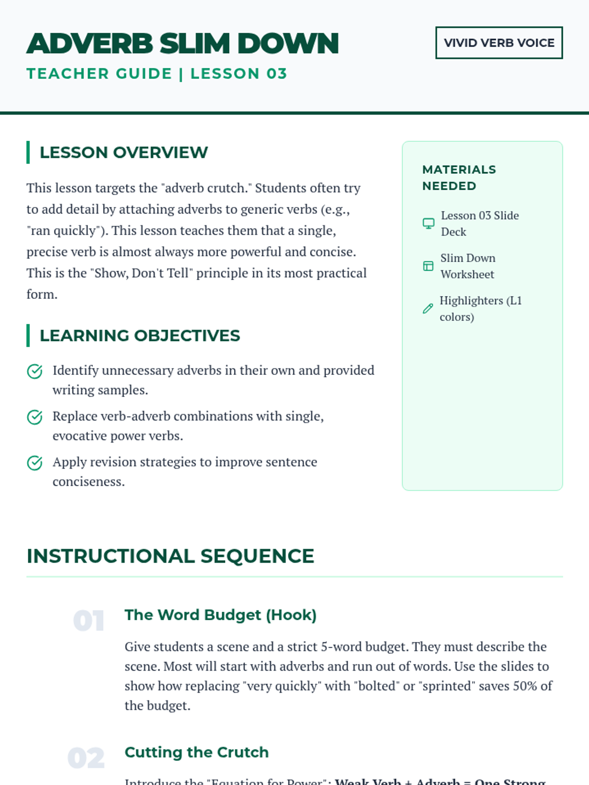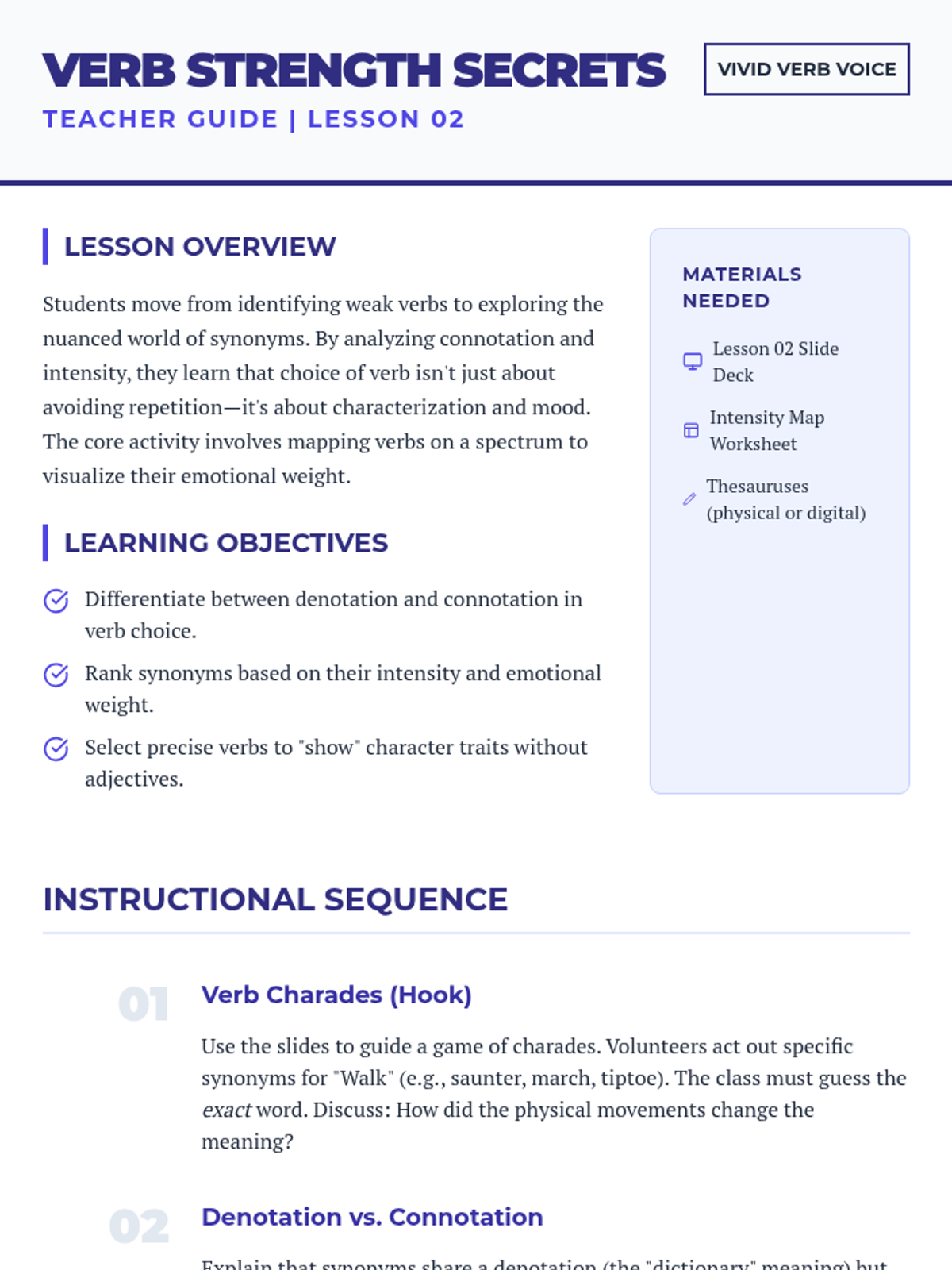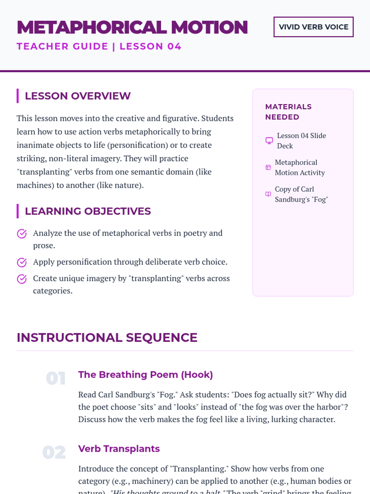 A project-based grammar sequence for 10th-grade students focused on replacing weak 'to be' verbs and adverbs with precise, evocative action verbs to enhance narrative voice and imagery.
