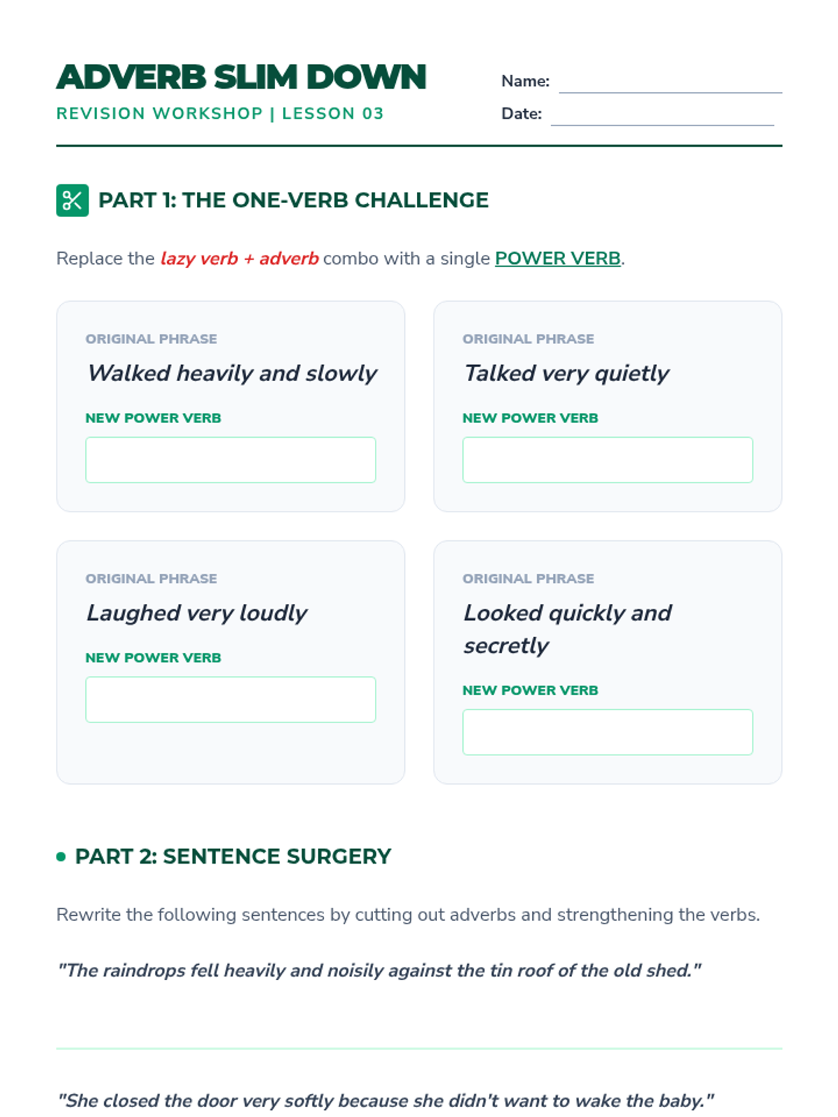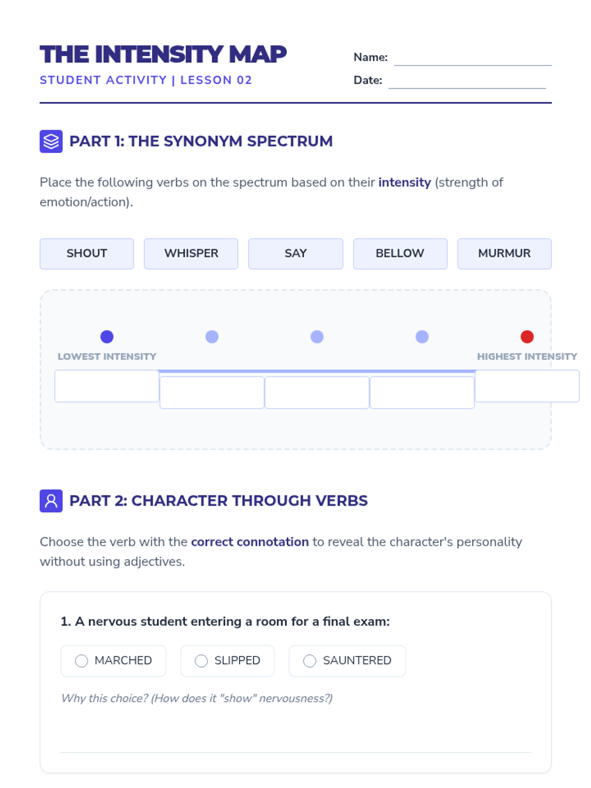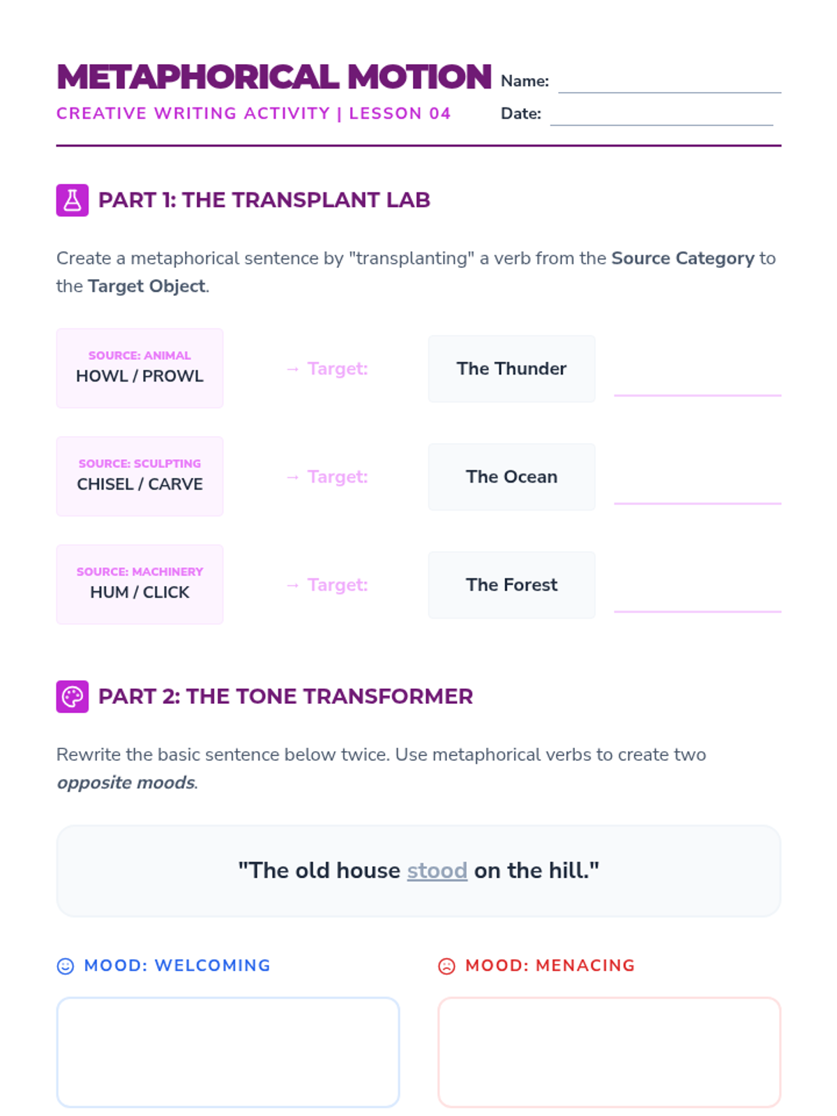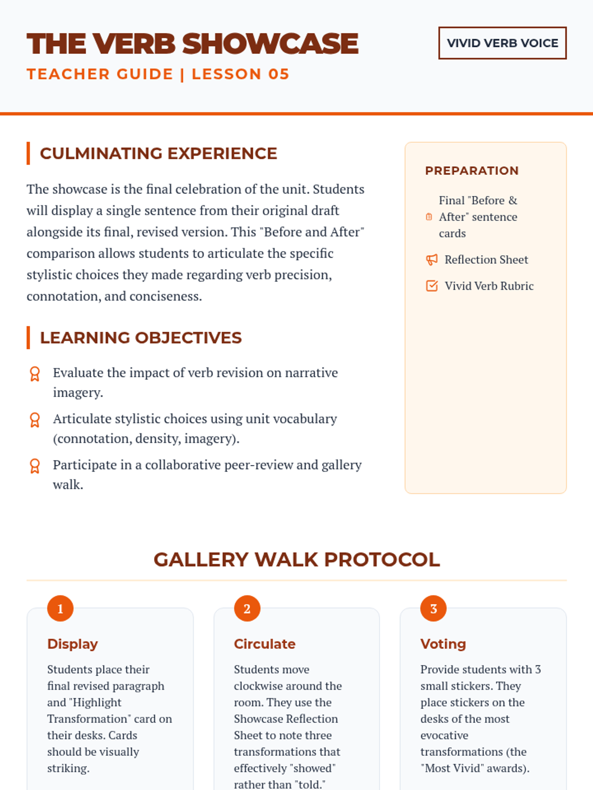 A project-based grammar sequence for 10th-grade students focused on replacing weak 'to be' verbs and adverbs with precise, evocative action verbs to enhance narrative voice and imagery.