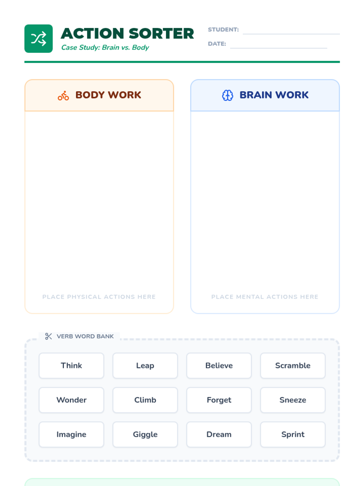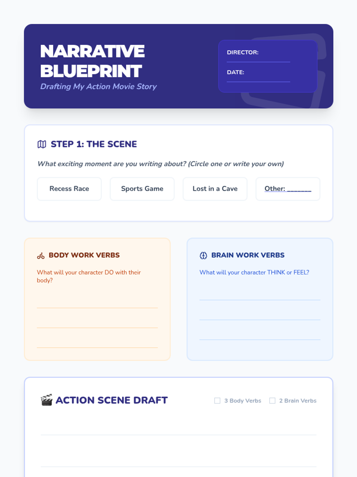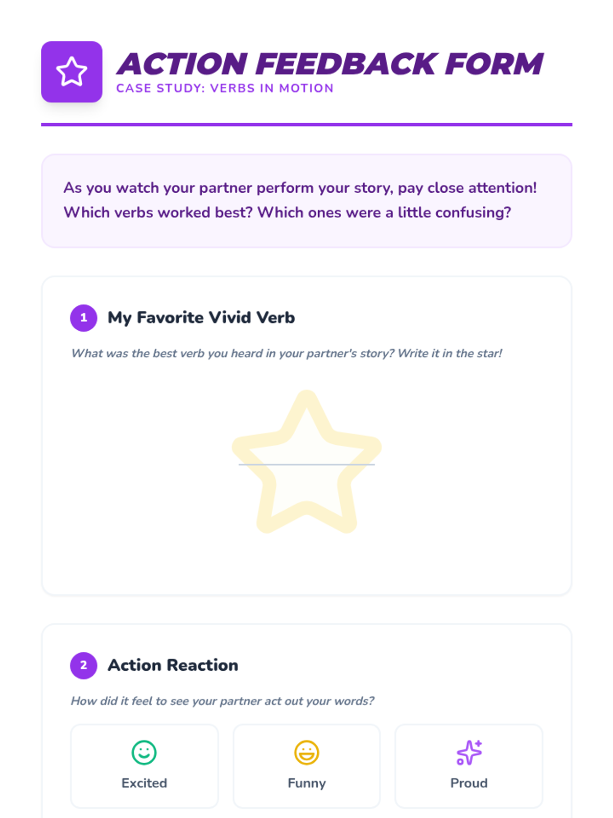 A 2nd-grade ELA sequence focused on the power of vivid verbs in narrative writing. Students transition from identifying action words to distinguishing between physical and mental actions, and ultimately revising their own writing to create more engaging and descriptive stories.