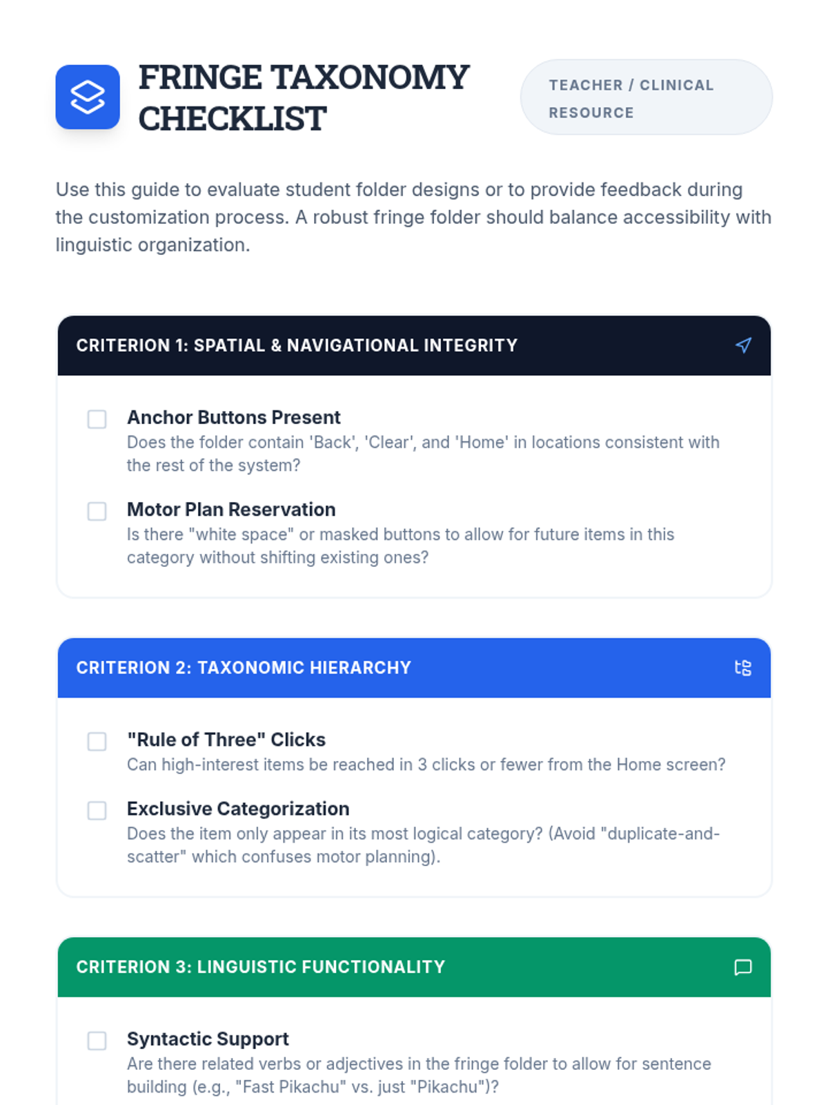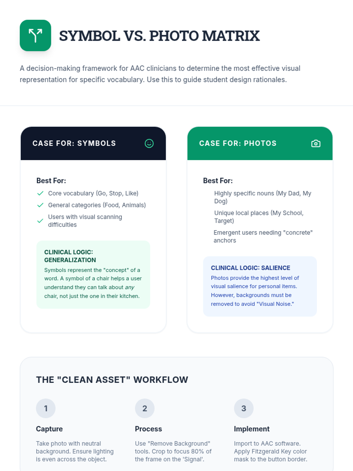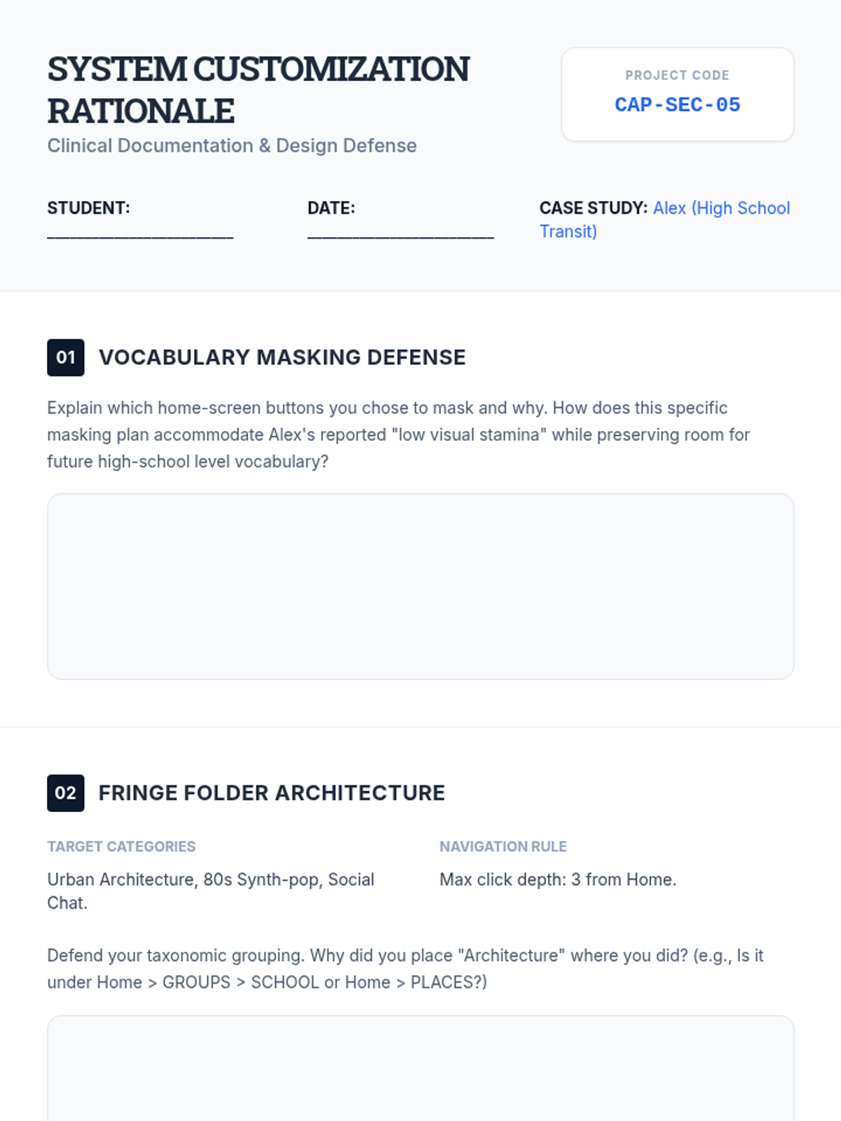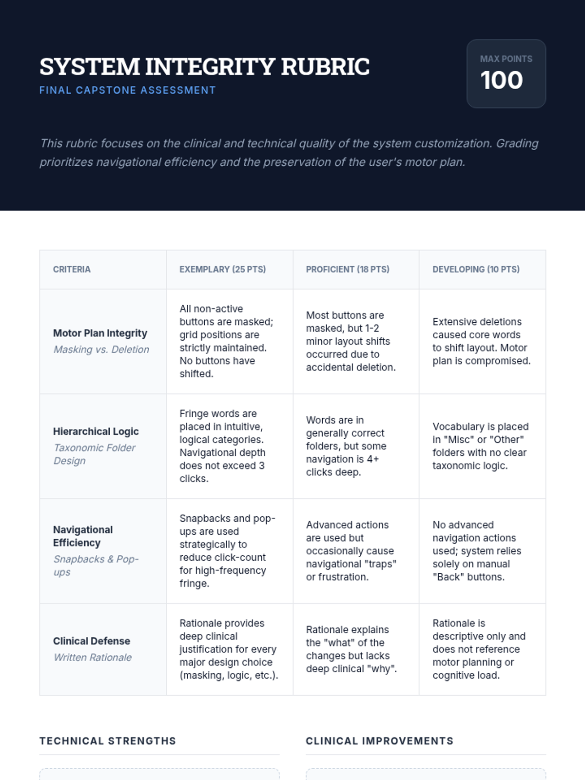 This project-based sequence for graduate students focuses on the advanced technical and clinical skills required to customize AAC devices. Students learn to manage vocabulary systems by prioritizing motor planning, hierarchical logic, and visual accessibility, culminating in a comprehensive case study customization project.