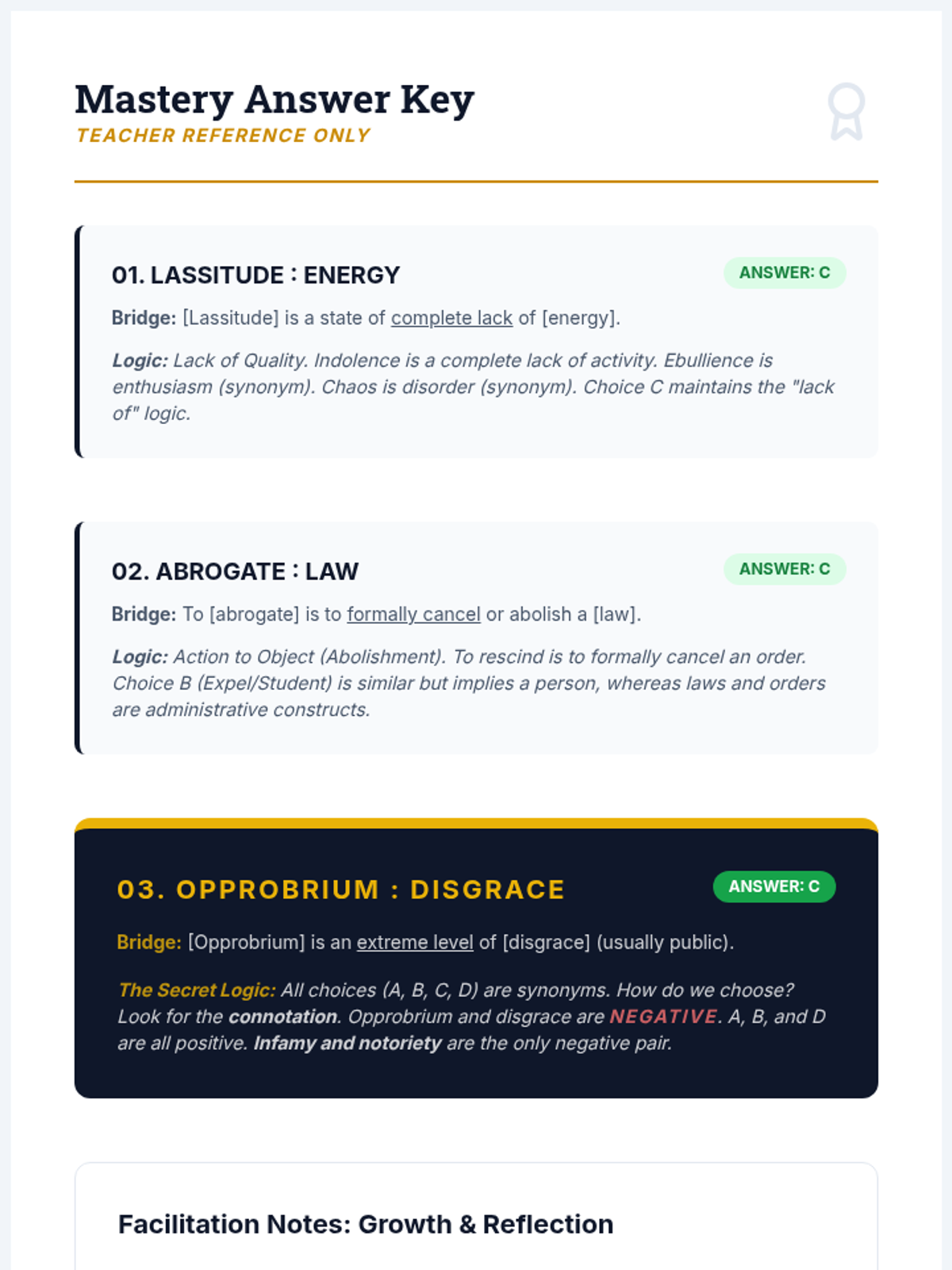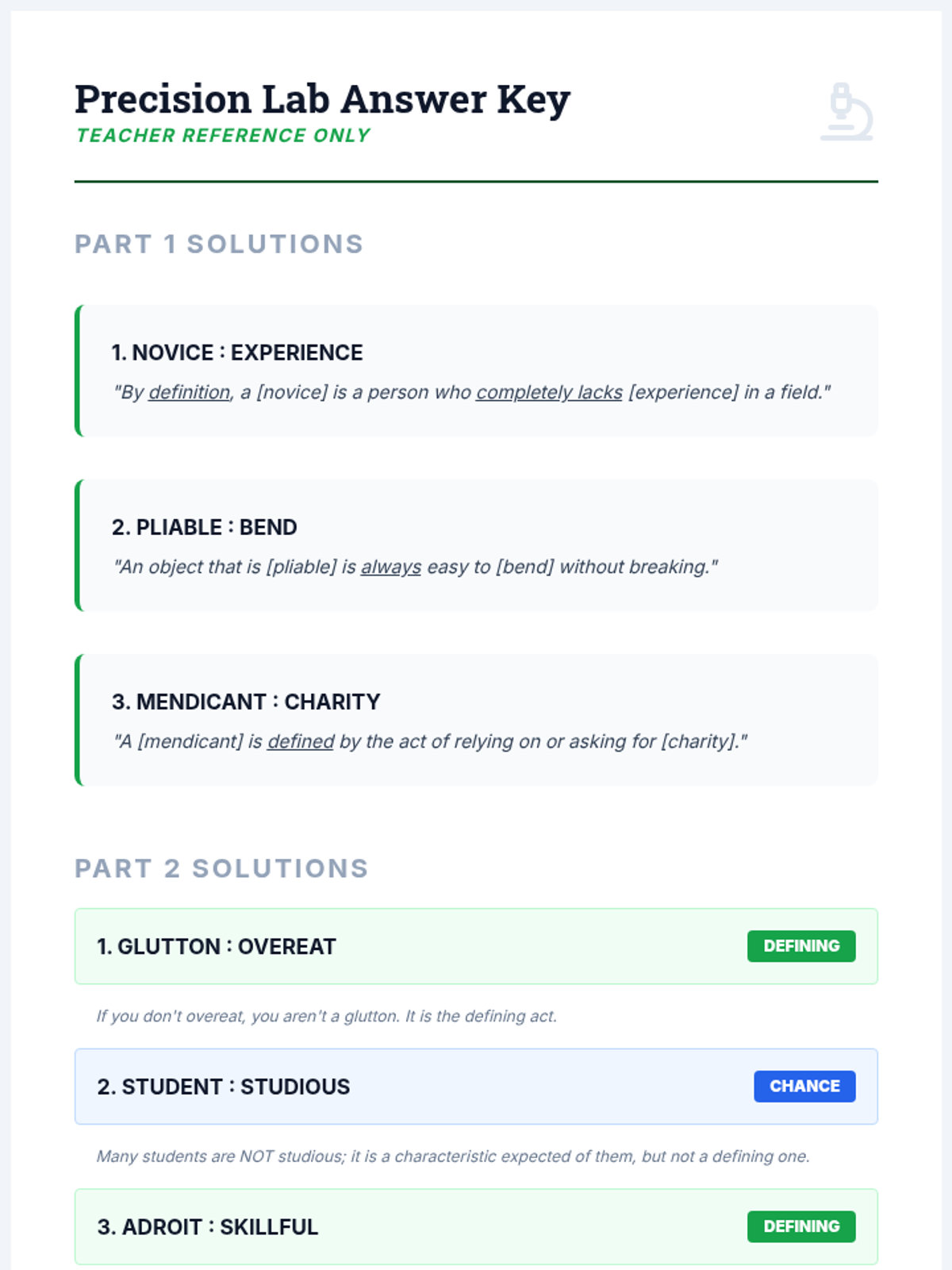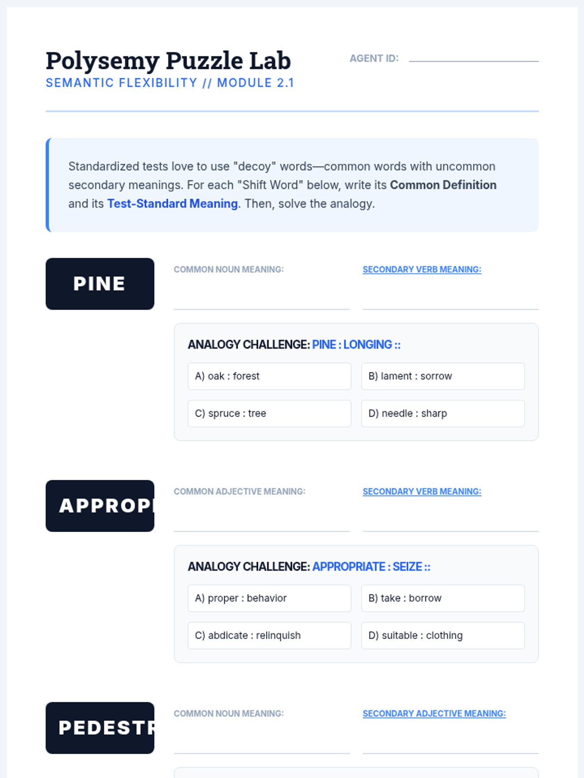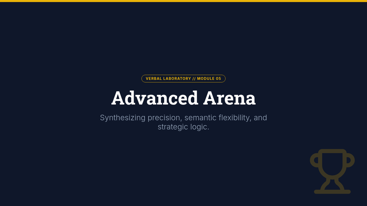 A high-school level sequence focusing on the logic and precision required for advanced analogy problems, preparing students for standardized testing and academic vocabulary mastery through a 'Verbal Laboratory' theme.