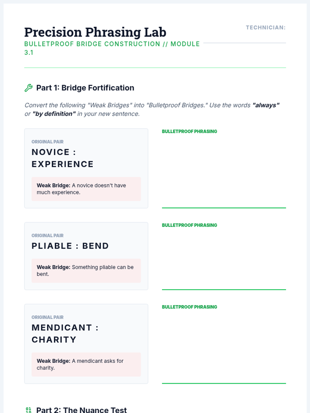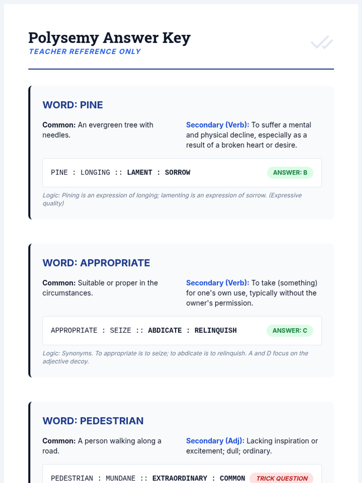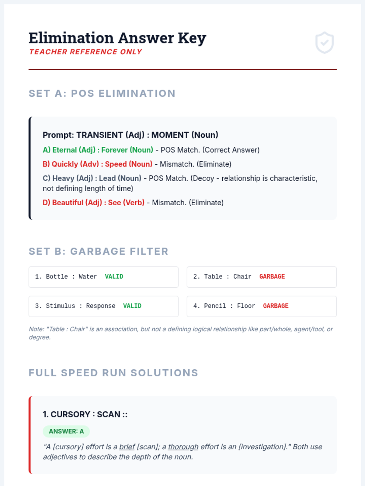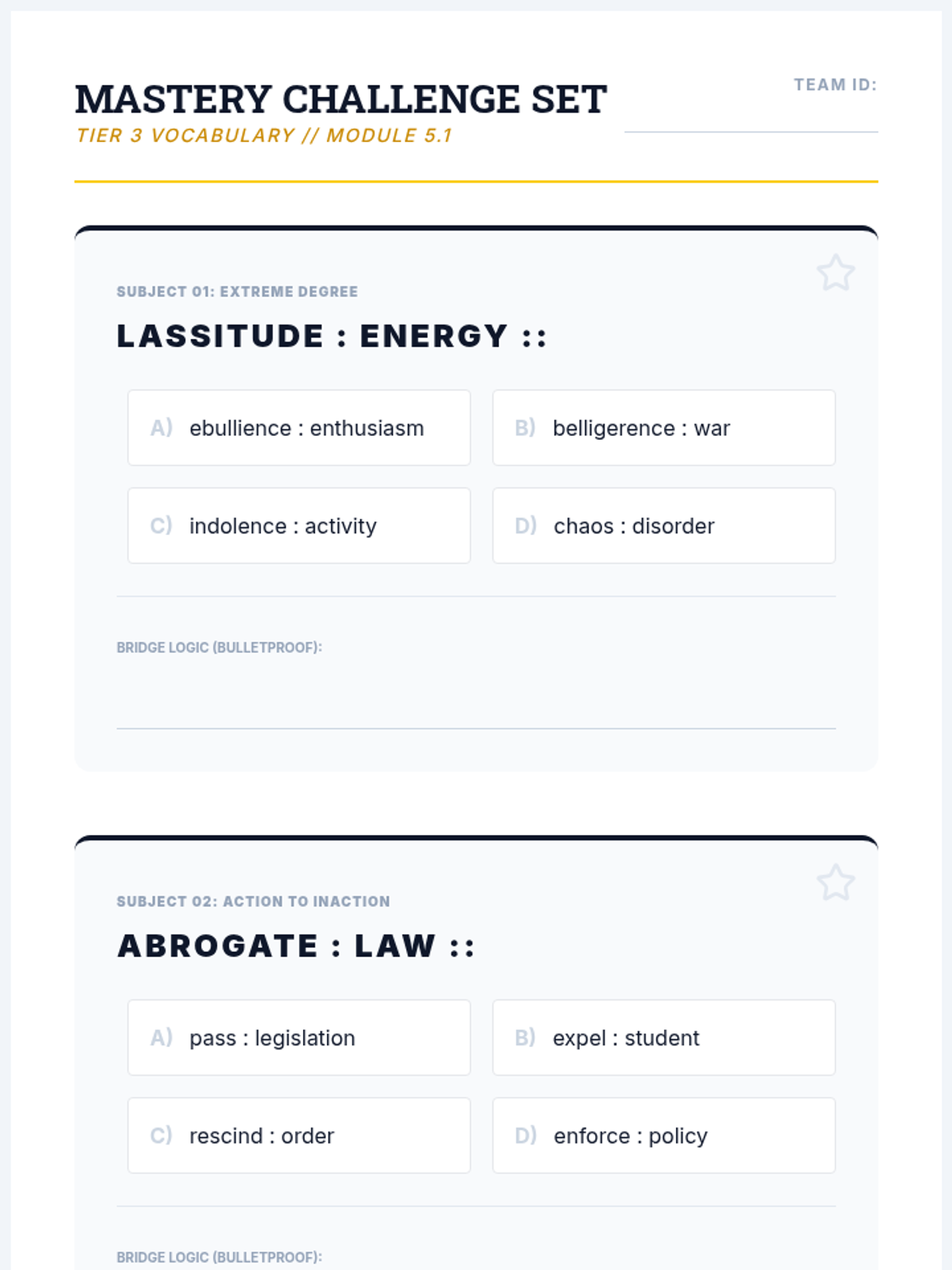 A high-school level sequence focusing on the logic and precision required for advanced analogy problems, preparing students for standardized testing and academic vocabulary mastery through a 'Verbal Laboratory' theme.