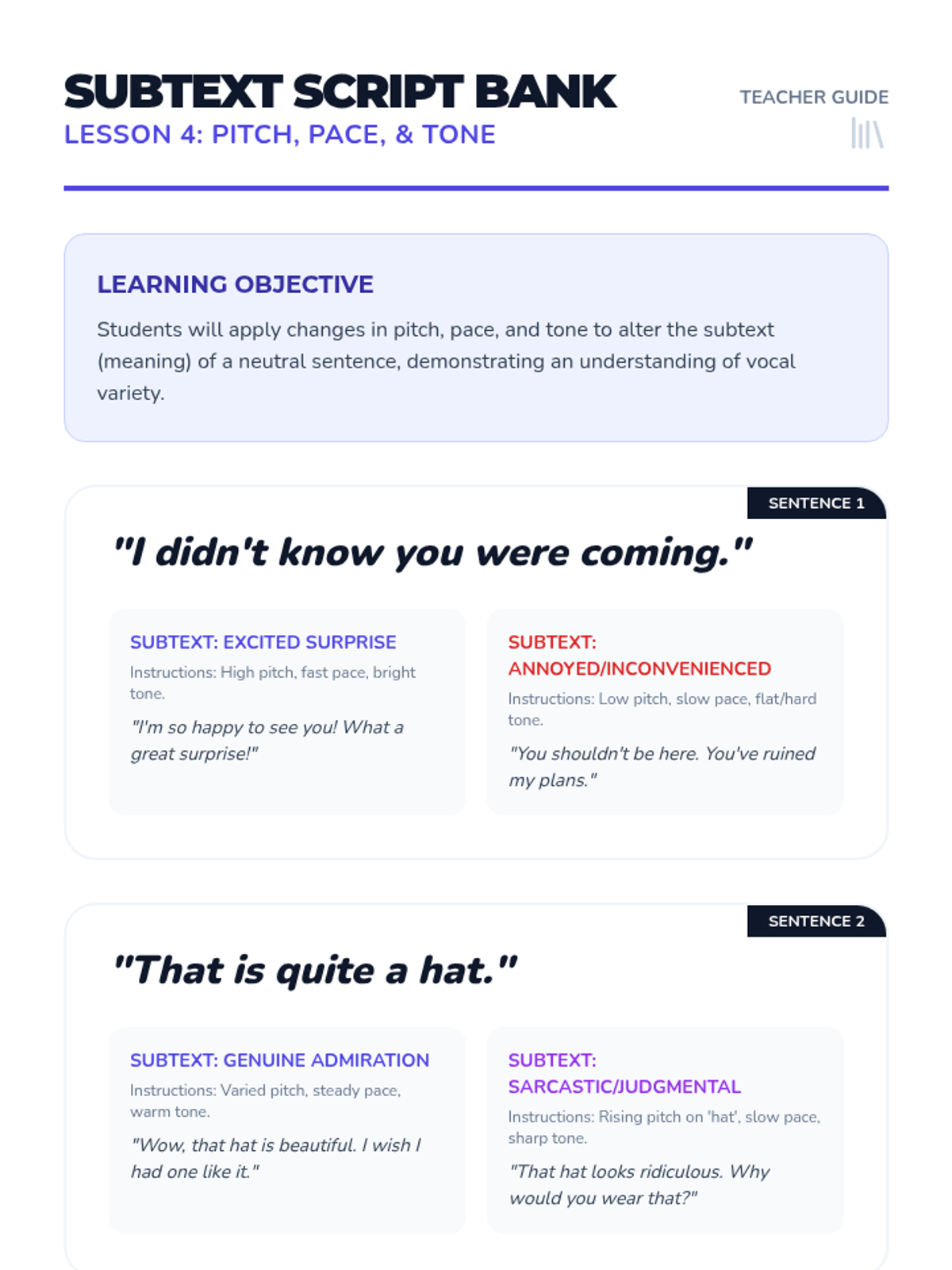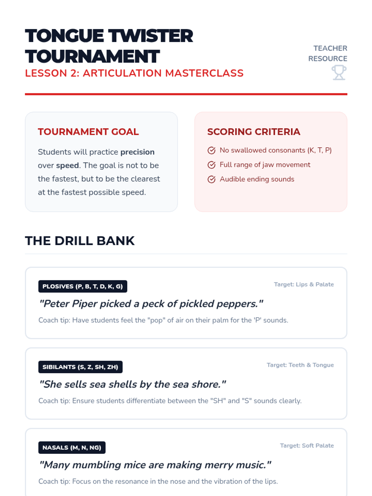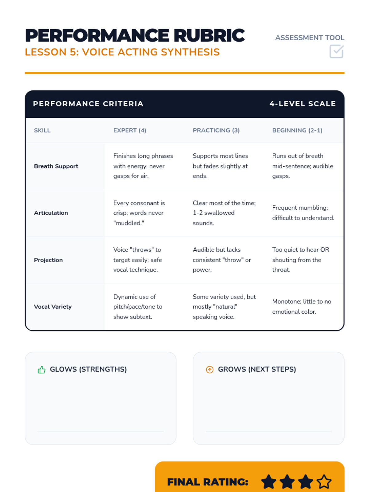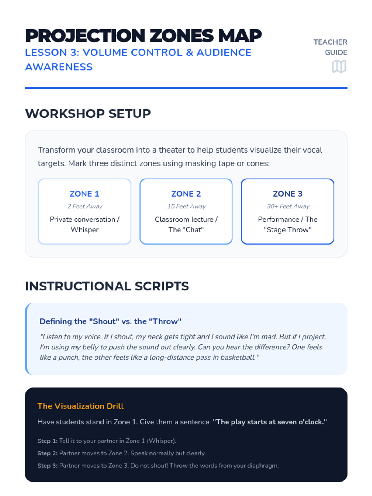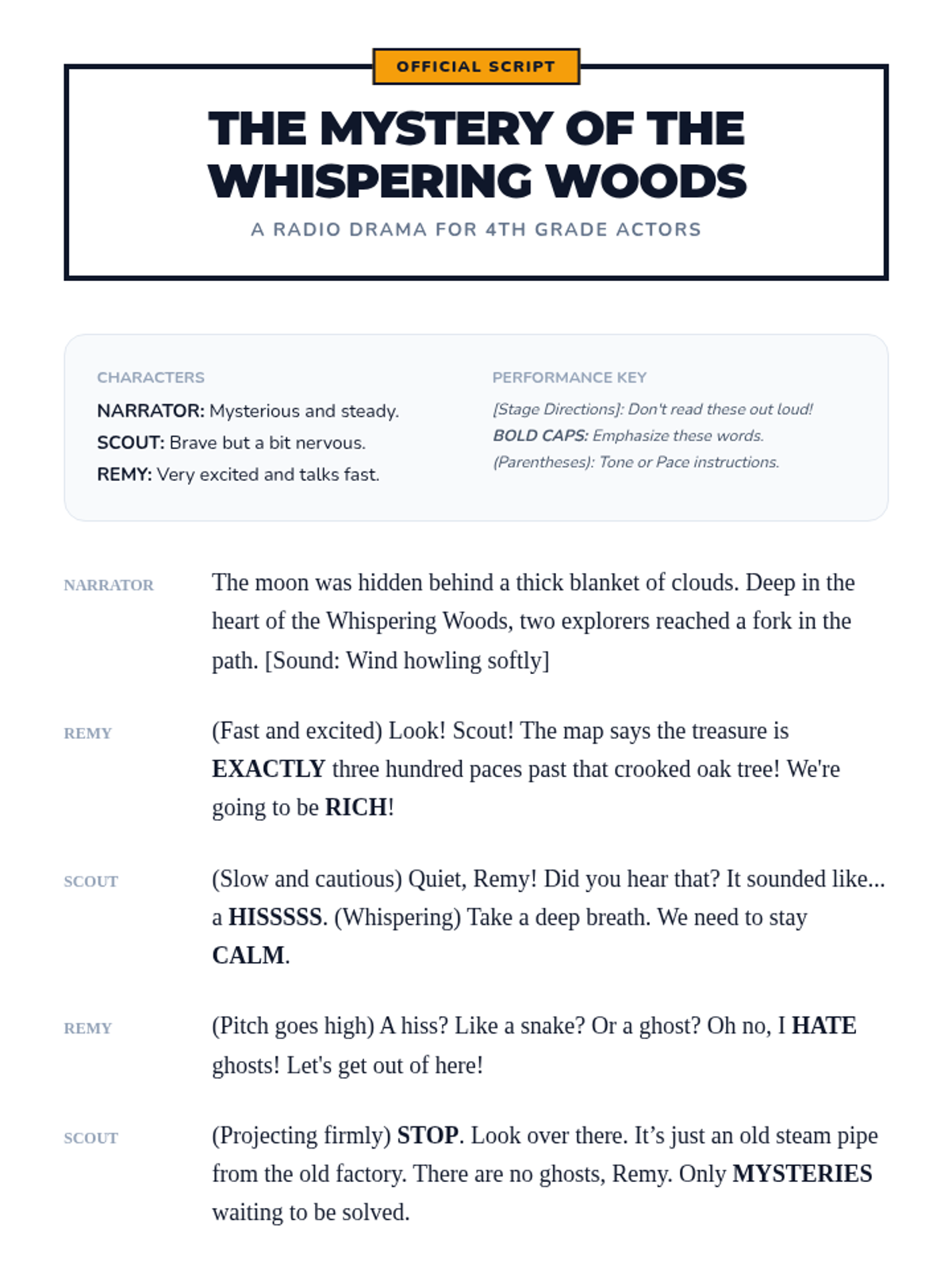 A comprehensive theater sequence for 4th graders focusing on the mechanics of the voice. Students progress from breath control and articulation to projection and vocal expression, concluding with a radio drama performance.