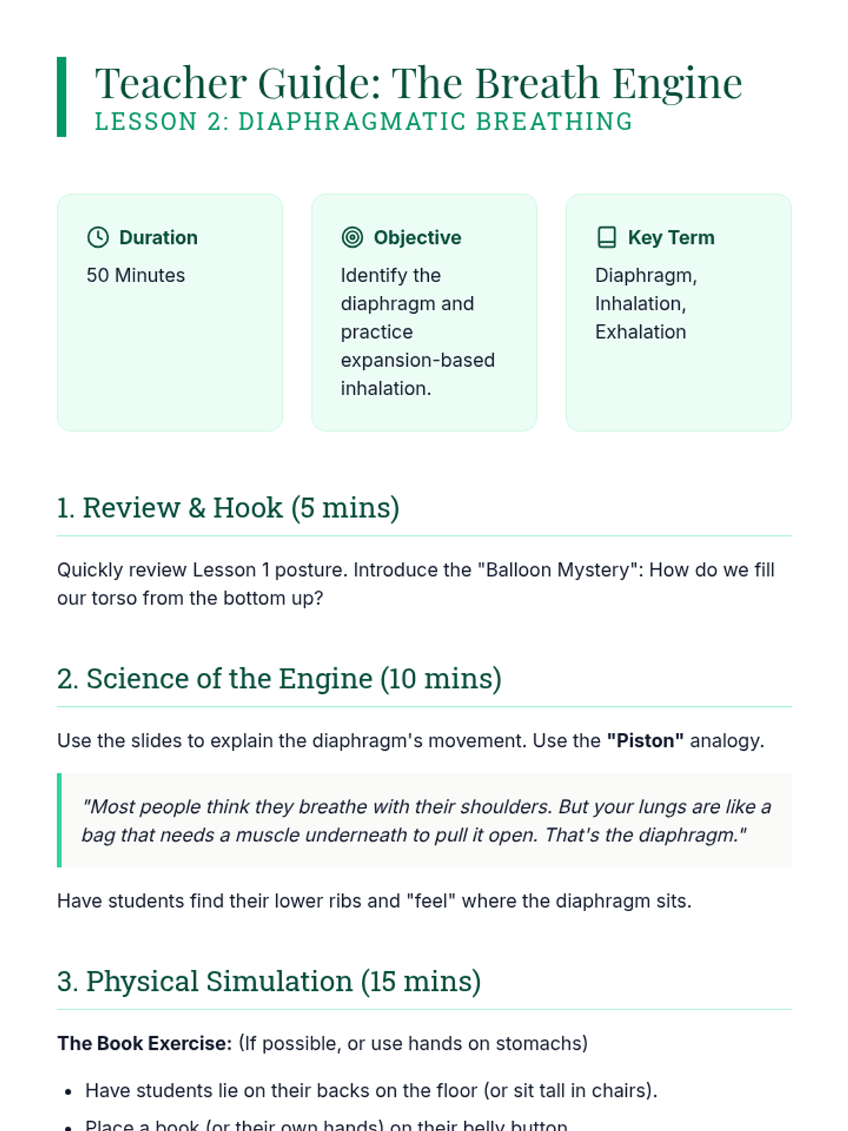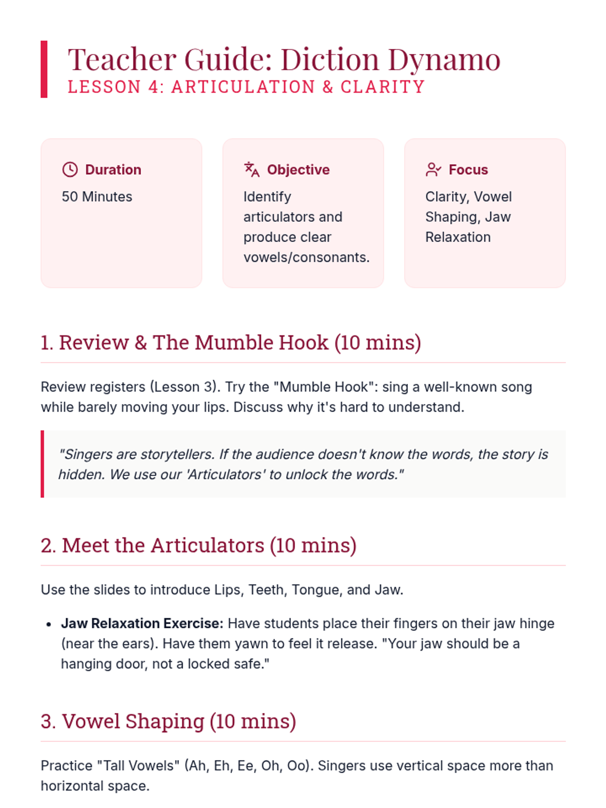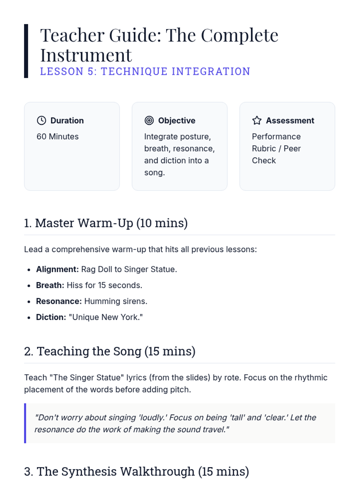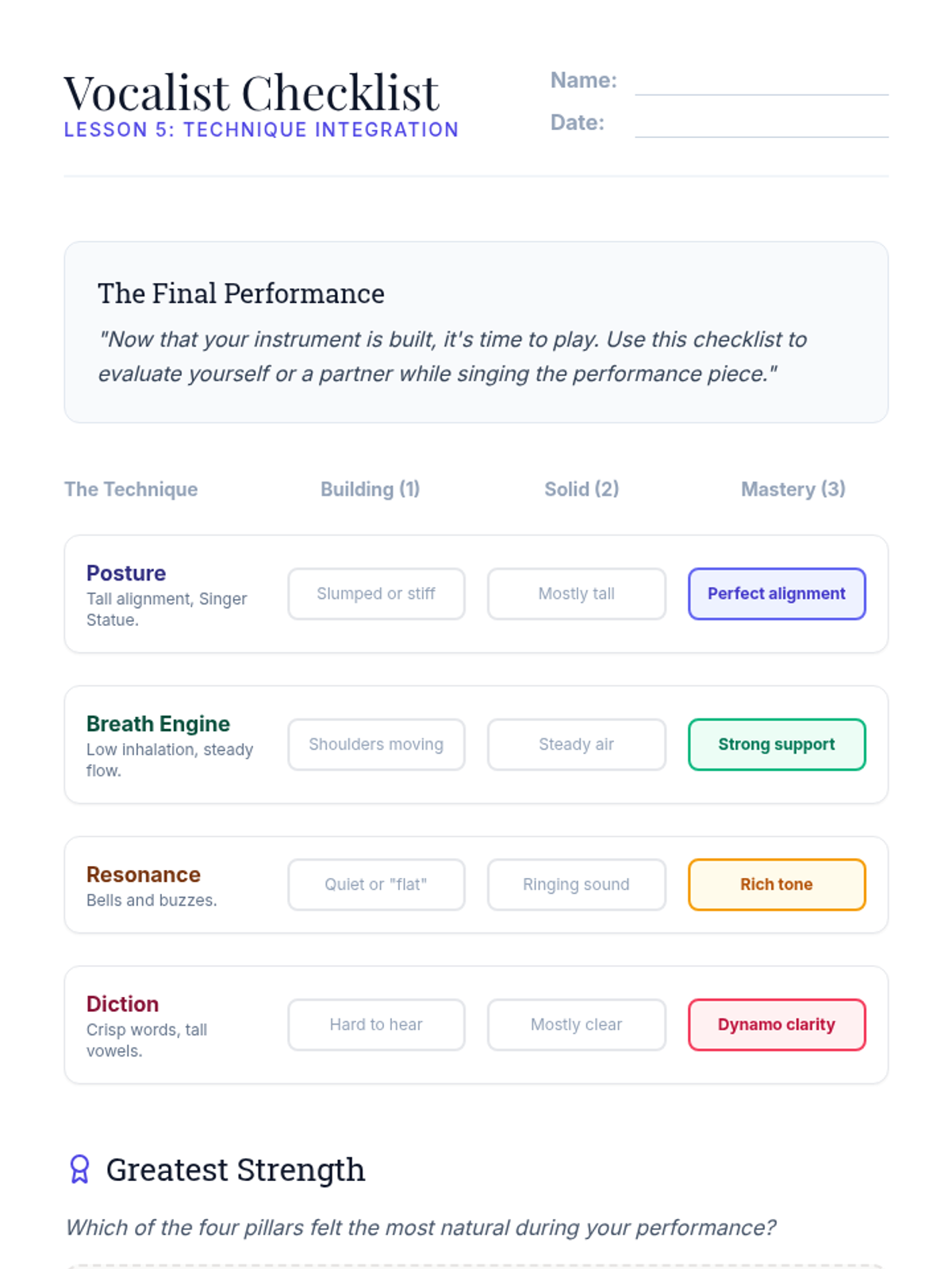 This sequence explores the physical mechanics of singing, treating the body as a primary instrument. Students learn anatomy, posture, diaphragmatic breathing, resonance, and articulation to produce clear, controlled vocal tones.