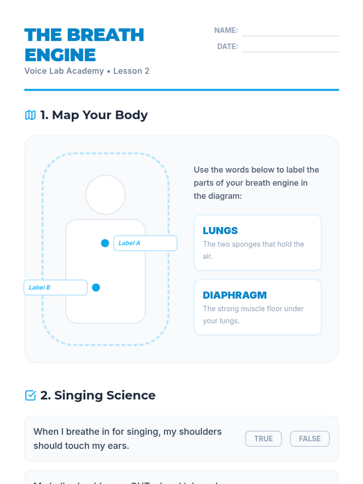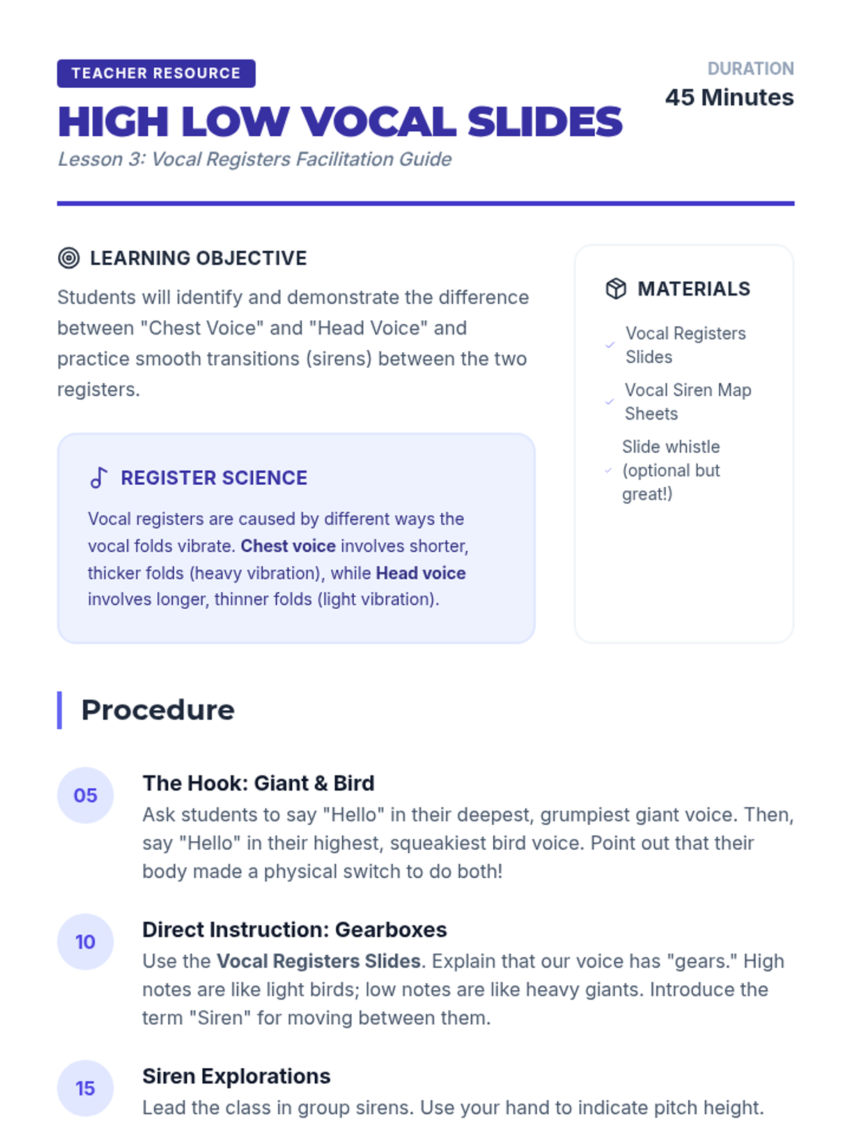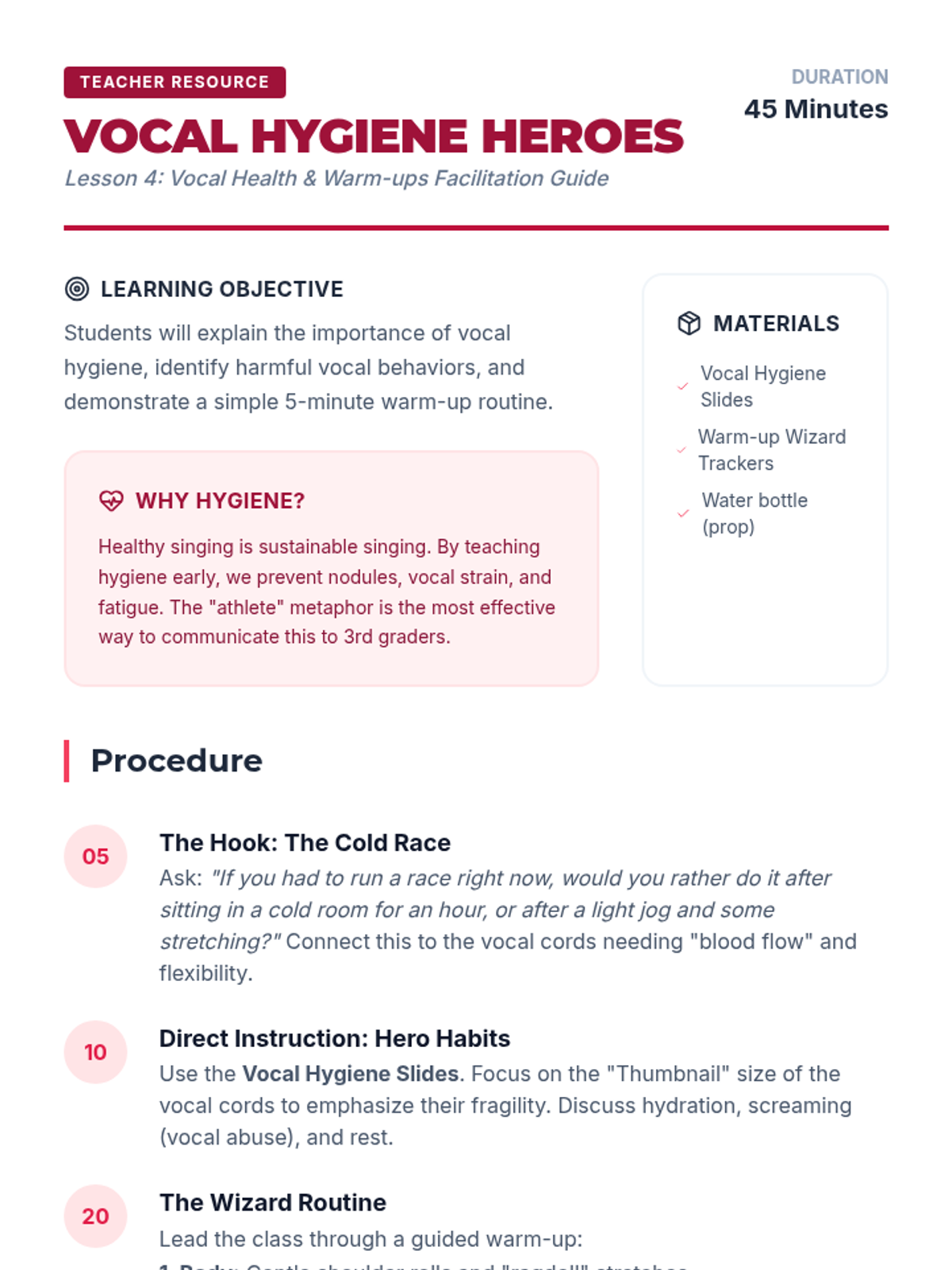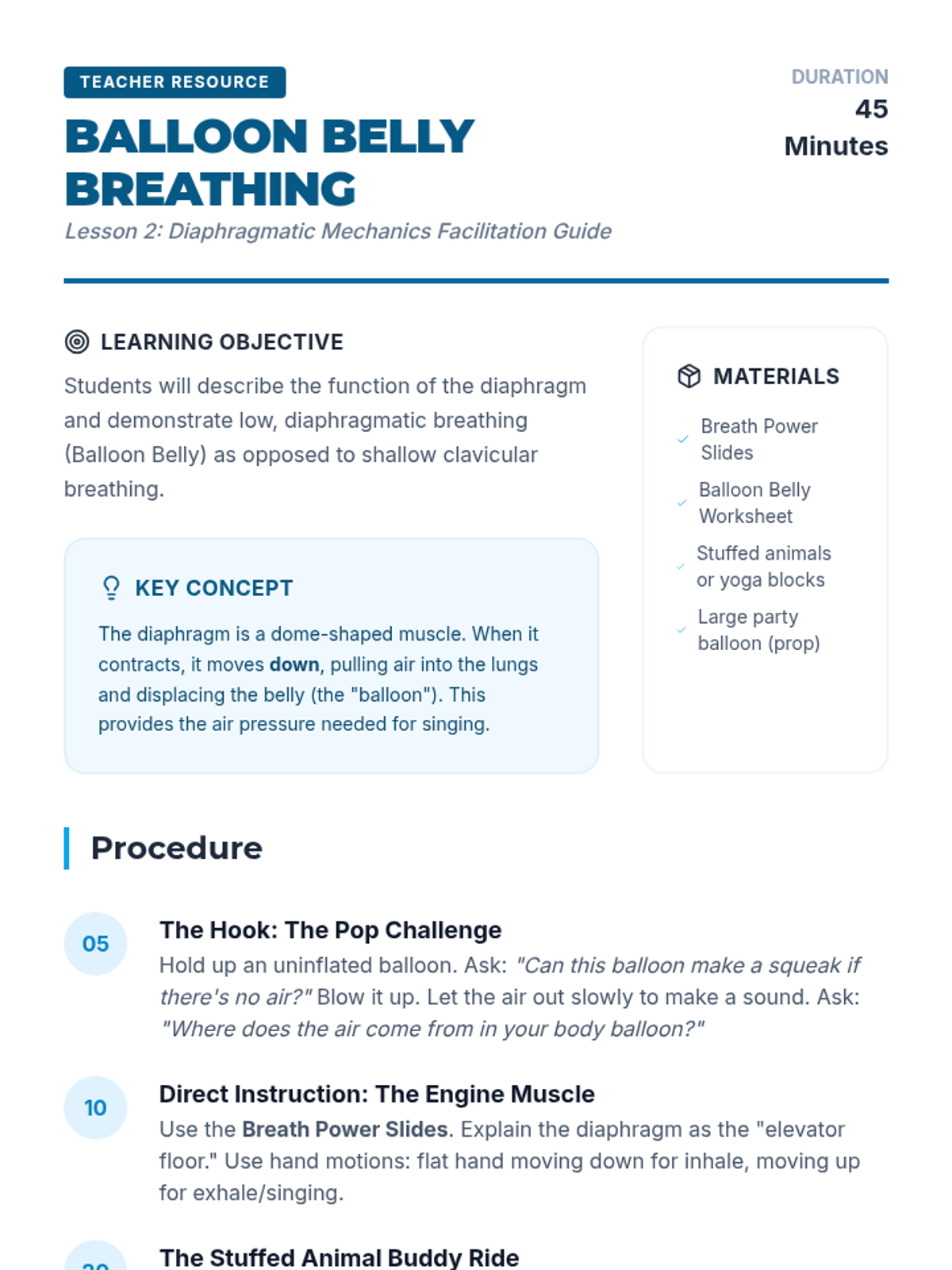 This sequence introduces third-grade students to the concept of the body as a musical instrument, focusing on posture, diaphragmatic breathing, vocal registers, and hygiene. Students will build a foundation of healthy vocal habits through interactive workshops and guided practice.