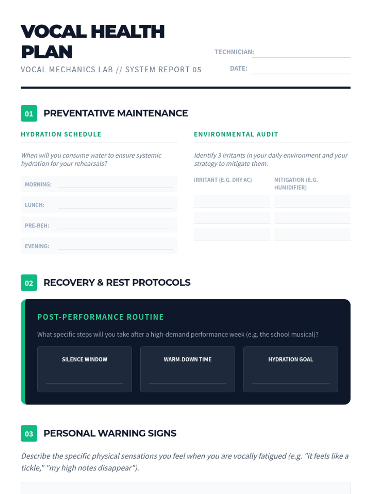 A comprehensive unit for 10th-grade vocalists focusing on the physiological foundations of singing. Students explore posture, breath management, laryngeal function, resonance, and vocal health to build a sustainable and healthy vocal technique.