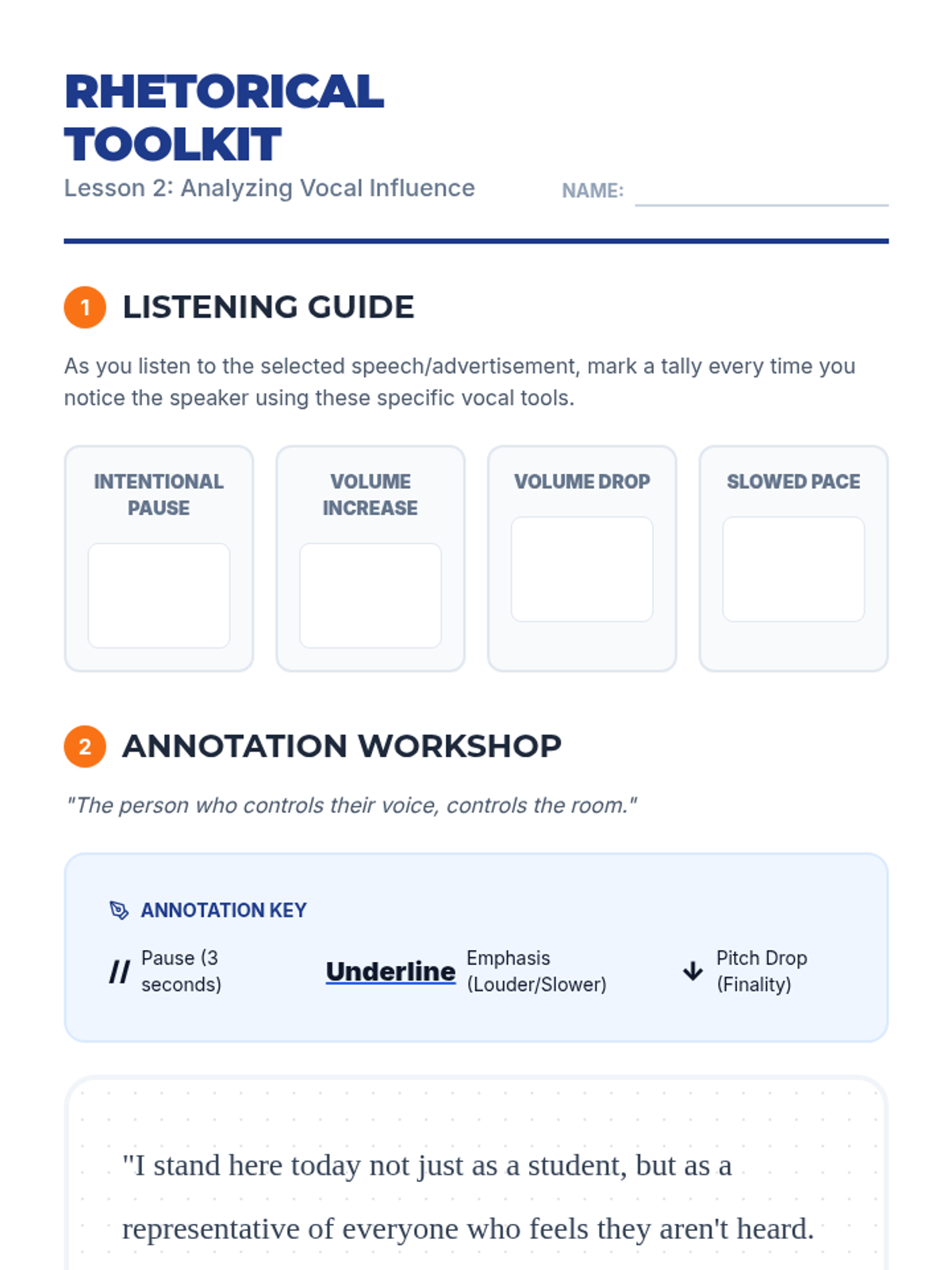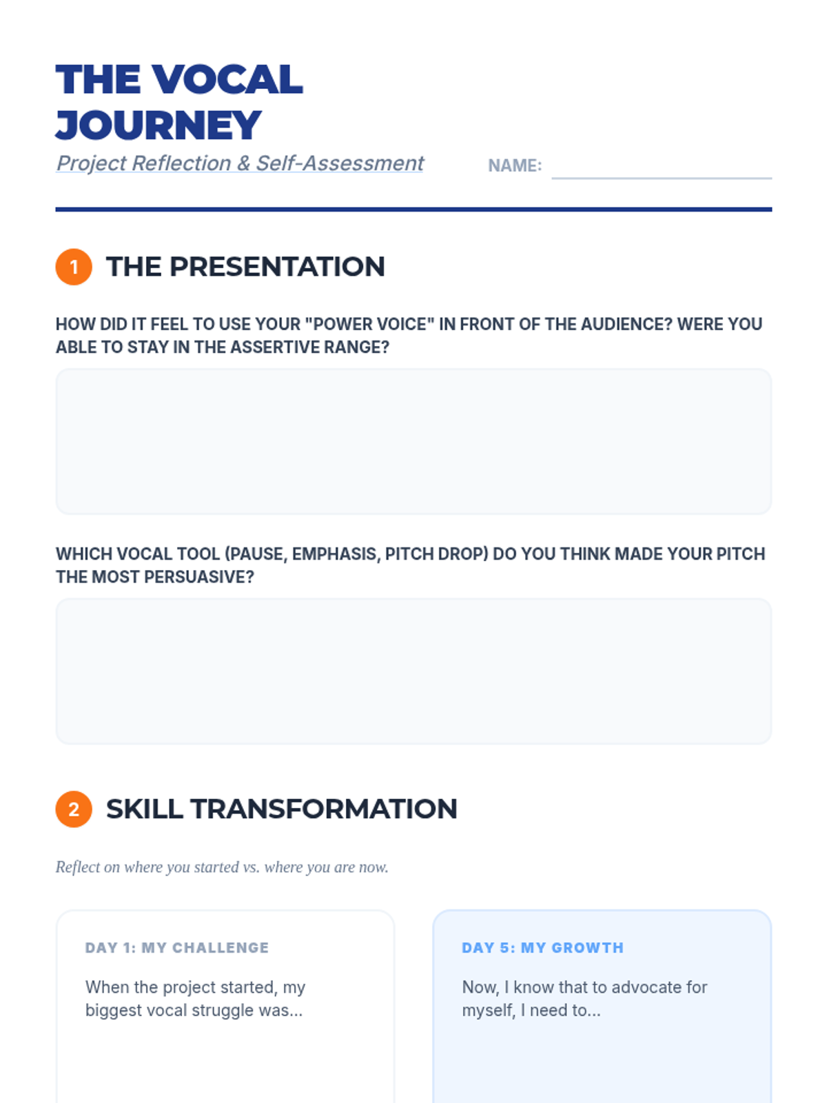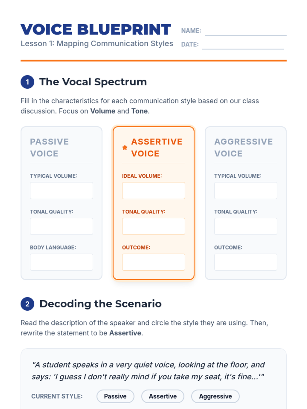 A project-based sequence for 7th-grade students to master volume and tone as tools for assertive communication and self-advocacy. Students move from identifying communication styles to delivering a polished advocacy pitch focused on vocal control.