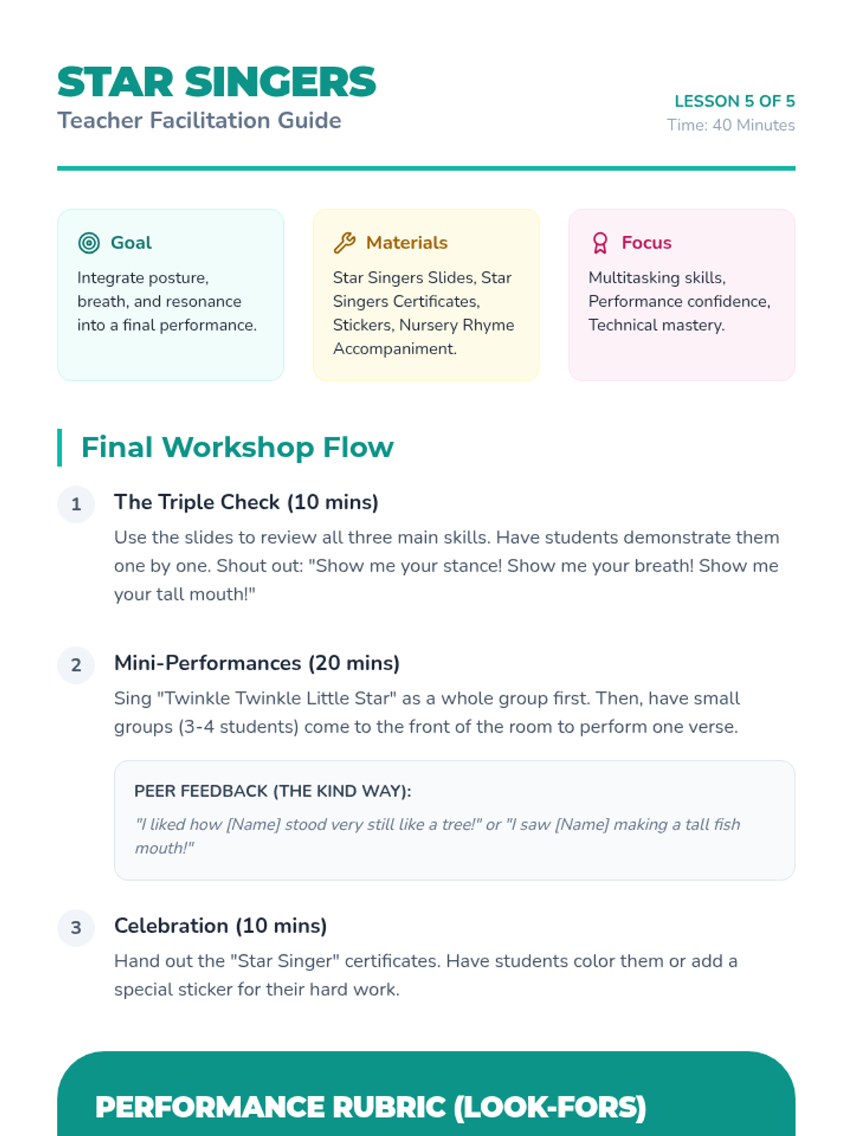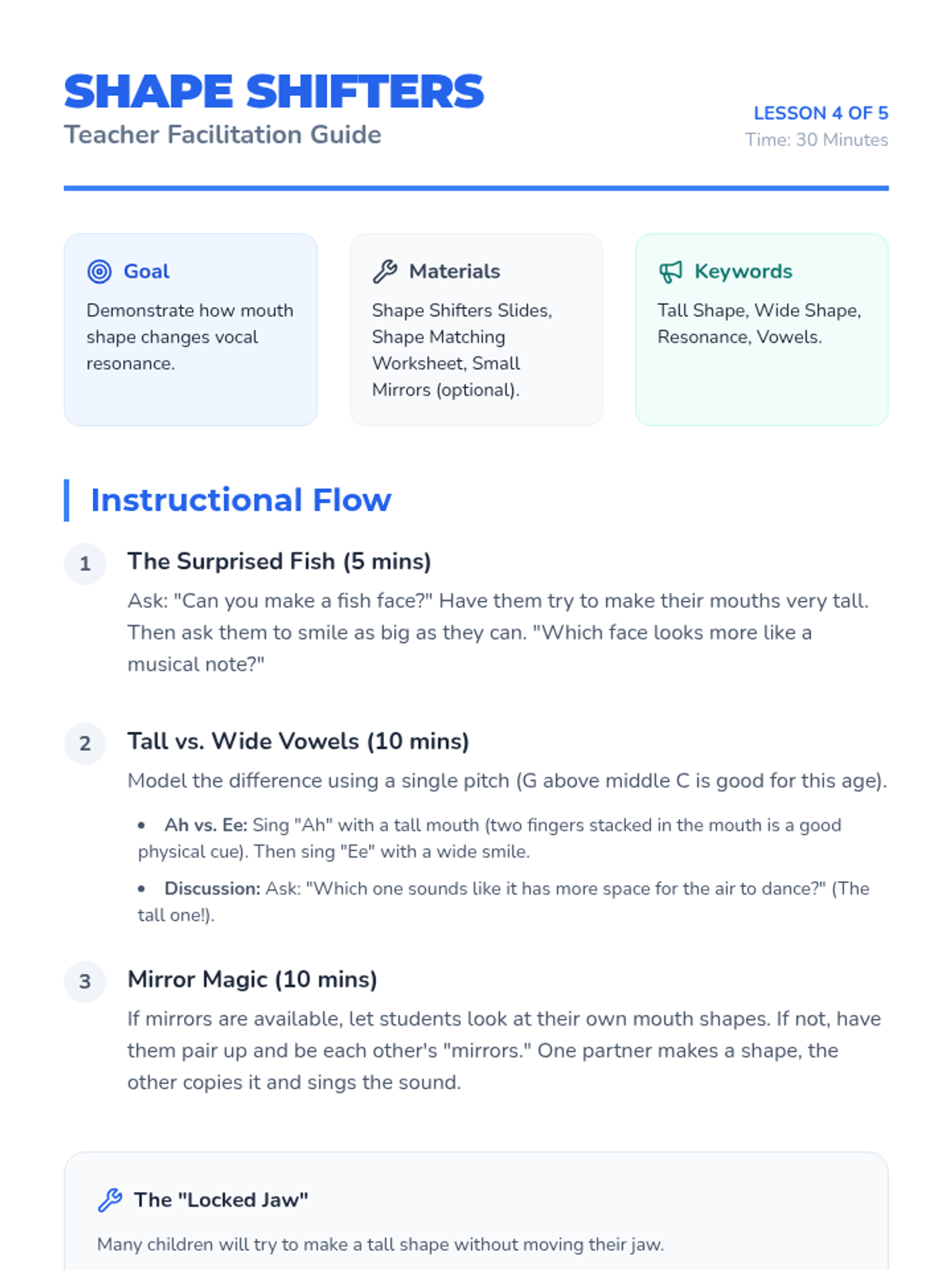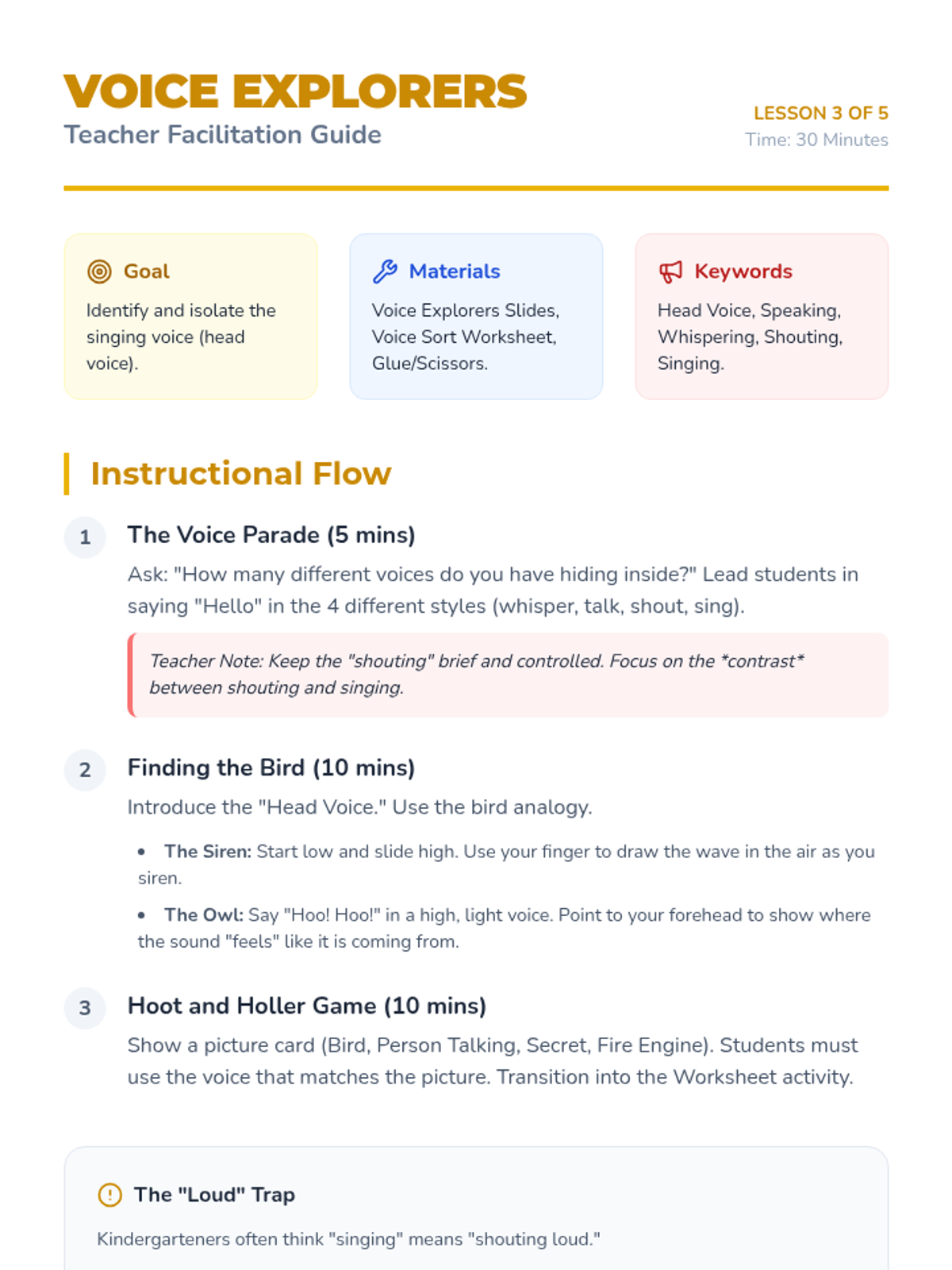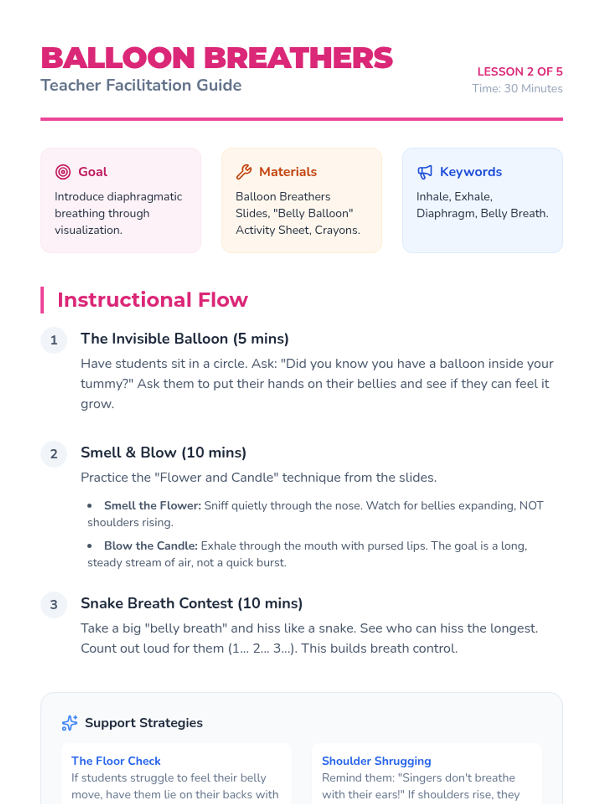 A foundational music sequence for Kindergarteners exploring how posture, breath, and body awareness create the perfect instrument for singing. Students move from establishing a "Singer's Stance" to mastering breath control and vocal resonance through playful workshops.
